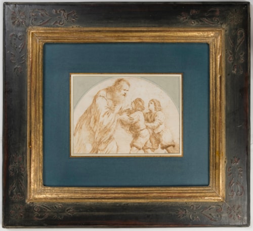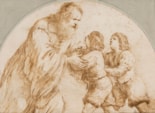 The subject here depicted is probably from the Old Testament. While it has been tentatively suggested that this drawing may represent the return of the prodigal son, the two boys appear to be too young to fit the Biblical parable. A more likely subject for our drawing, as well as those in Windsor and Chatsworth and the lost Denon sheet, would be Jacob blessing the sons of Joseph, as David Stone has recently suggested. An important episode from Hebrew scripture, the patriarchal blessing of Jacob, who was given the name Israel by God, is told in the Book of Genesis: