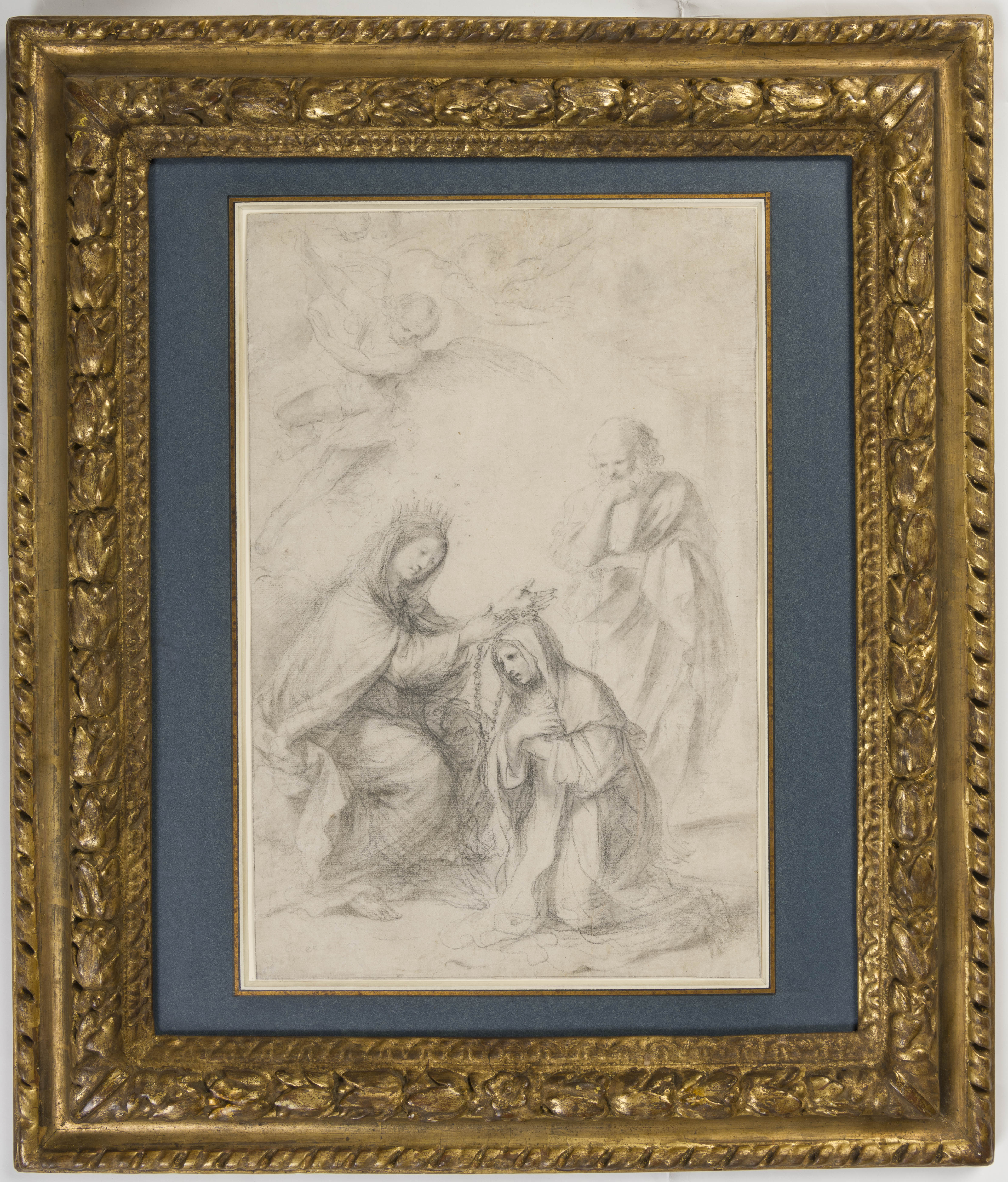 This fine compositional drawing in matita nera is a study for Guercino’s late altarpiece of The Vision of Saint Teresa of Ávila (or Saint Teresa Receiving a Necklace from the Virgin in the Presence of Saint Joseph), painted for the convent church of San Gabriele delle Monache Carmelitane Scalze in Bologna. Guercino began working on the painting in 1660 and received payment of 800 Bolognese lire for the altarpiece on 21 March 1661. The painting remained in the church of San Gabriele until 1811, when it was transferred to the Pinacoteca di Brera in Milan. Exhibited there between 1811 and 1965, the painting has since been returned on loan to the Carmelite convent in Bologna.