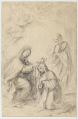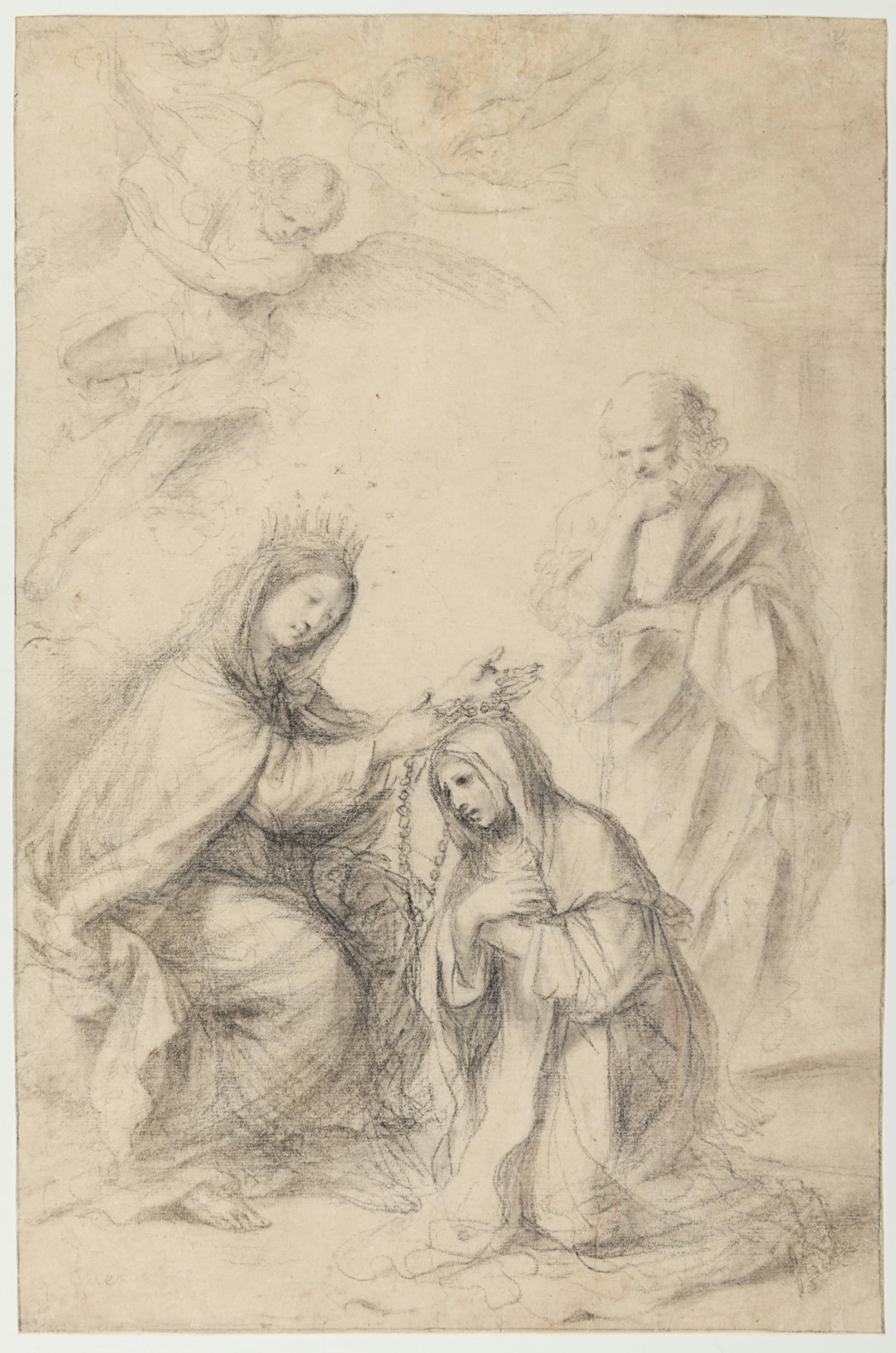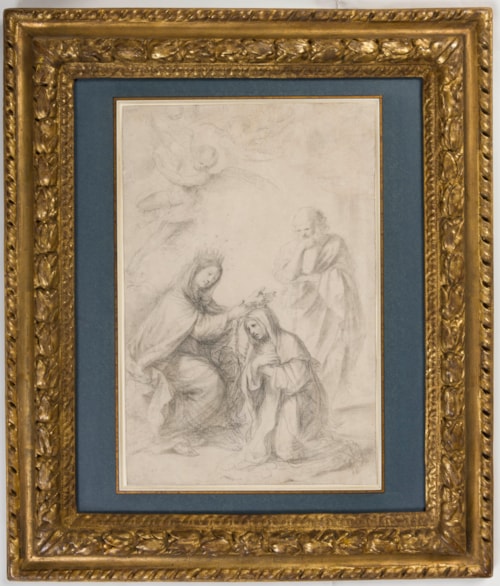 This fine compositional drawing in matita nera is a study for Guercino’s late altarpiece of The Vision of Saint Teresa of Ávila (or Saint Teresa Receiving a Necklace from the Virgin in the Presence of Saint Joseph), painted for the convent church of San Gabriele delle Monache Carmelitane Scalze in Bologna. Guercino began working on the painting in 1660 and received payment of 800 Bolognese lire for the altarpiece on 21 March 1661. The painting remained in the church of San Gabriele until 1811, when it was transferred to the Pinacoteca di Brera in Milan. Exhibited there between 1811 and 1965, the painting has since been returned on loan to the Carmelite convent in Bologna.