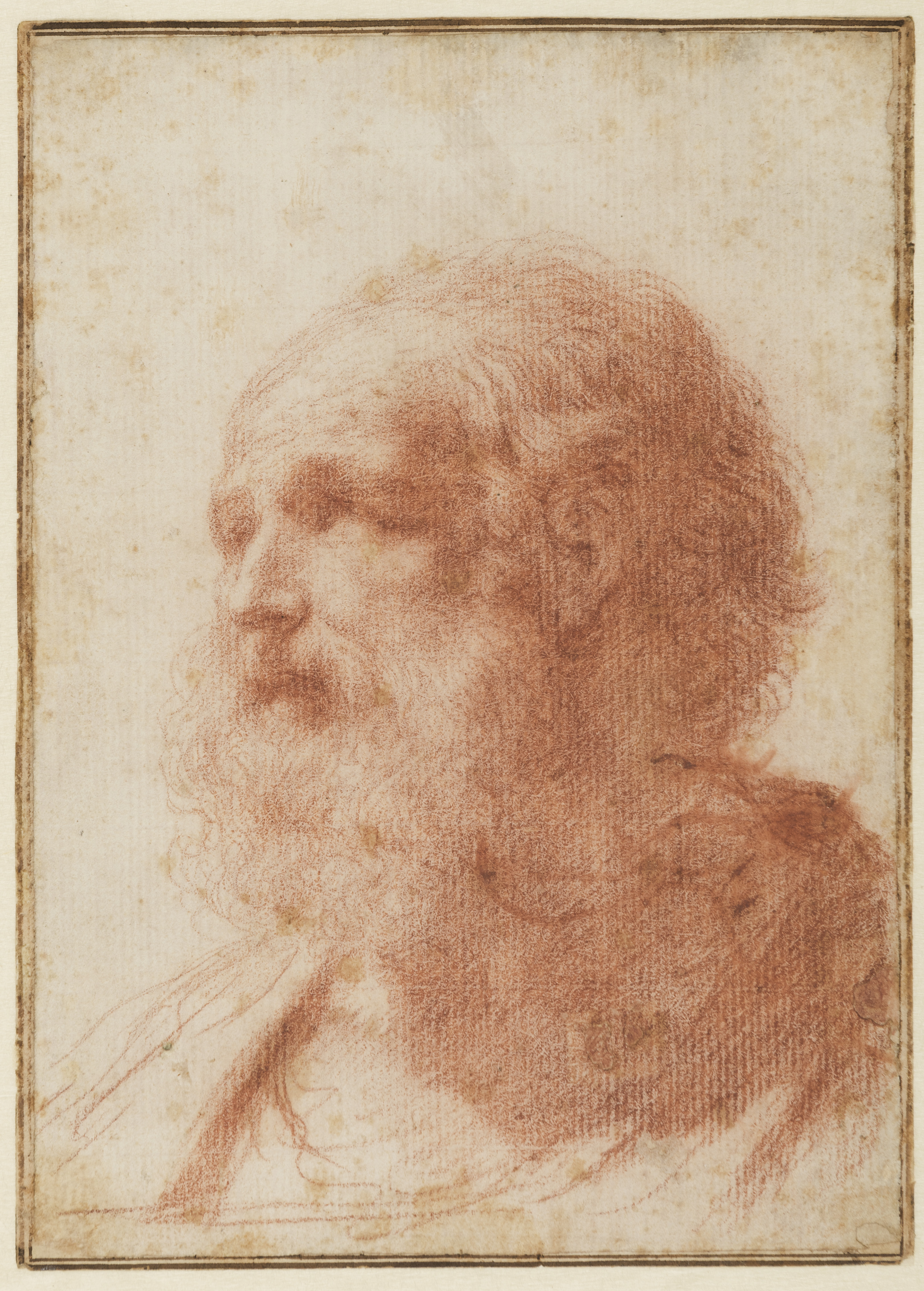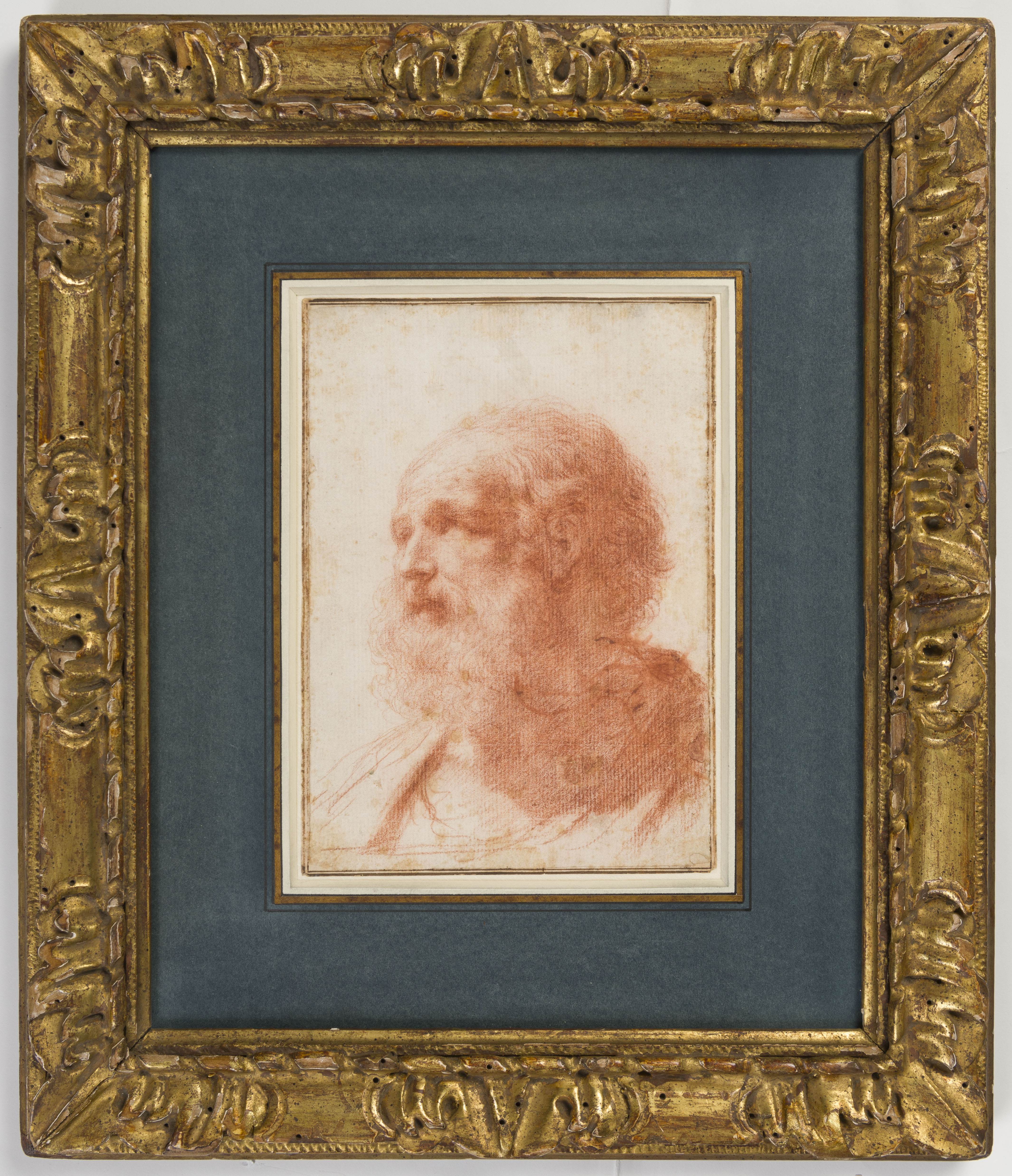 Both David Stone and Nicholas Turner have suggested that the present sheet should be dated, on stylistic grounds, to the late 1650s or the first half of the 1660s, towards the end of Guercino’s career. The hint of a framing line in red chalk at the bottom of the composition might suggest that this drawing was intended to study a bust-length painting of the head of a saint, most likely Saint Joseph. Indeed, the head in the present sheet is close to that in a late painting of Saint Joseph of c.1659-1660, recently on the art market, which was one of several half- or three-quarter length paintings of saints commissioned from Guercino between 1659 and 1662 by the textile merchant Francesco Magnanoni of Rimini.