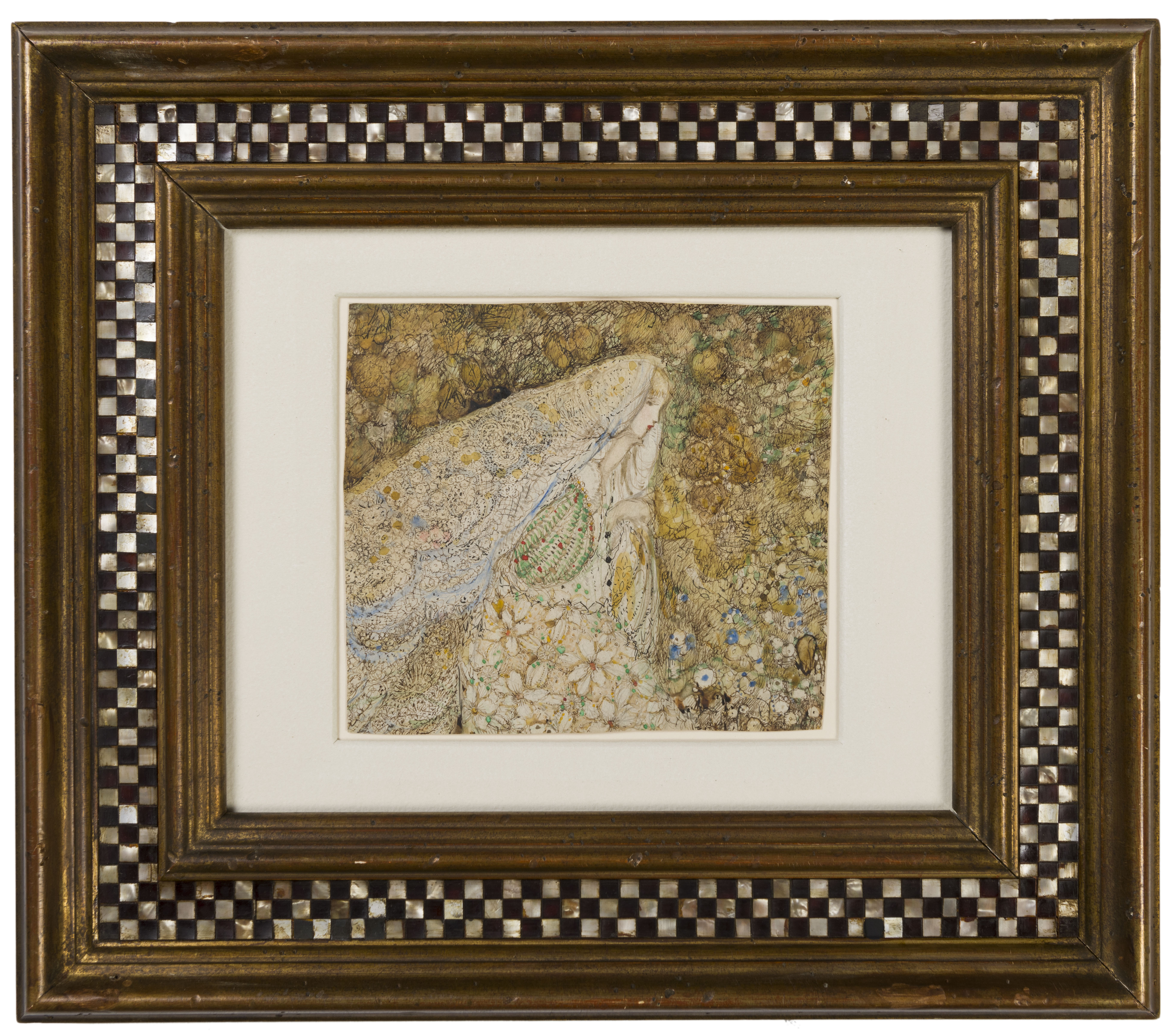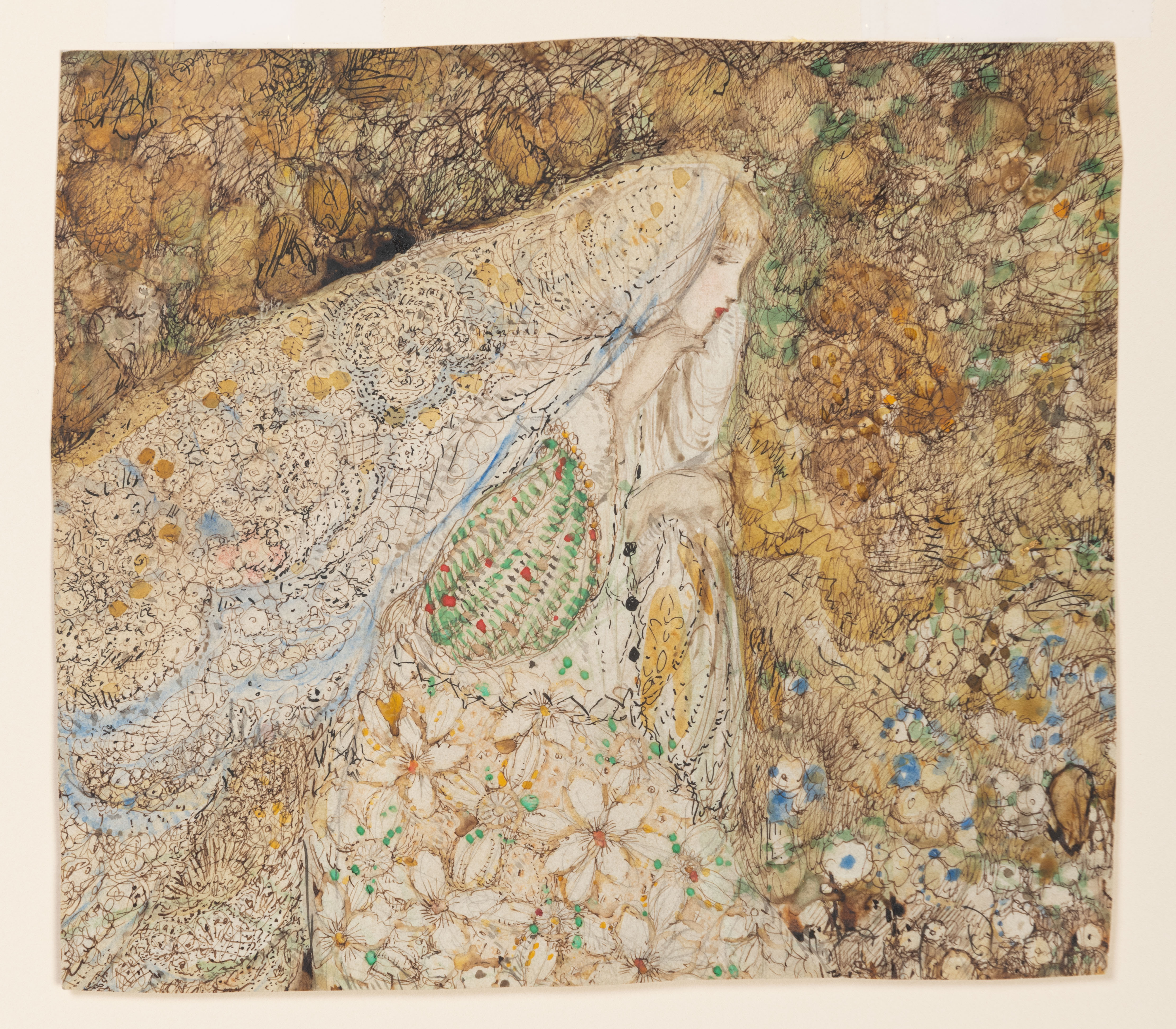 Encouraged in her artistic ambitions by her parents, Annie French was trained at the Glasgow School of Art and was active as an illustrator in the first quarter of the 20th Century. She produced children’s book illustrations, designs for greeting cards - for which she was perhaps best known in her lifetime - and independent compositions in watercolour on vellum. Her work was often on a small scale and was drawn in an elaborate Art Nouveau style that displays the particular influence of the work of Aubrey Beardsley. As was already noted of French’s draughtsmanship in an early appraisal of her work, published in The Studio magazine in 1905, ‘It will be noticed in these drawings that, in place of the strength and the variety of the Beardsley line, in exchange for the expressiveness with which genius informed it, we have an exquisite pattern woven from a fanciful usage of the dots and lines his method suggested. The drawings are much more to Miss French’s credit than any imitation of the qualities of the Beardsley line; as it is, they are not an imitation, but a device, charming, original, and dainty. One motif from Beardsley’s work has been retained, rearranged, and used for the sake of itself, combined with many qualities that entirely are Miss French’s own.’