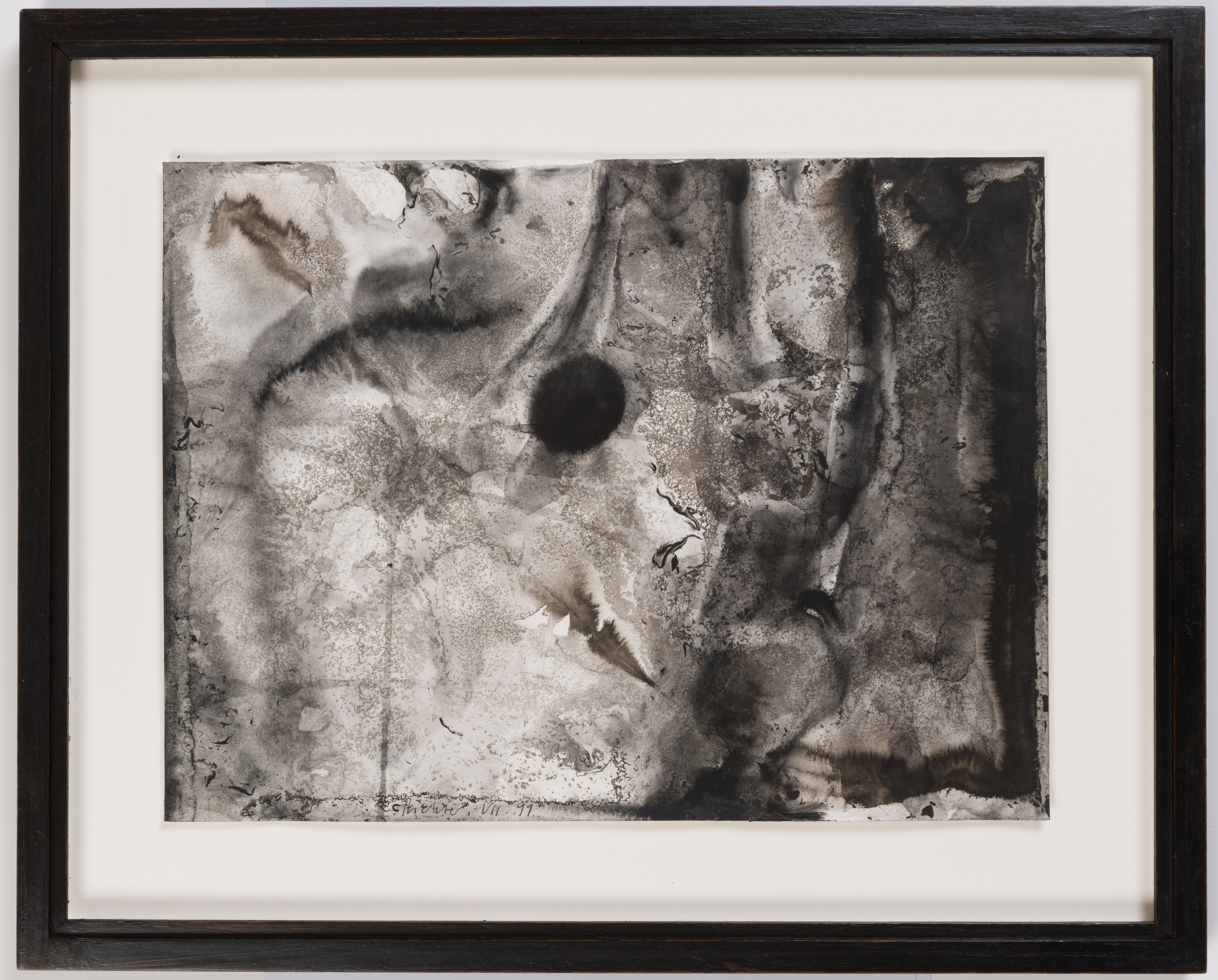 The present sheet is part of a small and distinctive group of twenty-four abstract compositions on paper, drawn in a rich black India ink, produced by Gerhard Richter in late June and July of 1991. (Twelve of the drawings, including the present sheet, were exhibited alongside recent works on paper by Richard Long and Lawrence Weiner at the Anthony d’Offay Gallery in London in 1992.) As Barbara Steffen has noted of this series of ink drawings by Richter, ‘These works are concerned with the observation of dripping black ink, its various layers, and the splashes that form a path across the picture plane following the principles of chance. They are about highly differentiated techniques of glazing, of allowing the ink to run, and of abstractly shaping the sheet. Attention is focused on the material – india ink – and on the fact that everything can be glazed in black to produce a plexus that consists entirely of uncontrolled forms of abstract shapes. By producing a drawing of black india ink in a manner that recalls a black watercolor, Richter dissolves the boundary between the categories of drawing and watercolor. India ink is made from extremely fine lampblack and a binding agent such as gelatin or glue. After this mixture has dried and solidified, it is mixed with water for use. Richter dispenses with the historical approach to india ink and uses it precisely as lightly as he uses watercolors in his abstract paintings. By producing works of glazed india ink that look like casual watercolors, he takes aim at the classical use of india ink.’