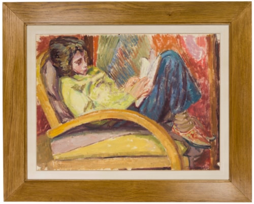 As children, the four Garnett sisters all spent time at Charleston, and sat for paintings and drawings by both Bell and Grant. As Grant’s biographer has written, ‘Still more welcome at Charleston were the grandchildren. Duncan shared Vanessa’s delight in their different characters and unexpected behaviour…They were no trouble to look after, as they spent much of the day reading and were often taken for a walk by Clive [Bell] after tea. Later on it pleased Duncan that one of the twins, Nerissa, showed a talent for painting.’ The present sheet is a portrait of Nerissa Garnett (1946-2004), who would grow up to be a painter, photographer and ceramicist after studying at the Slade School of Fine Art in London, and was drawn sometime in the late 1950s or early 1960s. (It was at around this time that the sitter’s mother noted that the fourteen-year old twins Fanny and Nerissa ‘take eight-and-a-half shoes, and will be terrifying young women if they continue to practise judo.’) Nerissa is here depicted sitting on a 1930s bentwood chair in Grant’s studio; the chair, one of two purchased by Virginia Woolf from the furniture store Heal’s in London and given by her to her sister Vanessa Bell, remains at Charleston today.
