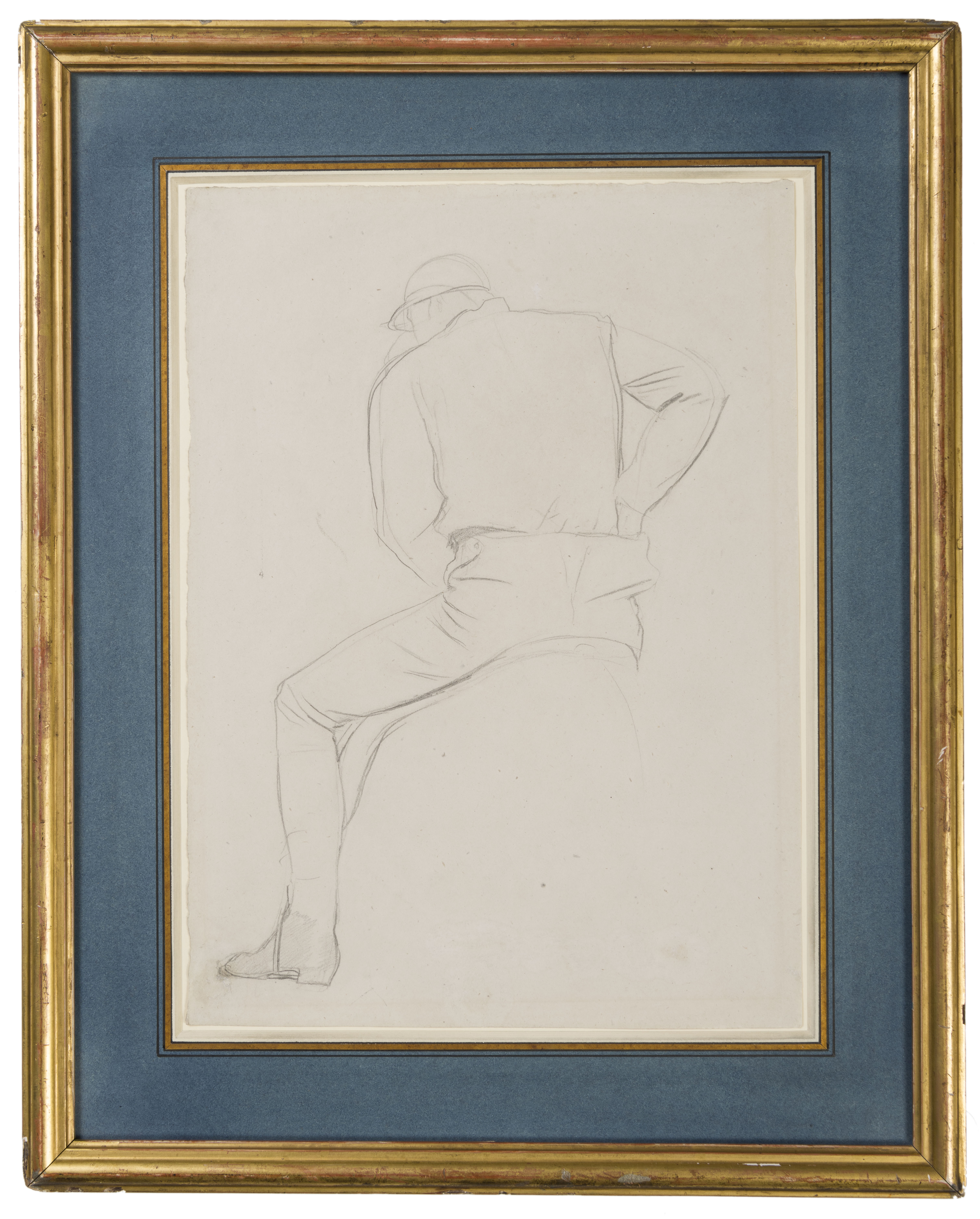 In keeping with most of his drawings and paintings of racing subjects, which depict the moments before or after a race, Degas has here concentrated on the relaxed pose of the seated jockey and the way in which he sits on the unseen horse beneath him, capturing something of the synergy between horse and rider. Among comparable drawings is a pencil study of a seated jockey seen from behind and turning to the left, of identical dimensions and technique, which was sold in the fourth and final vente Degas in July 1919 and was in an American private collection in 1973.