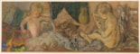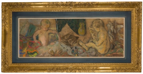 As Antoine Salomon and Guy Cogeval note, ‘The first mention of a commission for a decorative frieze from Émile Lévy appears in the artist’s journal for 5 February 1915: ‘at Émile Lévy’s[,], question [of] decorative art[,] asks me again [for a] small panel.’…The subject was a most unusual one for Vuillard: two babies playing, surrounded by tapestry-works, statuettes and a jug of anemones. The painter was once again influenced by eighteenth-century overdoors depicting putti at play surrounded by plant motifs. Boucher painted several works of this kind, as did Le Moyne…This astonishing, horizontal panel is certainly one of those which posed the greatest difficulties for Vuillard and…fills page after page of his Journal. It was the range of colours that have him the most trouble; he began, therefore, with a grisaille of monochrome greys, returning to it time and time and again and struggling to define an overall harmony for several weeks…The ‘finished’ panel was delivered on 18 September 1915, but Vuillard went on touching it up until the sudden death of his patron on 26 January 1916. Some time after this, Dr. Widmer…offered to acquire the panel for 500 francs. Vuillard accepted his offer but continued touching it up until April 1916, at which time it entered Dr. Widmer’s collection in Switzerland.’ The Lévy-Widmer painting can be seen on the easel in a photograph taken by Vuillard of his studio on the Rue de Calais in Paris in c.1916.