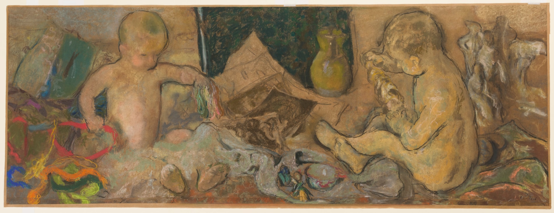 This large pastel is a preparatory study for the composition of a pair of oil paintings by Vuillard of c.1915, formerly with Wildenstein in New York and later in a private collection. The two paintings - which may at one time have made up one single work - each depict half of the composition of the present pastel. Together they make up a decorative frieze-like painting, of nearly identical dimensions to the present sheet, showing the complete arrangement of two children at play among the papers and materials of the artist’s studio. As the composition of the painting has been described, ‘A fair-haired and a dark-haired child seated facing one another, playing, the one on the left with brightly coloured threads of tapestry, the other with modelling clay. In the right half the colours are bright and the child is rendered in pink flesh-tones; in the left half, the colours are more subdued and the child’s flesh is rendered in a cold half-tone. To the right of centre is a jug of anemones on the green ground of a portfolio; on the far right, a group of statuettes.’ Vuillard’s painting shows several differences with the present sheet, however. For example, the empty vase in the centre of the composition is filled with flowers in the painting, while the child at the right has more hair than in the pastel than in the painting.
