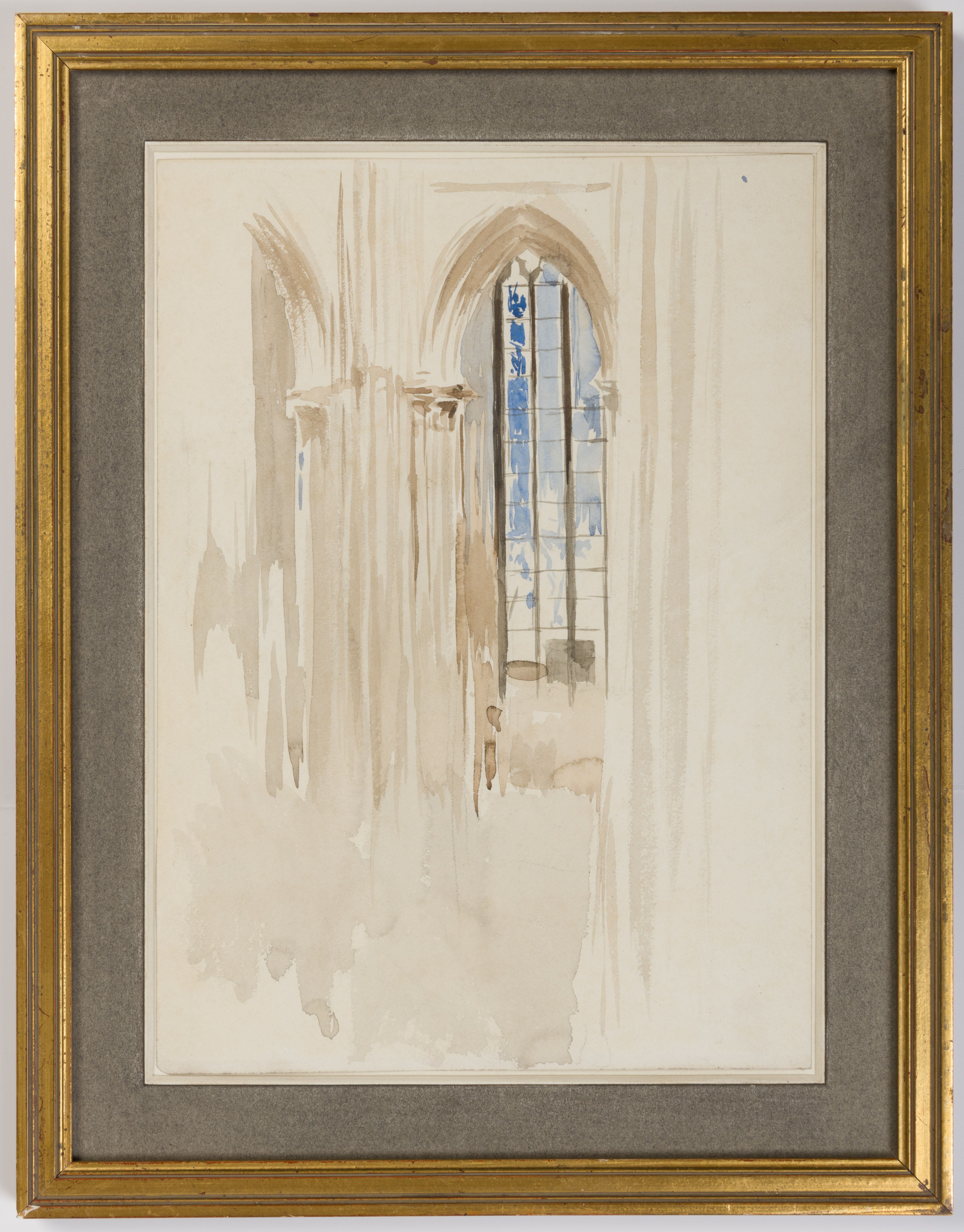 Two further watercolour views of the interior and stained glass of the cathedral of Amiens are in private collections, while a large black chalk drawing of the side aisle of the cathedral nave was exhibited at a gallery in Bologna in 1999. Boldini also drew a large watercolour of the porch of the 15th century church of Saint-Germain-l’Écossais at Amiens. Among other stylistically comparable watercolours is a large study of a stained glass window in the collection of the Museo Boldini in Ferrara and a similar work, signed and dated 1905, in a private collection.