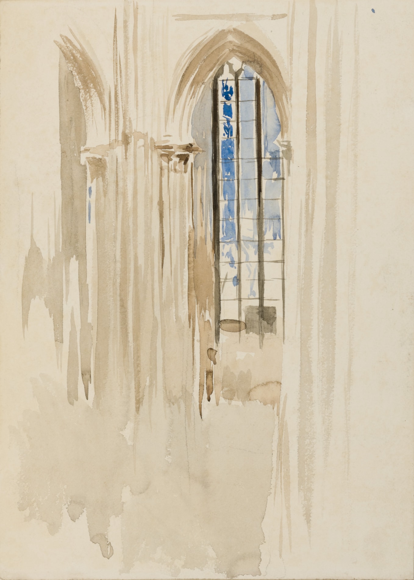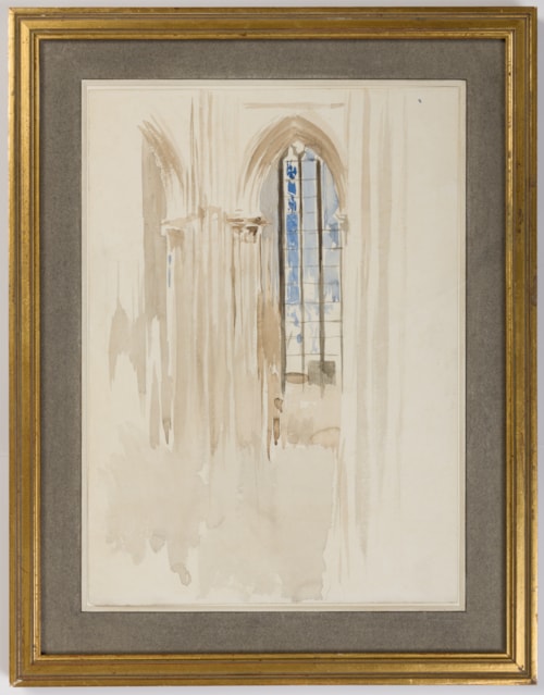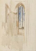 Two further watercolour views of the interior and stained glass of the cathedral of Amiens are in private collections, while a large black chalk drawing of the side aisle of the cathedral nave was exhibited at a gallery in Bologna in 1999. Boldini also drew a large watercolour of the porch of the 15th century church of Saint-Germain-l’Écossais at Amiens. Among other stylistically comparable watercolours is a large study of a stained glass window in the collection of the Museo Boldini in Ferrara and a similar work, signed and dated 1905, in a private collection.