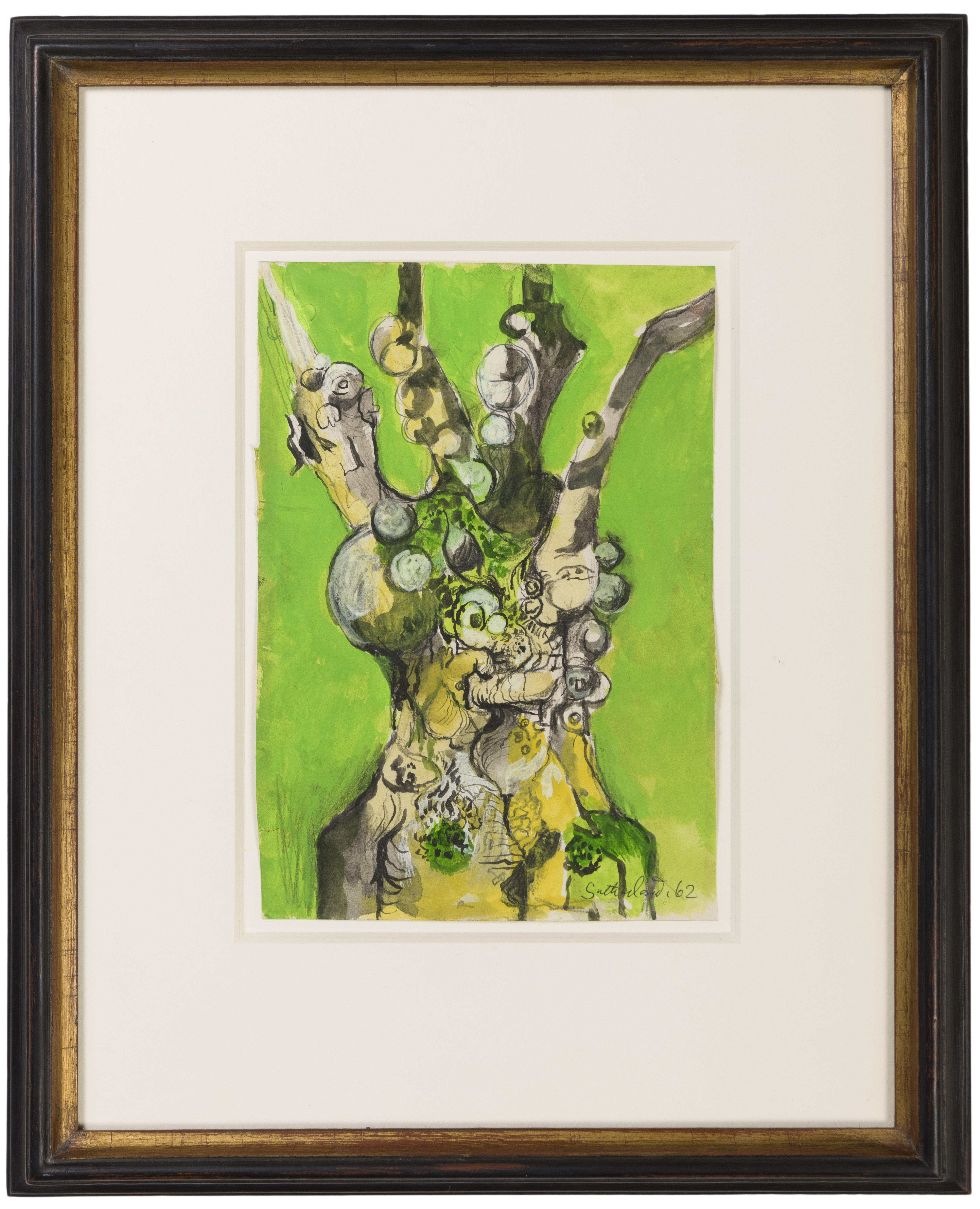 Drawn in 1962, the present sheet is a fine example of Graham Sutherland's studies after nature, which often take on a visionary quality that links them to the work of such earlier English artists as Samuel Palmer. As one scholar has noted, ‘Sutherland’s method of working is a lengthy, painstaking and conscientious process. In his nature painting, he begins by making sketches from objects which catch his eye – objects with curious, sometimes rather alarming shapes. From these accurate drawings he proceeds to variations, to create a new pictorial reality which becomes the visual equivalent of his own feelings and emotions. After a number of intermediary sketches in watercolour and gouache, he finally decides on the definitive version to be translated into oil…It is above all in his free translation of nature-forms that Sutherland’s work is imbued with a disturbing visionary quality, similar to that found in…the mysterious forest landscapes and tortured scared figures in northern art of the sixteenth century. It is, indeed, this strong northern, emotional quality, fraught with mystery, which makes people see Sutherland’s work as a continuation of the English romantic tradition.’