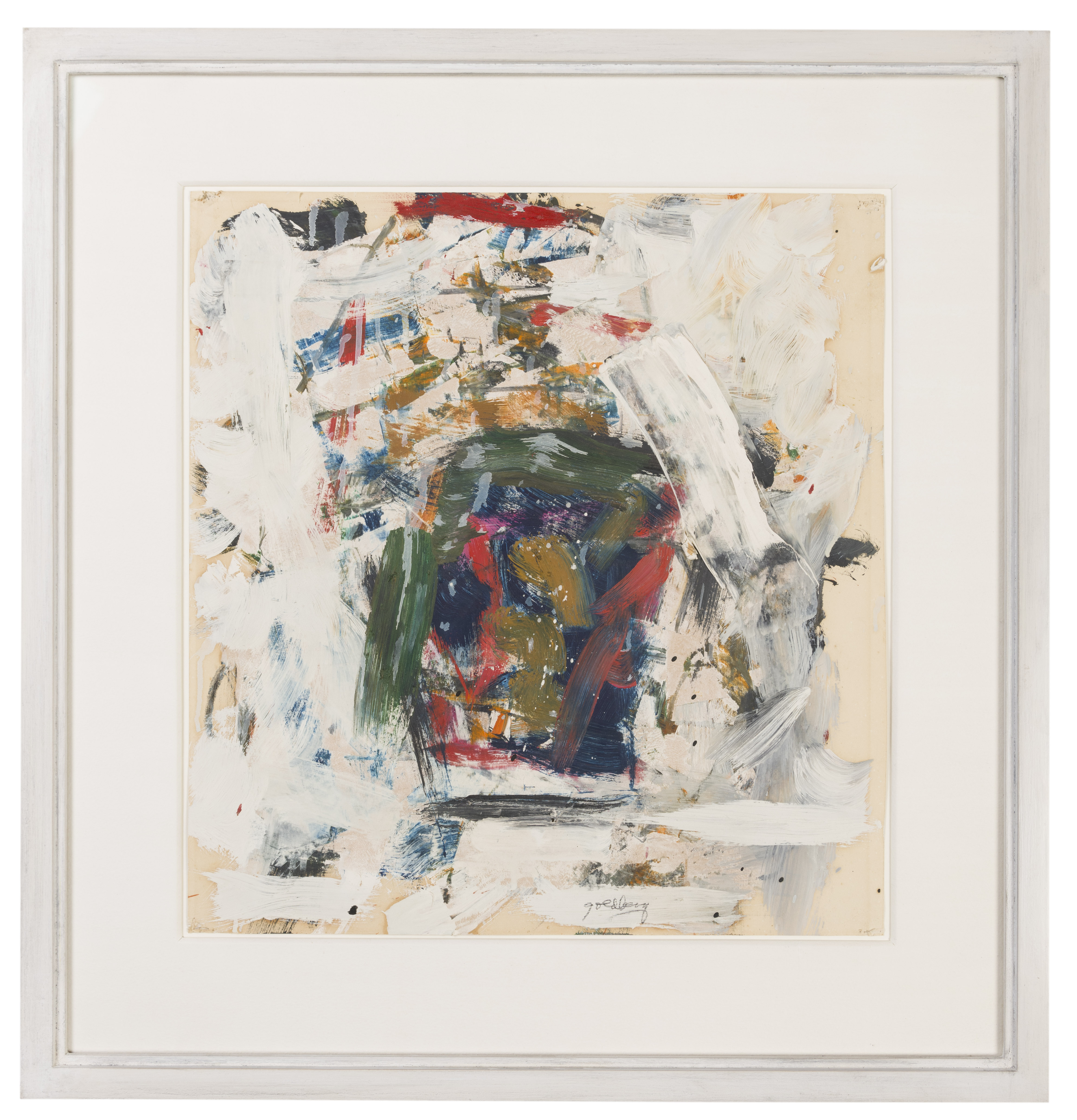 From an early age Goldberg was an aficionado of New York’s jazz scene, and this lifelong passion for jazz music found its way into much of his art and the way he composed his pictures. Among his friends was the poet and museum curator Frank O’Hara, who dedicated several poems to the artist, and in 1960 the two collaborated on Odes, a book of poems and prints. In 1962 he took over Mark Rothko’s studio on the Bowery, on the Lower East Side of Manhattan. Both he and his wife, the artist Lynn Umlauf, taught at the School of Visual Arts in New York, and in the 1980s the couple began spending part of each year living in Tuscany. Goldberg never abandoned the manner of powerful, gestural painting, noting in a 2001 interview that, ‘For me, the concept of abstract painting is still the primary visual challenge of our time. It might get harder and harder to make an abstract image that’s believable, but I think that just makes the challenge greater.’