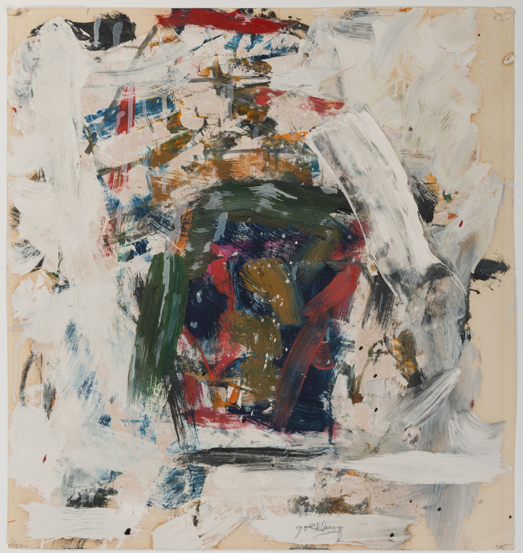 Painted in 1958, this sizeable sheet may be related to Summer House, a large canvas of the same year that was one of the first works by Michael Goldberg to enter a museum collection, when it was acquired, shortly after it was painted, by the Albright Art Gallery (later the Albright-Knox Art Gallery and today the AKG Art Museum) in Buffalo, New York. In 1959, when the newly purchased painting was exhibited at the museum, alongside recently acquired abstract works by Ad Reinhardt, Hans Hartung, Pierre Soulages and others, Time magazine noted that ‘Under the guidance of Director Gordon Smith, the Albright is energetically pursuing a policy of buying the quick instead of the dead, the controversial instead of the safe. If, as seems likely, abstract expressionism establishes itself as the most vital painting of the period, the Albright will become a No.1 center for serious students of the age and its art.’3, adding that ‘Michael Goldberg’s Summer House looks more like a frost-adorned window in the dead of a winter night, reflecting firelight against the dark outside.’