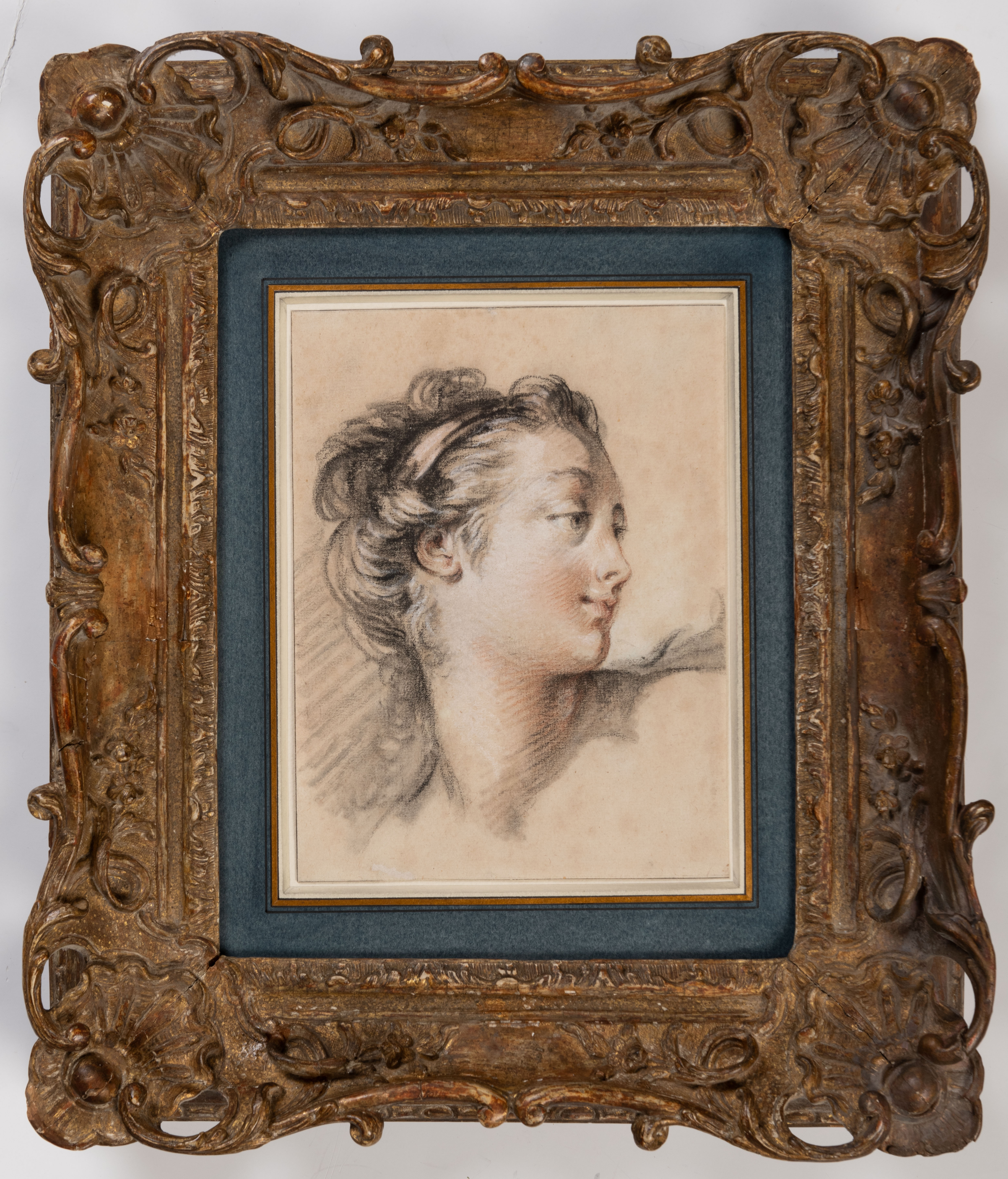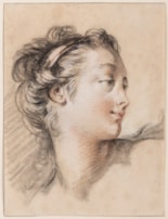 As one scholar has noted, ‘Perhaps more than any other artist of his day, Boucher strove to create an ideal of feminine grace and charm, and if a tête de femme or tête de jeune fille was based on an actual model, it quickly became a generalized type in which all individual features were abandoned, and whose sole function was to please the eye of the beholder...They are not portraits, nor do they show any suggestion of sensuality; their only aim is to express a loveliness which is sometimes merely pretty, but at other times verges on the austere.’ Of such late drawings as the present sheet, the Boucher scholar Françoise Joulie has written that ‘Around 1765, François Boucher...drew women’s faces of a new elegance and serenity; more ‘noble’ than ‘coquettish’...they are easily recognisable by the width of their foreheads, their large eyes under perfectly arched eyebrows and their elegantly curled hair held in place by a ribbon. The mouth is larger, the face has lost its mischievous aspect and exudes a great deal of gentleness.’ Among comparable late drawings by Boucher is a Head of a Young Woman in a private collection.