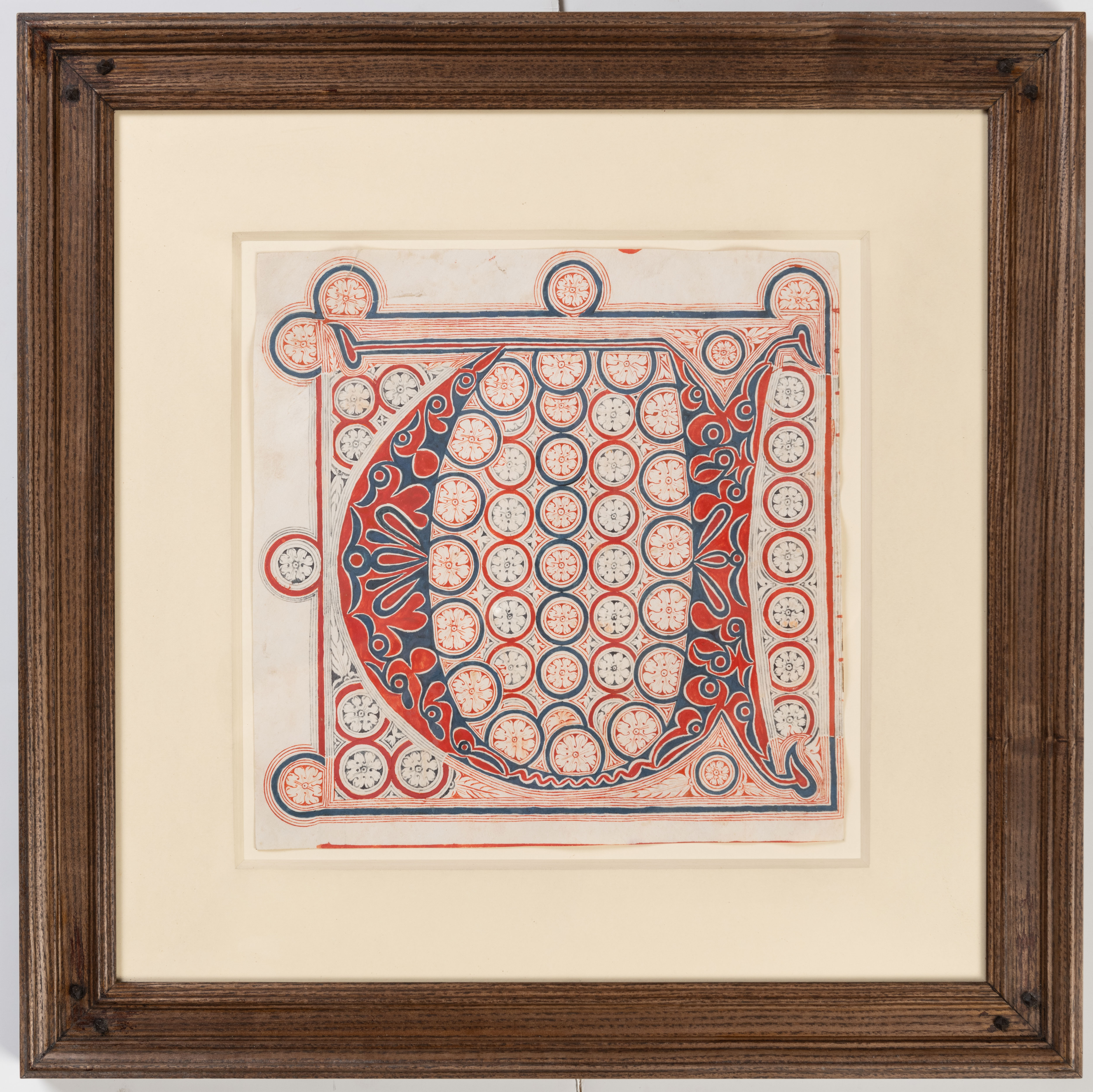 This is one of a group of four matching ornamental initials from a large 16th century Spanish antiphonal manuscript that were offered for sale by Maggs Bros. in London in 1967. This cutting of an initial V, with traces of text and ruling for music, incorporates a foliate pattern in red and blue outlined with white, surrounded by a repeated pattern of circles with flower heads inside them. While the ornament of the present sheet and another from the group, with the initial A, is based entirely on circles, the other two cuttings, with the initials C and S, also incorporated lozenges. Indeed, the initial S adds squares to the design, creating a pattern quite reminiscent of Islamic ornament, which in turn would suggest a possible origin in southern Spain for the parent manuscript.