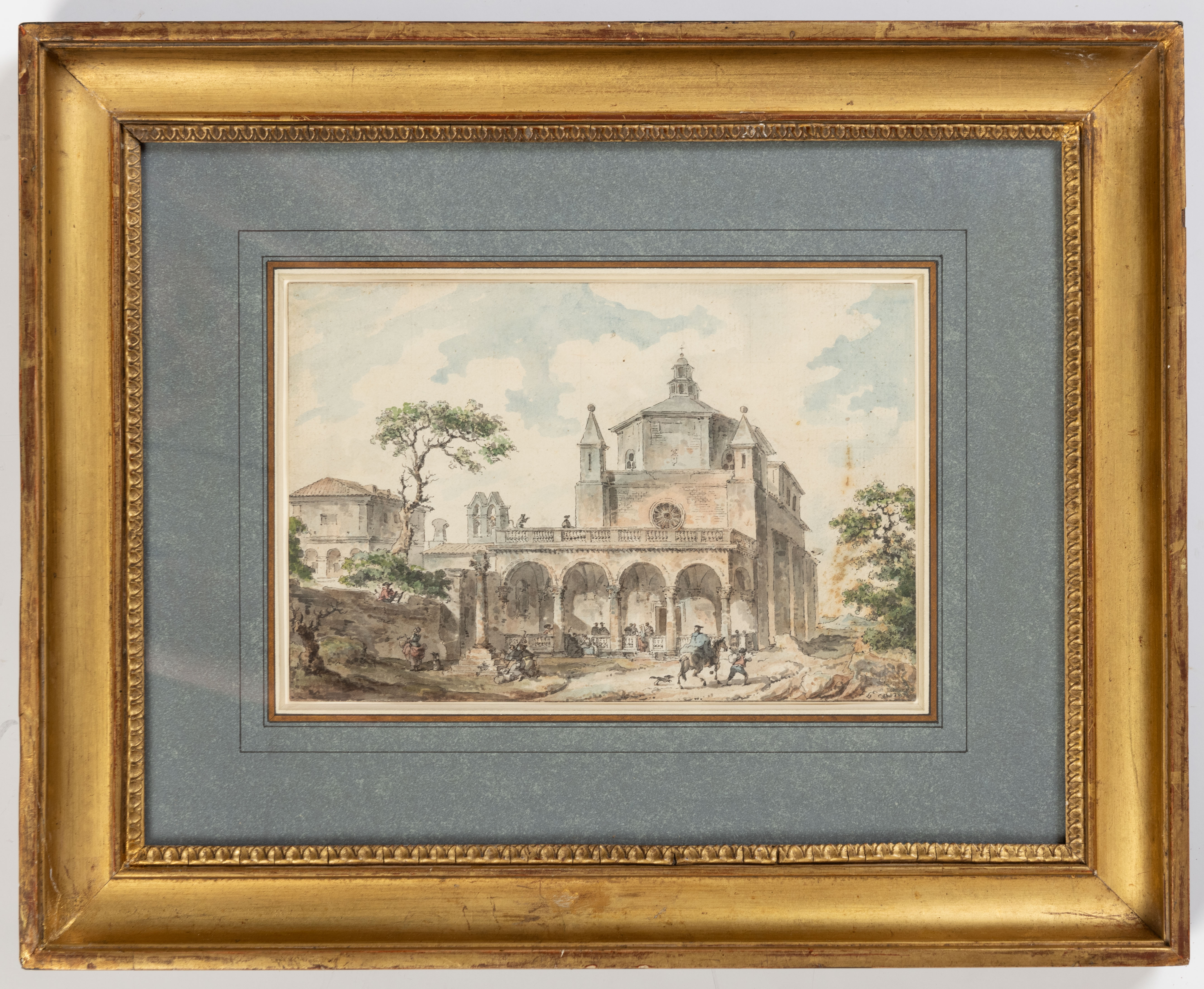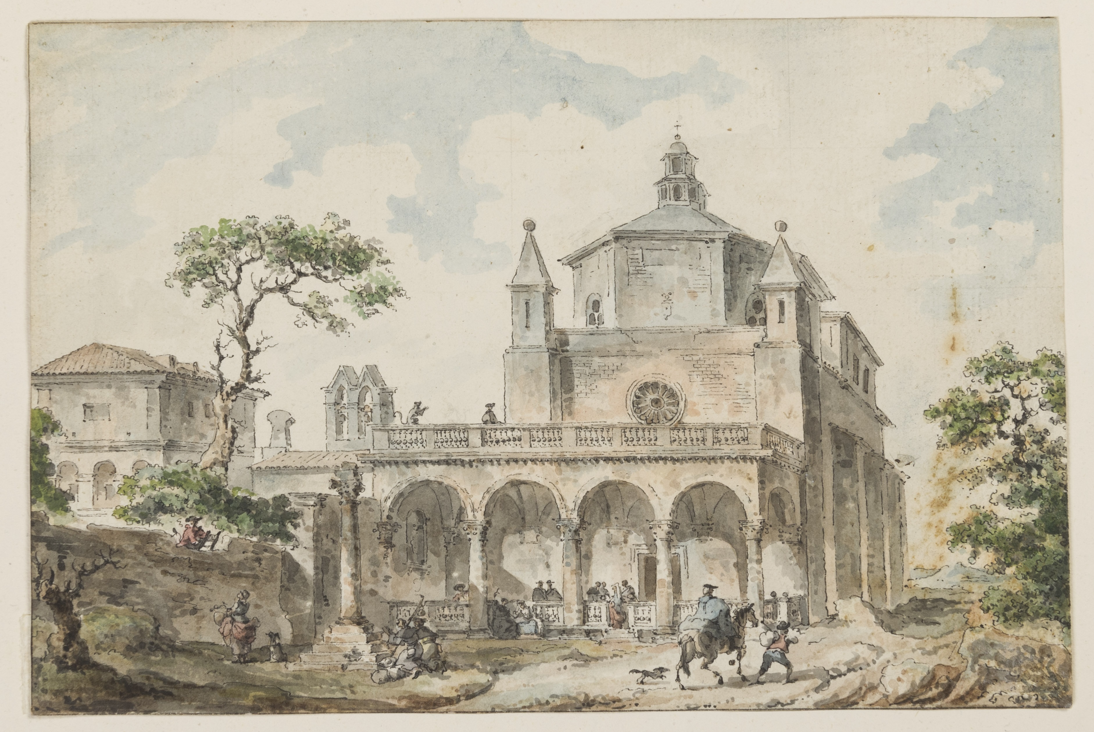 This watercolour depicts the Servite church of the Madonna della Croce just outside the coastal town of Barletta, some sixty-five kilometres northwest of Bari in the southern Italian province of Puglia (Apulia), which in the 18th century was part of the Kingdom of Naples. Guided by Dominique Vivant Denon, who served as secretary and chargé d’affaires at the French embassy in Naples for seven years, the artists of the Saint-Non expedition arrived in Puglia in April 1778. Travelling south along the coastal road towards Brindisi, the party arrived at Barletta on the evening of April 20th. According to Saint-Non’s travel diary, there was relatively little of note in the town, apart from the castle. However, ‘A small church of Our Lady, called the Holy Cross of Barletta, which we came across on our way out of town, was the only place that merited a stop for a single moment. One of our draughtsmen portrayed a small view of it...’ Built between 1516 and 1526, the small, centrally planned church of the Madonna della Croce at Barletta no longer survives, having been damaged by an earthquake in 1721 before being completely destroyed by another earthquake in 1830. Some fragments of the building, as well as the rose window, survive today in the Museo Civico in Barletta.