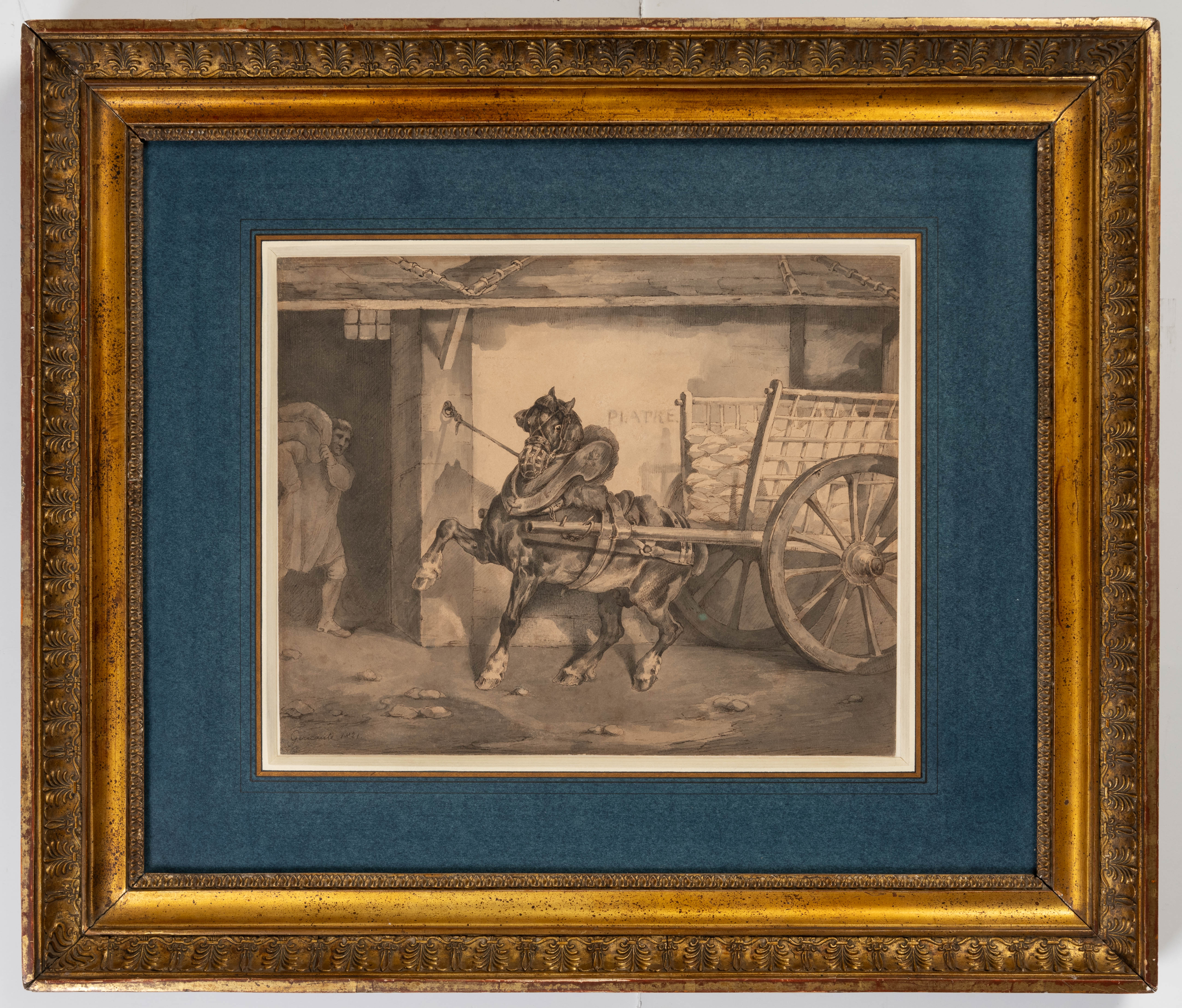 In his catalogue raisonné of the work of Géricault, Germain Bazin describes the present sheet in some detail: ‘The horse is shown tied by a halter to a ring fixed to the wall. It is harnessed to the shafts of a cart with high sides loaded with bags of plaster. He wears a shoulder collar with wide splints decorated with a tuft of wool and on its head are two pompoms. He is attached to the stretchers by the belly band and a back plate, and has a breeching strap. Its tail is docked. This horse must be of a difficult character, as his eyes are bulging and he paws the ground impatiently; he is a biting horse as he wears a muzzle. His coat is black with four irregular socks. The shadow of the horse and cart falls on the wall, the rubble of which can be seen under the plaster which is peeling and which bears the inscription: PLATRE. Above the wall, we can see a roof forming an awning, supported by a bracket. In the shadow of the warehouse, where the glow of a barred window can be seen in the background, a carter wearing a smock carries a bag on his right shoulder that he is about to load onto the cart.’