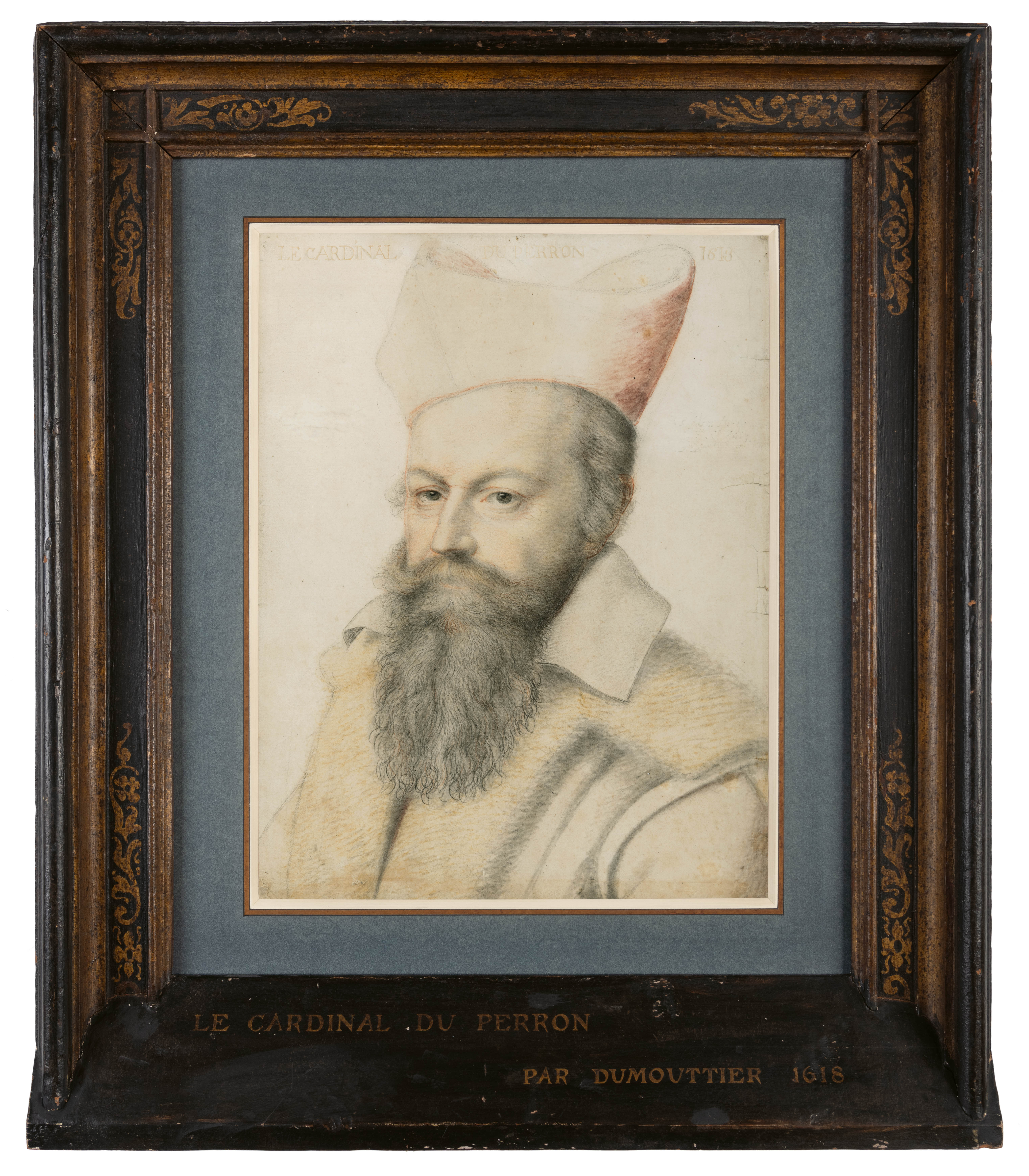 The sitter of this portrait drawing, the French politician and Catholic cardinal Jacques Davy du Perron (1556-1618), was born to a noble family in Saint-Lô in Normandy. The son of a Protestant minister, he was raised and educated in Bern in Switzerland, where his family had fled to escape religious persecution. By 1578, however, du Perron seems to have renounced his Protestant upbringing and had entered royal service at the court of King Henri III, by whom he was appointed lecteur de la chambre du Roy, and also served as a royal scholar of languages, philosophy and mathematics. He took religious orders in the late 1580s, and in 1591 was appointed Bishop of Évreux by the new King Henri IV, whom he instructed in the Catholic faith. In 1604 du Perron was created a cardinal by Pope Clement VIII, and served in Rome between 1605 and 1607, participating in two papal conclaves in quick succession and serving as cardinal priest of the church of Sant’Agnese in Agone. Du Perron sent many letters to Henri IV reporting on events at the papal court, and acted for the King as a mediator between the Republic of Venice and Pope Paul V. In 1606 the King named him Archbishop of Sens, although he did not take up the position until October 1608, a year after he had left Rome and returned to France. Du Perron died in 1618, at the age of sixty-three.
