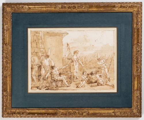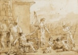 Soon after Giambattista Tiepolo’s sudden death in Madrid in 1770, Domenico returned to his native Venice, where he enjoyed much success as a decorative painter. He continued to expound the grand manner of history painting established by his father - the ‘Tiepolo style’, as it were – and by 1780 his reputation was such that he was named president of the Accademia di Belle Arti in Venice. Within a few years, however, he seems to have largely abandoned painting. In his sixties and living effectively in retirement at the Tiepolo family villa at Zianigo, on the Venetian mainland, he produced a large number of pen and wash drawings that are a testament to his inexhaustible gift for compositional invention.