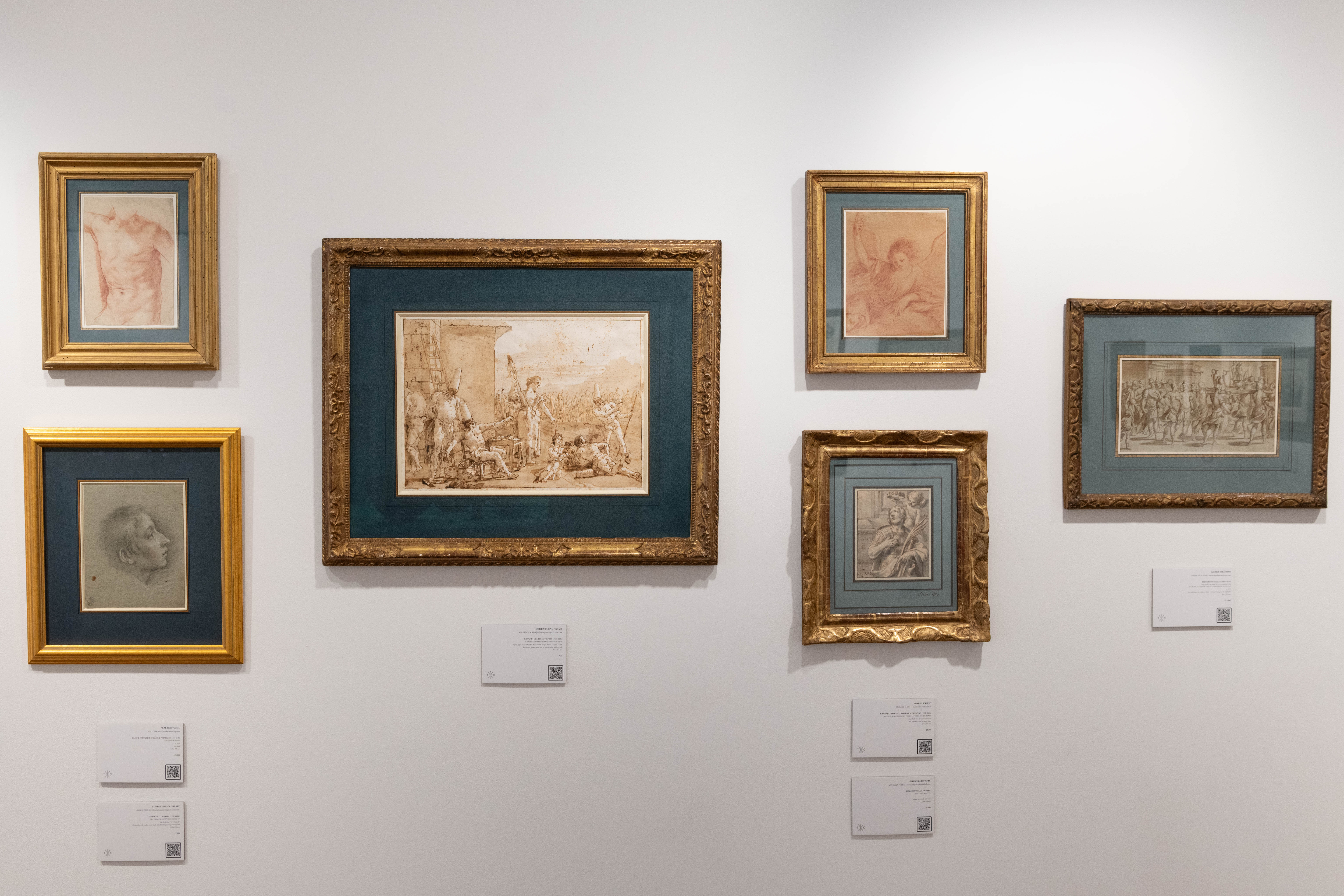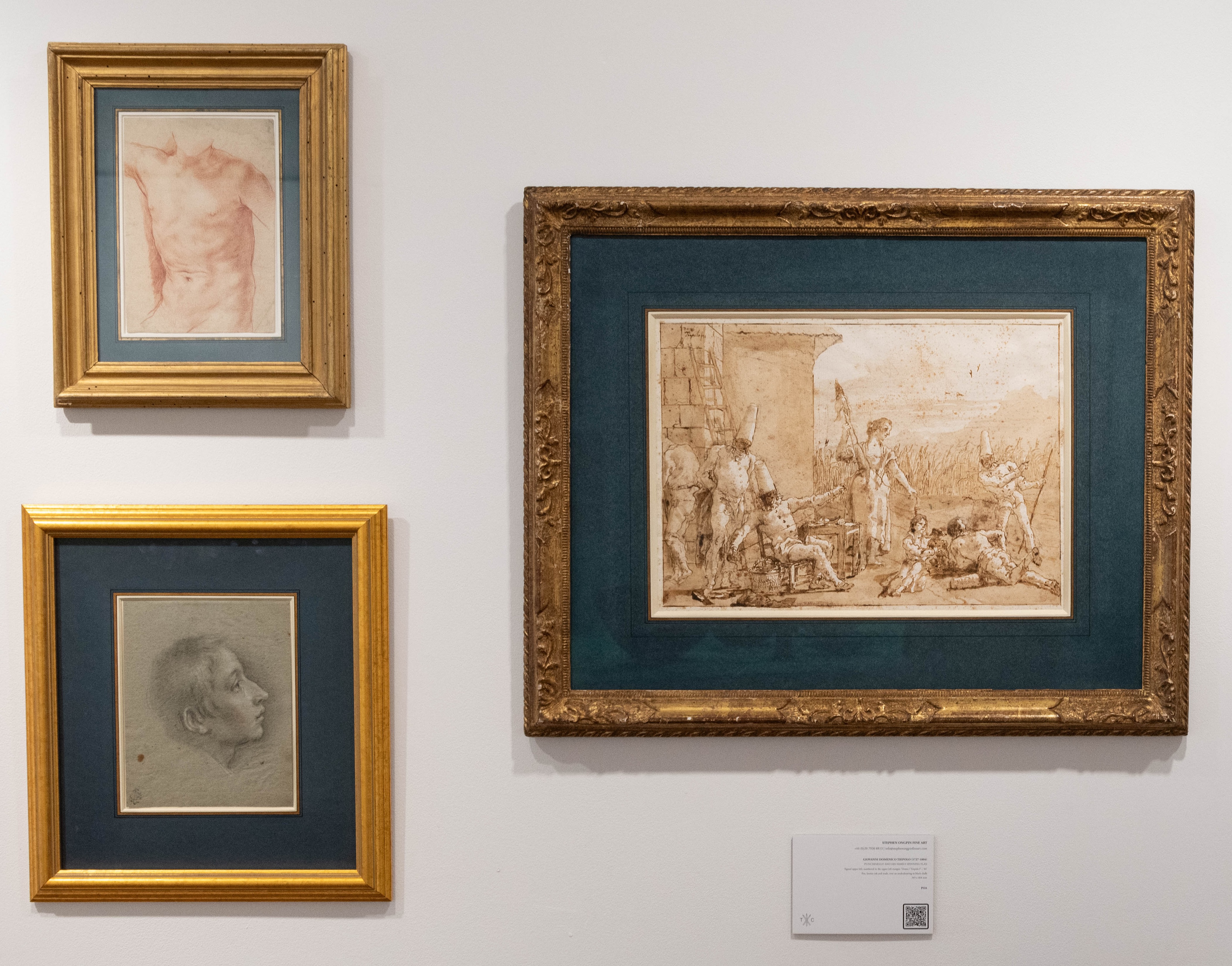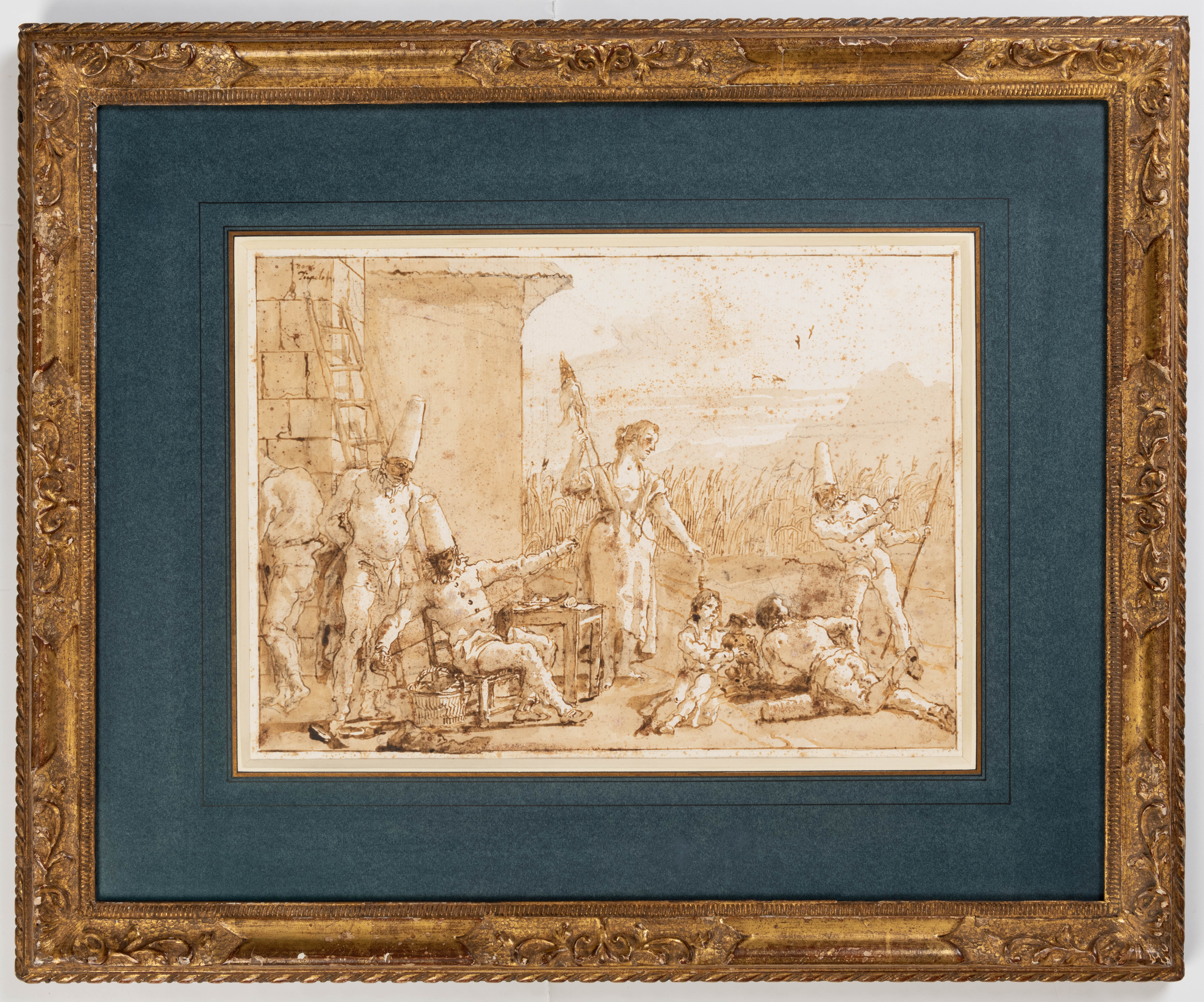 Punchinello and his Family Spinning Flax was part of a group of fourteen Punchinello drawings acquired in 1936 and 1937, when he was in his twenties, by the art historian and collector Brinsley Ford (1908-1999). As Ford later recalled many years later, writing at the age of eighty-nine, ‘In the latter part of 1936, and early in 1937, I was fortunate to buy fourteen, from the famous set of 104 Punchinello drawings. Four I bought from Count Alessandro Contini in Florence for £400, and ten from the Matthiesen Gallery at £70 each. In 1954 I sold two for £670, and the remaining twelve form the principal feature on the walls of our small library…I cannot leave this major addition to the collection without giving some idea of the delight that these drawings have given me…The most remarkable features of this series are the extraordinary fertility of Domenico’s imagination and invention in scenes which range from riotous gaiety to the squalid and macabre, from the joys of childhood to the sufferings of old age, from realism to flights of fancy…What is also so memorable about the drawings is the brilliance and diversity of the compositions, for which the distorted shapes of the Punchinellos, with their sugar-loaf hats, lend themselves admirably…Domenico’s handling of washes is little short of magical, for he uses it to cast a golden glow across the page, and not infrequently he enriches the composition by introducing a diagonal line which demarcates an area in a darker tone, and this makes a perfect foil to the whiteness of Punchinello’s clothes.’ All twelve of the Punchinello drawings from the Brinsley Ford collection, including the present sheet, were exhibited together at the Palazzo Ducale in Venice in 2019.