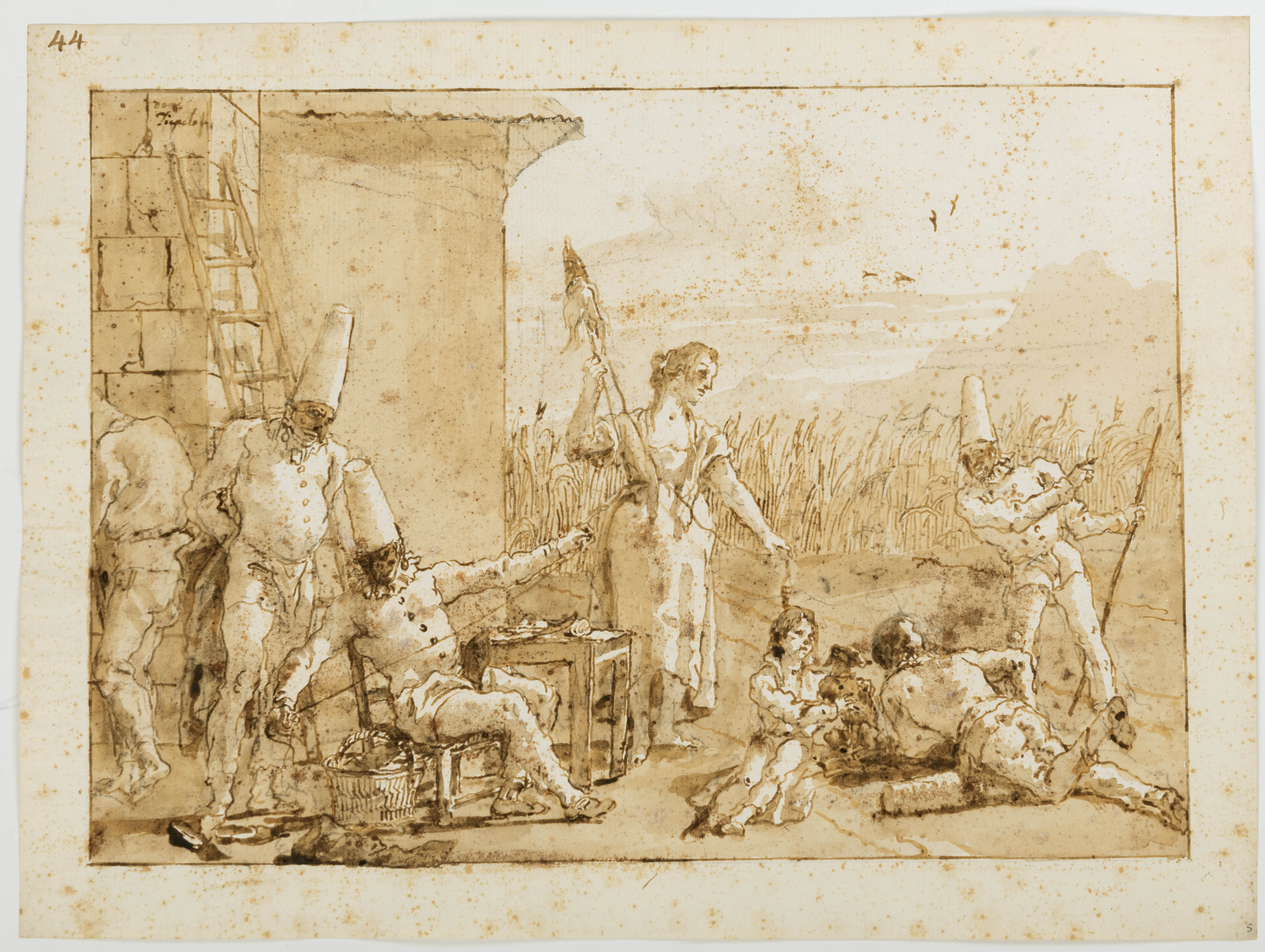 The same cornfield seen in the distance in the present sheet reappears in the background of two other drawings from the Divertimenti per li regazzi series; Punchinello Retrieves a Dead Fowl from a Well in the Robert Lehman Collection at the Metropolitan Museum of Art in New York and Punchinello Chopping Wood in the Art Institute of Chicago.