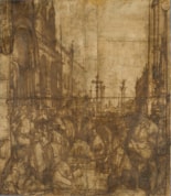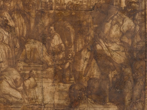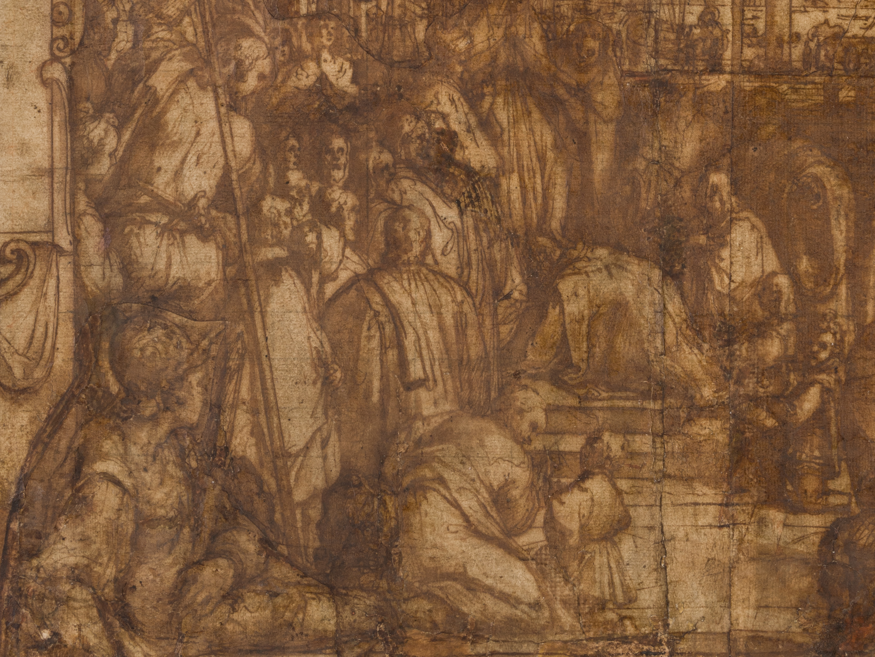 The present sheet is quite close to the composition of the final canvas, although it displays numerous pentiments and, in particular, alters the length of the façade of the Palazzo Ducale. As the scholar Roger Ward has noted, this large drawing is ‘of great historical importance [and] technical complexity…It is vital to an understanding of the function of this drawing to realise that it was not made on a single sheet, but on several smaller pieces of paper that have been joined. Furthermore, some figures or whole groups of figures were drawn on separate fragments and then, like giant pentimenti, stuck down onto the principal sheet (perhaps most easily discernible in reproduction is the soldier seated in the bottom left corner). Also the Doge’s Palace was significantly altered by bleeding out most of its visible extension beyond the façade of San Marco. In other words, this drawing, though made well beyond the invenzione stage, is nevertheless a record of work still in progress.’ Indeed, the present sheet allows for a fascinating insight into Zuccaro’s artistic process as he developed the crowded composition of this significant public commission.