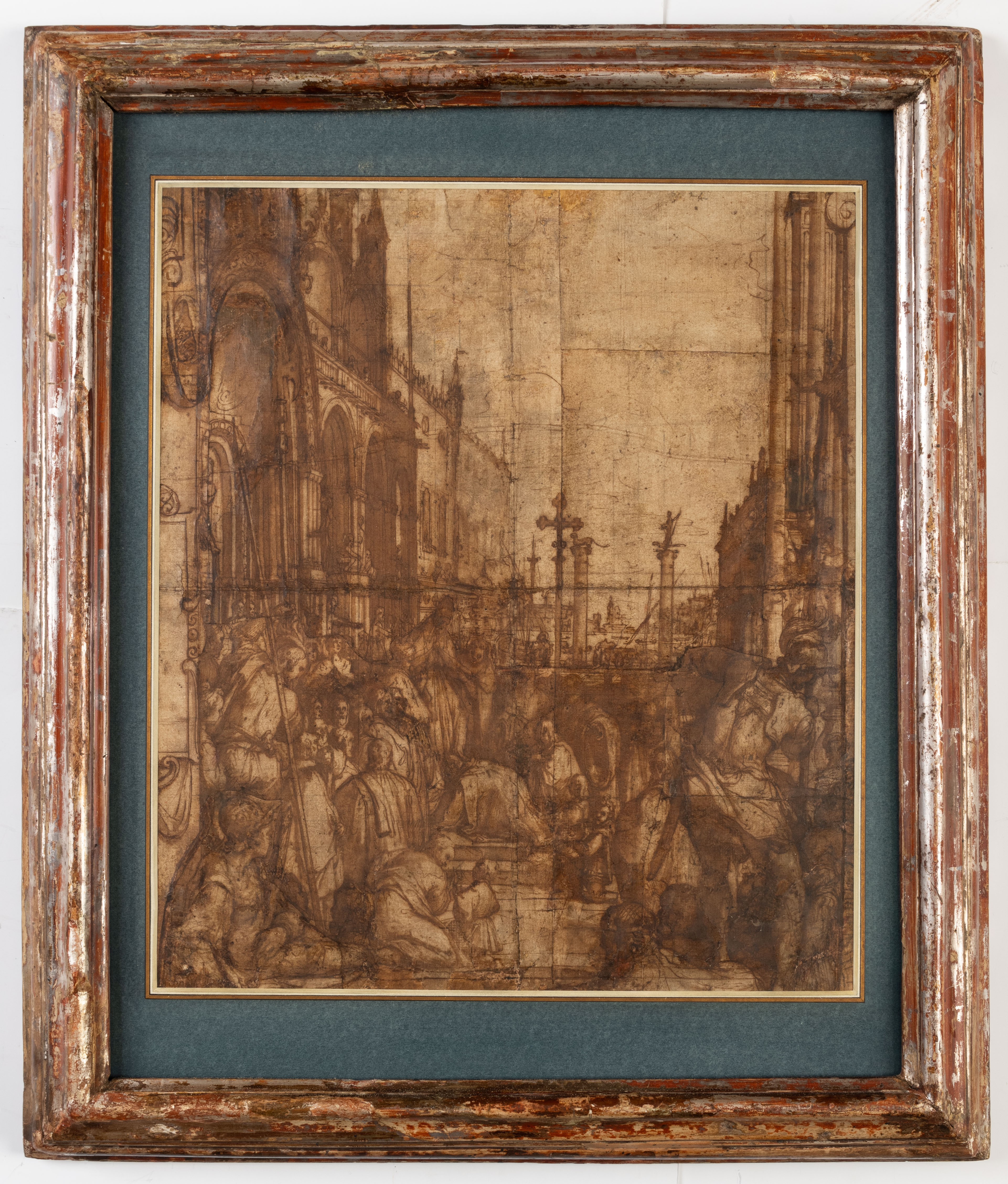Each of the other known compositional drawings by Zuccaro for The Submission of Emperor Frederick Barbarossa before Pope Alexander III depict the scene as it was actually painted; that is, looking towards the lagoon with the façade of San Marco at the left edge of the composition. It is not known why the artist reversed the orientation of the scene, but James Mundy has suggested that it may have been because Zuccaro’s painting was to hang next to a large work by Palma Giovane in which the composition is directed to the left, and therefore to balance it the artist decided to orient his picture to the right. A compositional study in pen and ink for The Submission of Emperor Frederick Barbarossa before Pope Alexander III is recorded in a private English collection in 1970, while another compositional drawing, formerly in the collections of Everard Jabach, Pierre Crozat, Pierre-Jean Mariette and, more recently, Juan de Beistegui, is today in the Musée des Beaux-Arts in Lille. A third, highly finished drawing, very close to the present sheet in composition and slightly larger, is in the collection of the J. Paul Getty Museum in Los Angeles. A preparatory drawing for the group of spectators at the left edge of the composition is in the Statens Museum for Kunst in Copenhagen, while a handful of chalk studies for individual figures in the painting are also known. A studio copy of either the present sheet or the closely related Getty drawing is at Christ Church in Oxford.