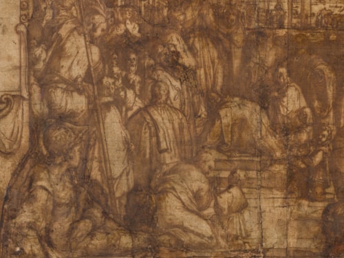 Several other preparatory drawings by Federico Zuccaro for The Submission of Emperor Frederick Barbarossa before Pope Alexander III have survived. Perhaps the earliest drawing related to the project is a large horizontal composition that appeared at auction in 2010, which depicts the scene within an elaborate architectural setting, viewed from the Piazzetta with the Torre dell’Orologio in the background and San Marco at the right of the scene. However, the drawing’s horizontal orientation would have been quite unsuitable for the narrower vertical space intended for the painting. It has been suggested, therefore, that the drawing may represent a first idea by Federico for the composition, drawn either before he knew precisely the dimensions of the space to be painted, or perhaps as an attempt to persuade the Senate to allow him to decorate a much larger, horizontal space in the Sala del Maggior Consiglio. The next drawing in the sequence is an elaborate compositional study in the Pierpont Morgan Library in New York, which likewise differs from the final painting in showing the scene from the other side, looking towards the Torre dell’Orologio with the façade of San Marco at the right.