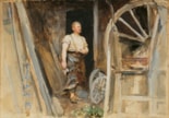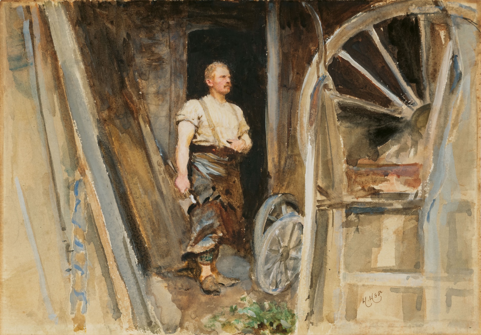 Inscribed Hubert Herkomer / The Wheelwright / (Stellmacher) on a label attached to the reverse of the frame.