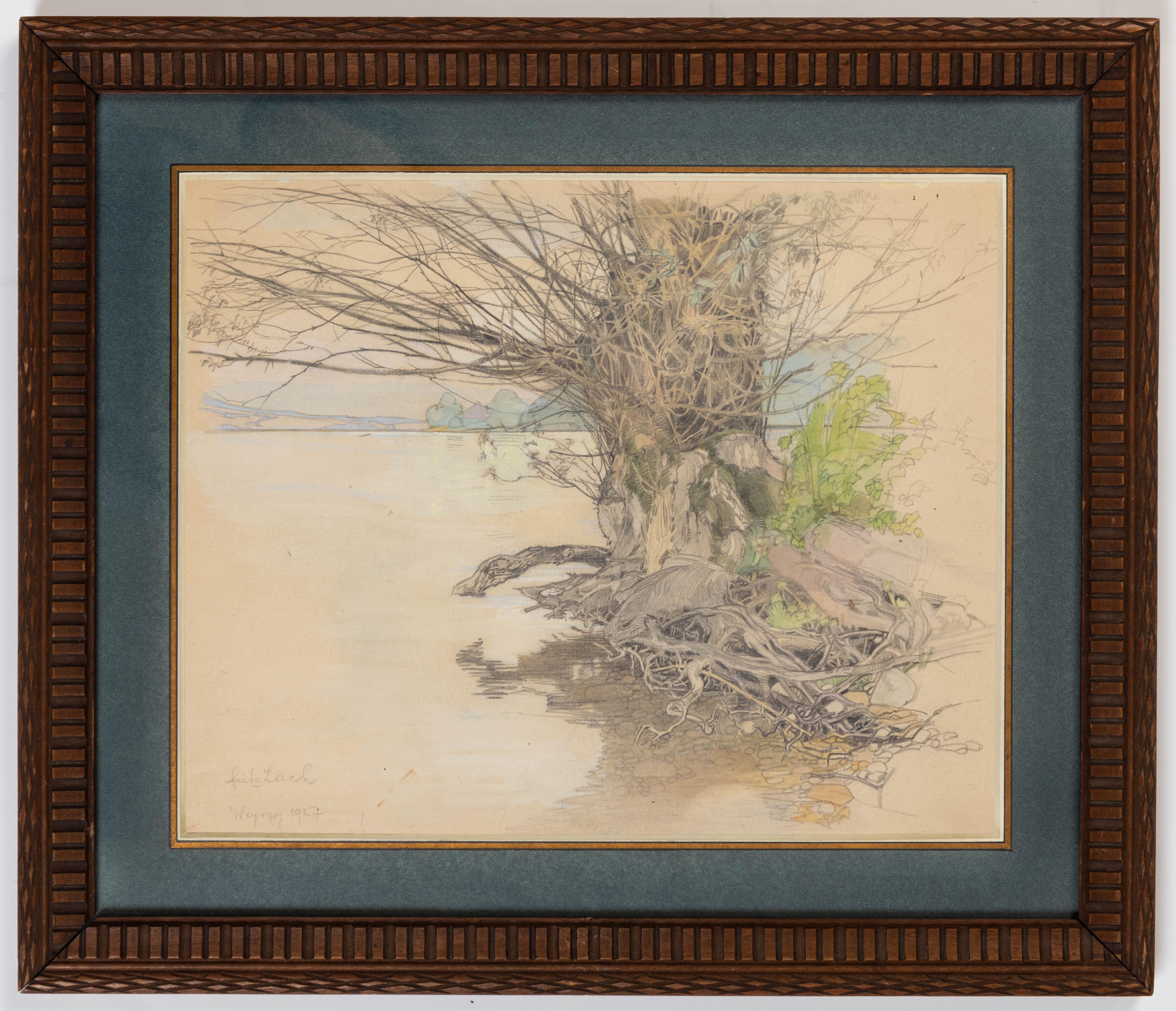 The Austrian landscape draughtsman and printmaker Friedrich (Fritz) Lach was born into an artistic family, being the nephew of the flower painter Andres Lach and the great-nephew of one the most significant painters of the Biedermeier period, Ferdinand Georg Waldmüller. Although he received his artistic training at the academies of Vienna and Munich, he worked for a Danube shipping company for several years in the 1890s before committing to an artistic career around the turn of the century and settling in Vienna. Lach was an active member of both the Austrian Artist’s Association and the Dürerbund, the German society of artists and writers, and won a number of awards, prizes and civic decorations. The artist exhibited his landscape watercolours, often in frames he designed himself, in Vienna and Linz. He died of a stroke in 1933 and was buried with honour in Vienna’s central cemetery.