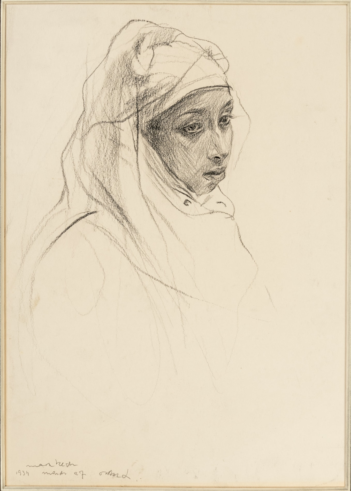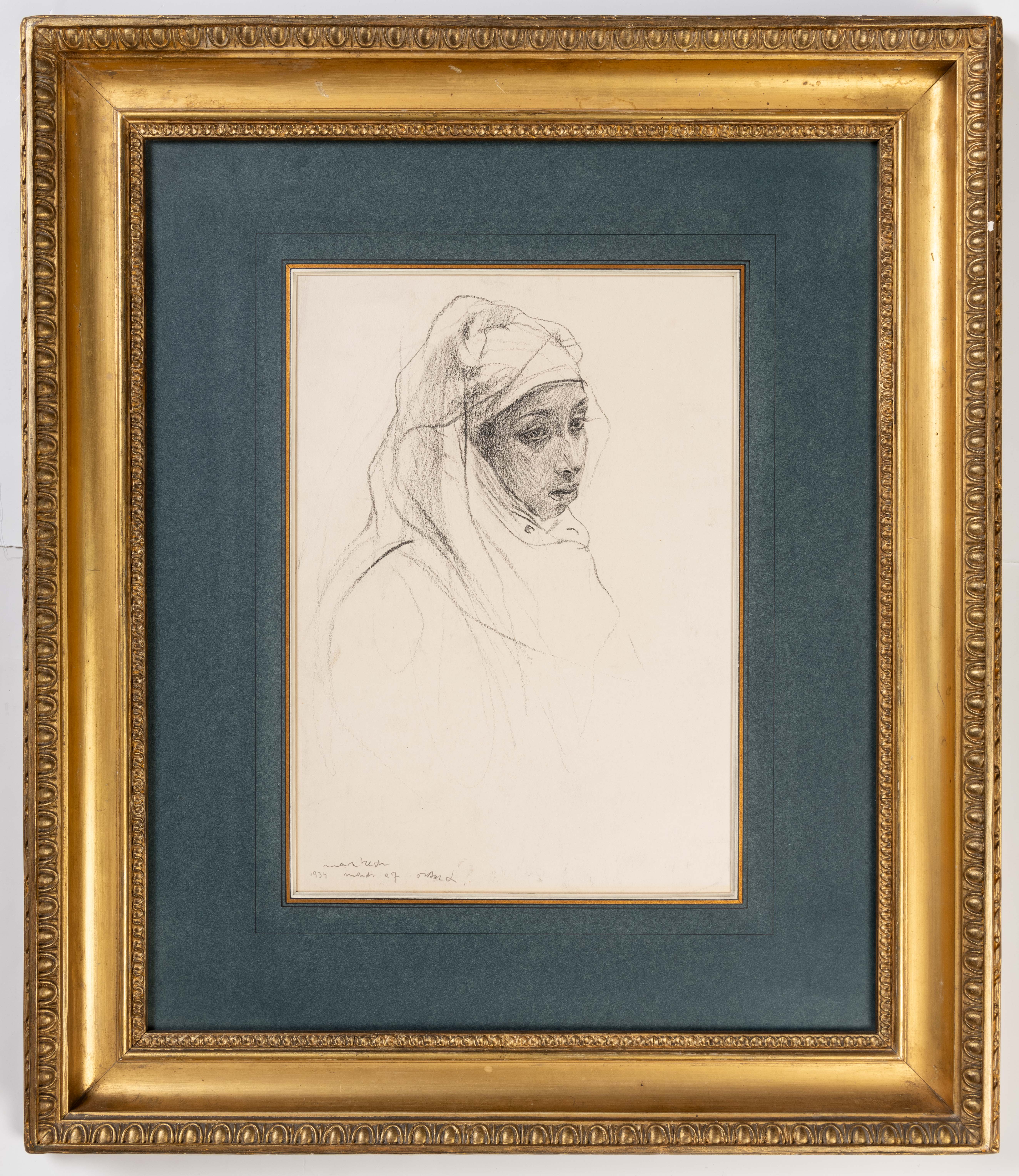 De László and his wife visited Morocco in March 1934, staying at the Hotel La Mamounia in Marrakesh for three weeks and stopping at Tangiers on their way back to England. The artist’s diary account of his brief time in Morocco reveals that he found the experience discouraging: ‘We drove through the moorish quarter – which terribly disappointed us – poor – miserable people…it is a great blow to us all – especially to me – as I looked forward to paint interesting subjects.’ Nevertheless, he was invited to lunch by the powerful Pasha of Marrakesh, Thami El Glaoui, and also met the French painter Jacques Majorelle through a mutual friend, Camille Mauclair. Majorelle invited de László to paint in his famous garden in Marrakash and also allowed him to make use of his adjoining home studio, in which he painted two of Majorelle’s Berber models. As has been noted, ‘There are five recorded studies of nudes and figures that he produced during this time. Many of them remain in the possession of the artist’s descendants’. During his Moroccan stay, de László produced two landscapes and two paintings of nudes, as well as an oil sketch of a young girl holding an urn that may depict the same sitter as the present sheet.