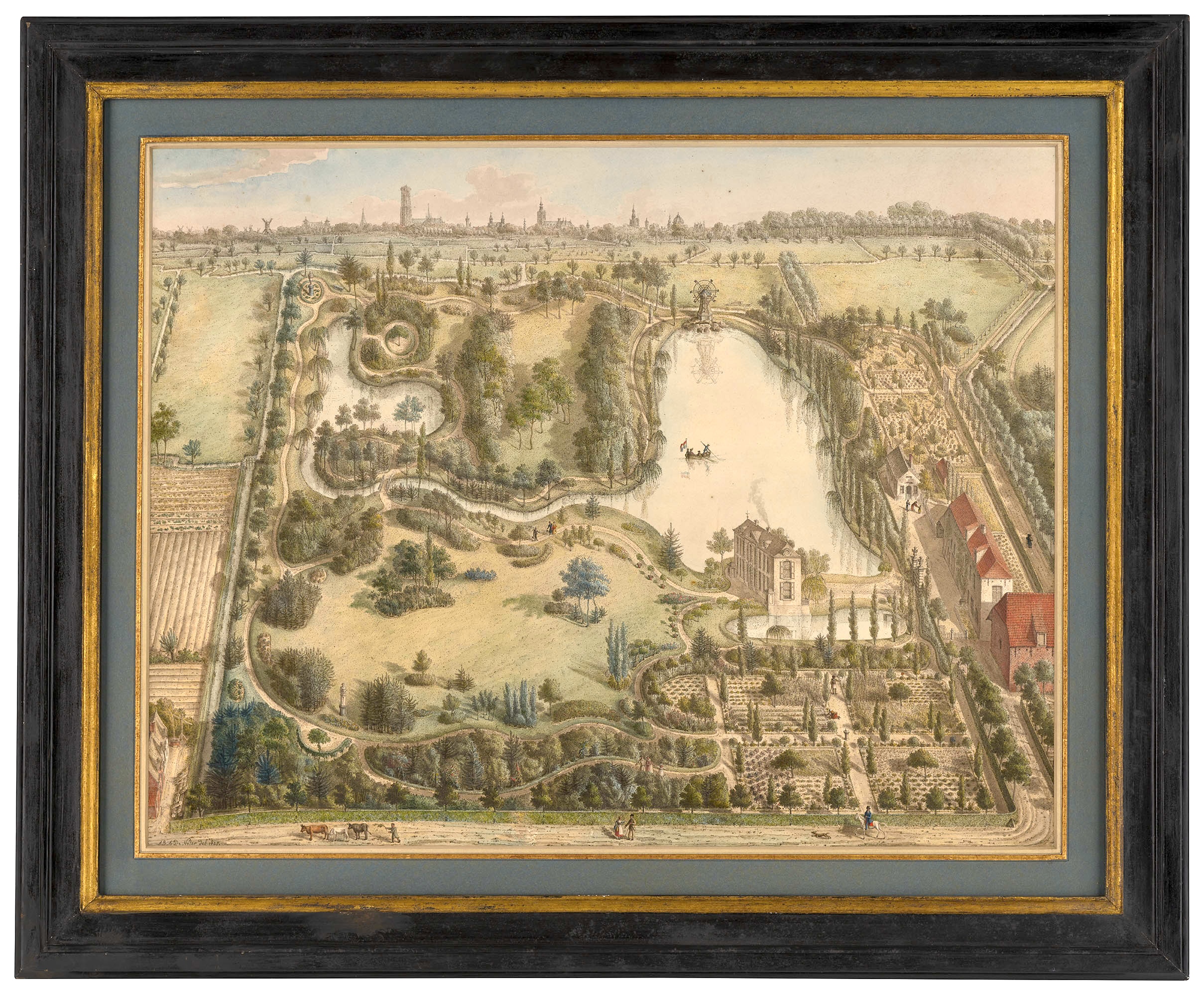 The present sheet depicts, in the distance, a view of the city of Mechelen, situated between Brussels and Antwerp. Prominent architectural features including the distinctive tower of St. Rumbold’s Cathedral and the domed Basilica of Our Lady of Hanswijk are easily recognizable at the top of the composition. The vast majority of the composition, however, is taken up with an overhead view of a large park with canals, wooded areas and gardens and a small pond or lake, as well as a formal garden and a castle. This is the country estate of Vorschenborg, the property of the Brabant nobleman Jean-Ernest-Guîlain-Xavier Coloma (1747-1825), Baron of Sint-Pieters-Leeuw.