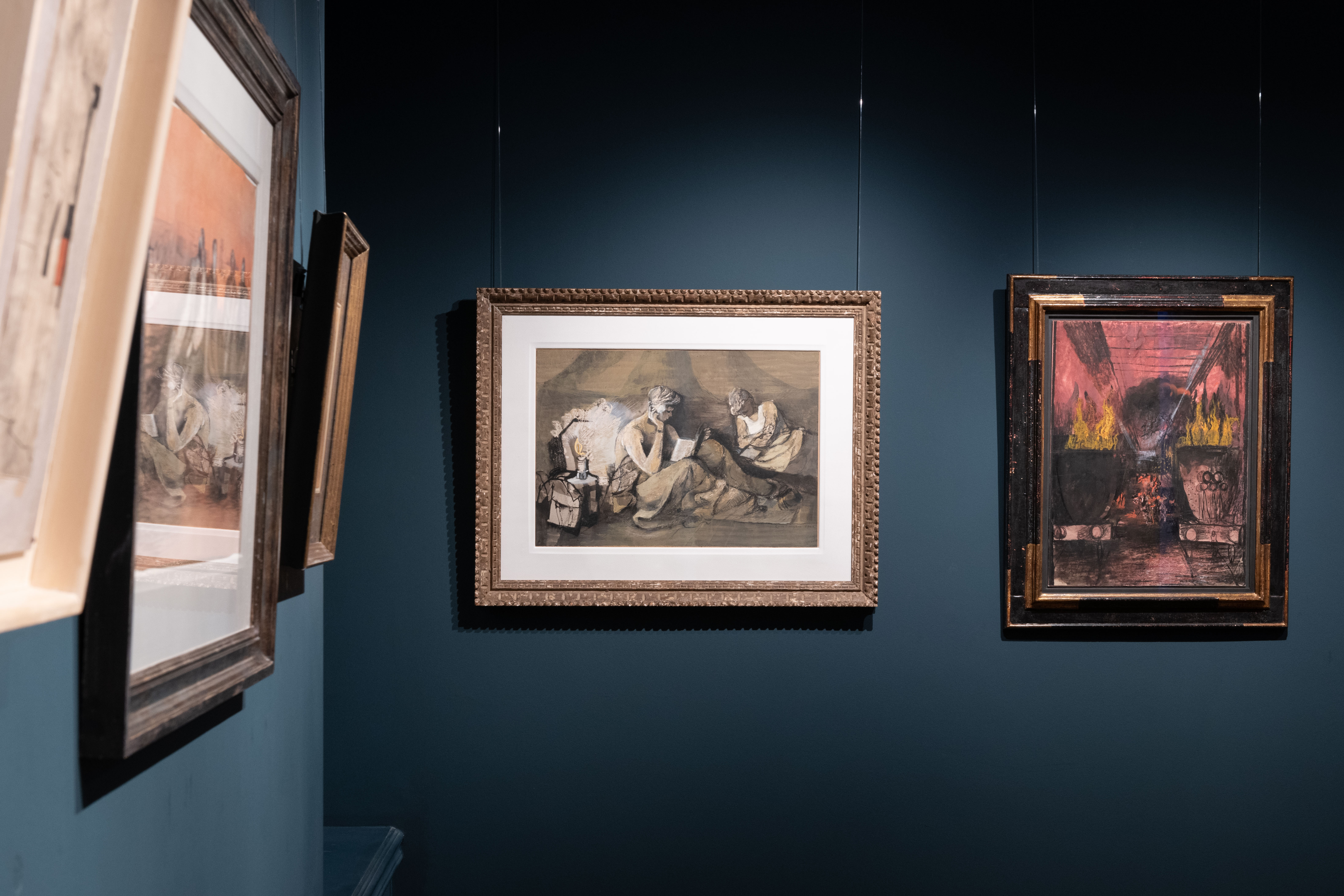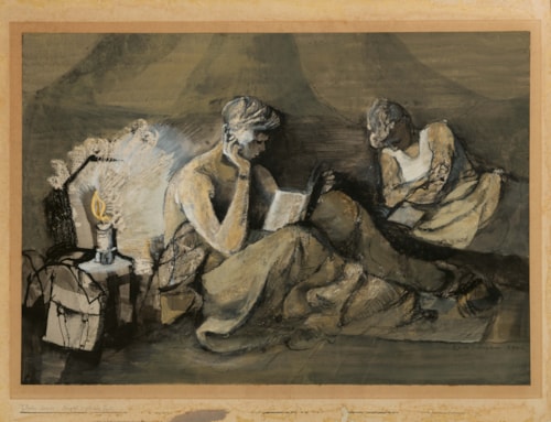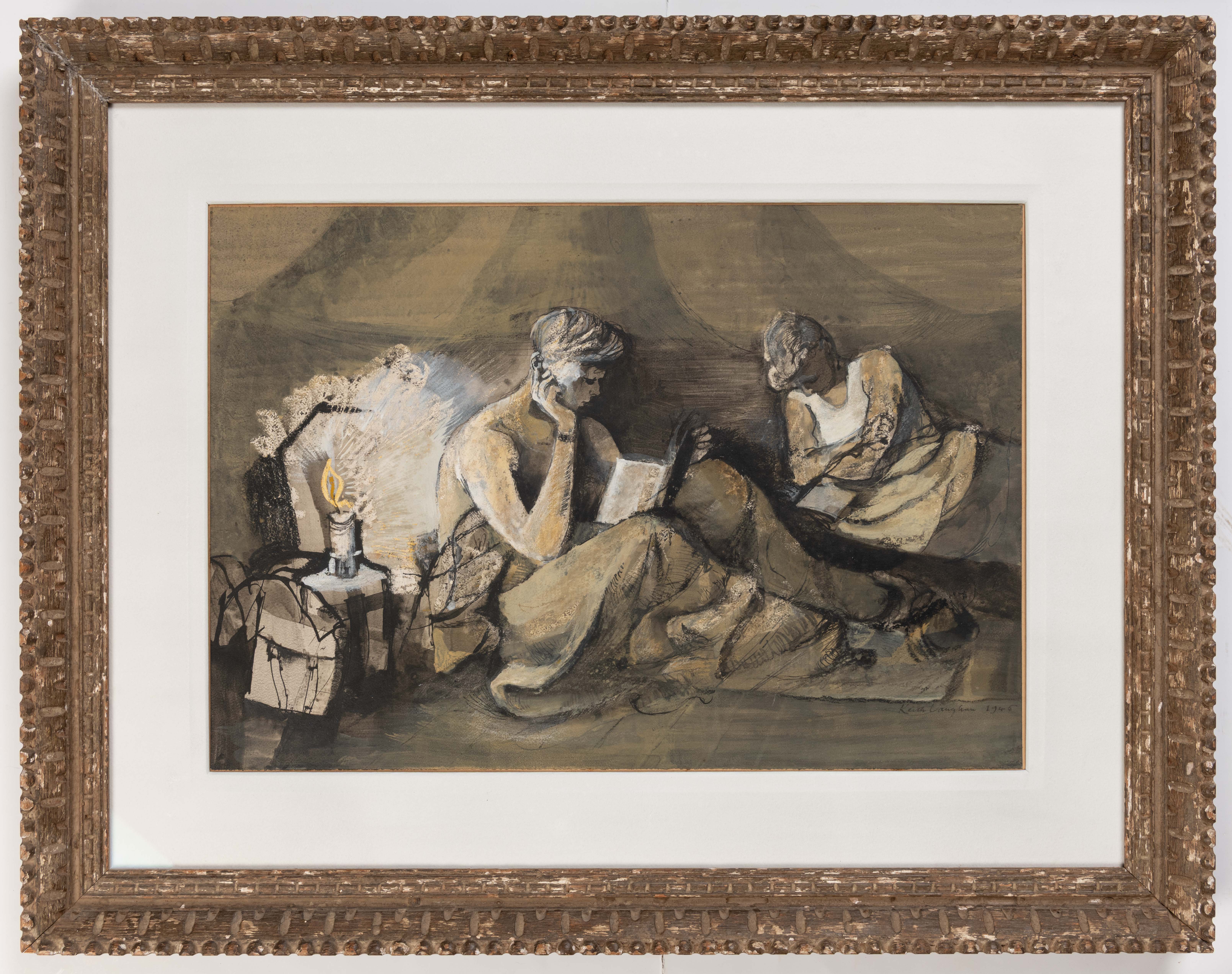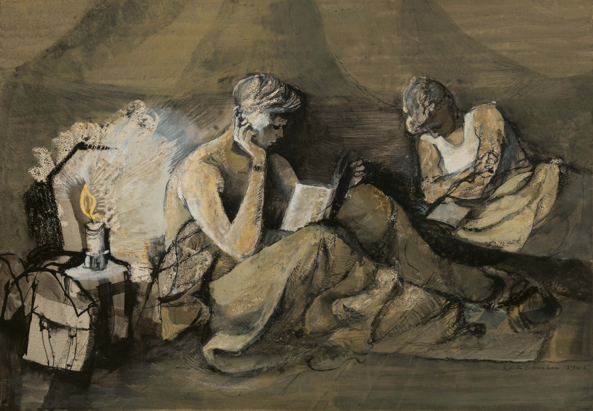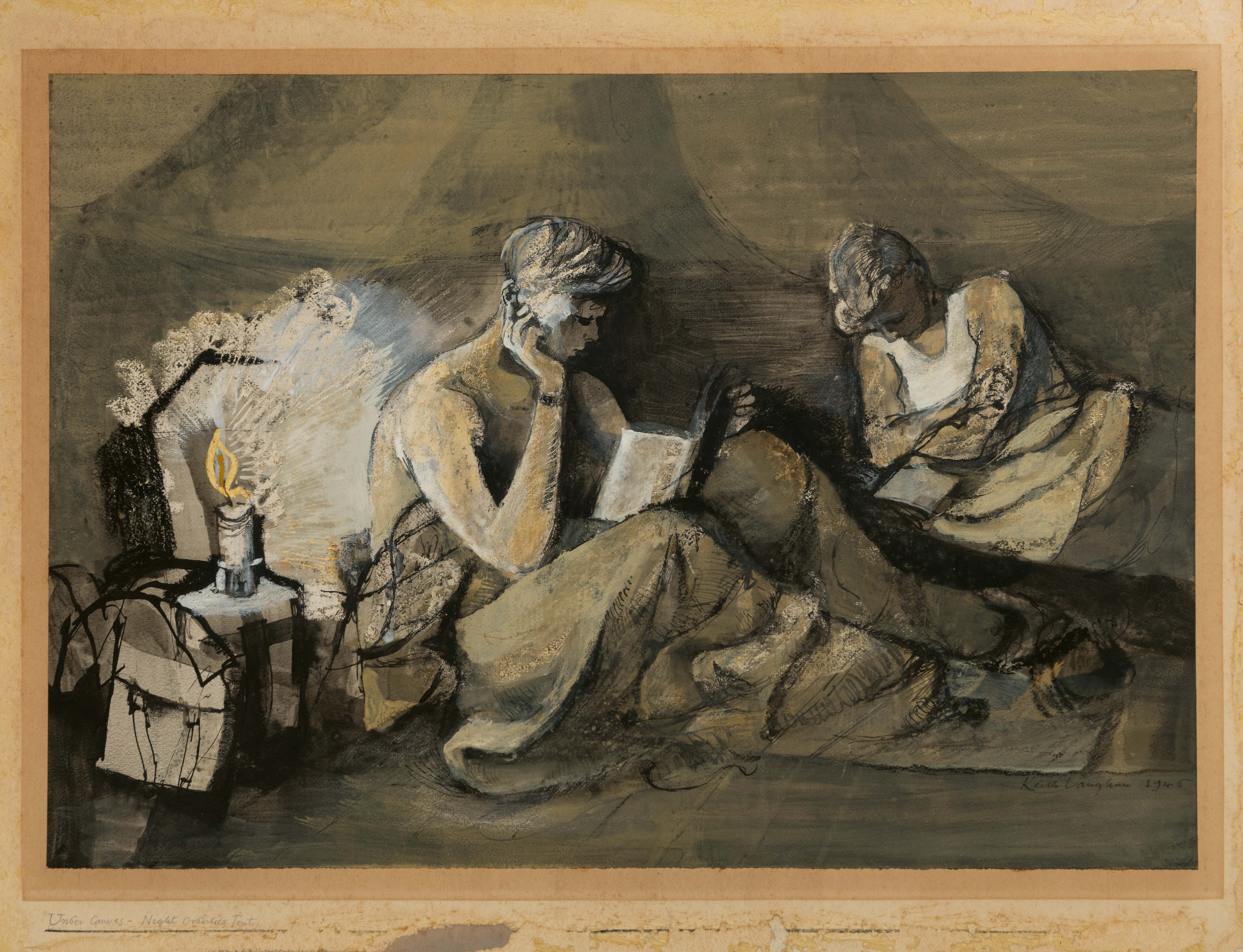 This fairly large, fully-signed and dated gouache composition, almost certainly intended as an autonomous work of art, is likely to have been drawn at Eden Camp, a prisoner of war detainment centre near Malton in North Yorkshire, midway between York and Scarborough, where the artist was stationed in the summer of 1943. As a biography of Vaughan notes of his time at Eden Camp, ‘At first he lived in the huts with the other men, and made a few more of the barrack-life sketches he had done [earlier], but he soon volunteered to go on almost permanent night-duty, sleeping in the office in case the telephone should ring. He wrote [to his friend Norman Towne]…‘For nearly 12 hours each day, from 7pm to 7am, I am alone and undisturbed and quiet by the fire in the Company office, where I sleep, and think.’ It was the nearest thing you could get to being in a twentieth-century monastery, he told Towne…Eden Camp was a safe haven from the war so the sufferings of Europe could be forgotten for weeks at a time.’ Vaughan remained at Eden Camp, working as a clerk and occasional German interpreter, until his demobilisation from the Pioneer Corps in March 1946.