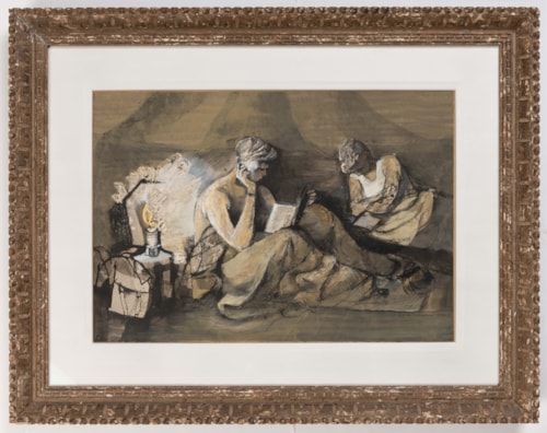 While serving in the Non-Combatant Corps during the Second World War, and since there was a limited range of media that could be carried in a regulation army knapsack, Keith Vaughan became adept at expressing himself through the graphic mediums of Indian ink, pencil, crayon and gouache; the latter usually in dark military colours of green and ochre. As he wrote in the foreword to his first gallery exhibition of drawings in 1944, in which several of his army drawings were included, ‘On New Year’s Day 1941, the first thing that went into my brand new army haversack was the largest drawing book it would accommodate and an unbreakable bottle of black ink…I now spent my off-duty hours with a pad on my knee on my bed in a barrack room. For a year I drew the raw material that was in front of me. By 1942 I had done all I wanted of this…To accommodate my slightly increased ambitions, I added to my materials one or two more bottles of ink, two pots of gouache and a few crayons. With these I hoped to be able to recover something of the solidity and depth of oil, while satisfying the requirements of intermittent work and total concealment of the result.’ The early 1940s found Vaughan executing numerous drawings of his surroundings, the barracks and fellow soldiers and labourers, some in sketchbooks and some on much larger paper and typically filled out with gouache. Dated 1945, the present sheet is an exceptional example of the latter, and can be counted among the very finest of Vaughan’s rare wartime drawings.