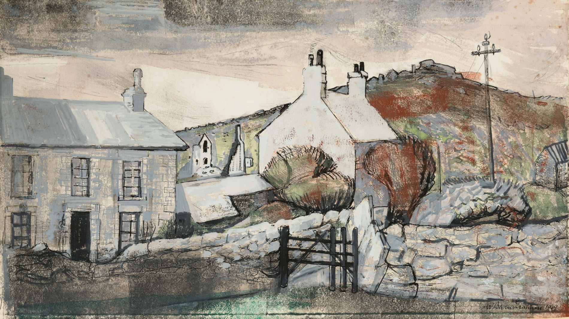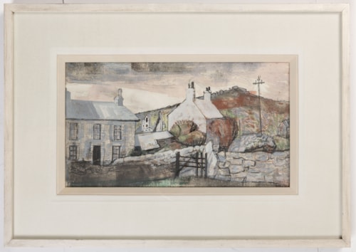 Drawn in 1949, the year that Barns-Graham resigned from the more traditional St. Ives Society of Artists to become one of the founders of the Penwith Society of Arts, the present sheet depicts the 17th century coaching inn known as the Gurnard’s Head, situated near the rocky promontory of the same name on the north coast of the Penwith peninsula in Cornwall, just north of Porthmeor and about six miles west of St. Ives. (The name apparently derives from the headland’s resemblance to the head of a gurnard fish.) A comparable gouache study of the Gurnard’s Head, dated two years earlier in 1947 and of slightly larger dimensions, was recently acquired for the Penlee House Gallery and Museum in Penzance. An oil painting of Gurnard’s Head, also dated 1947, is in the collection of the Wilhelmina Barns-Graham Trust in Edinburgh.