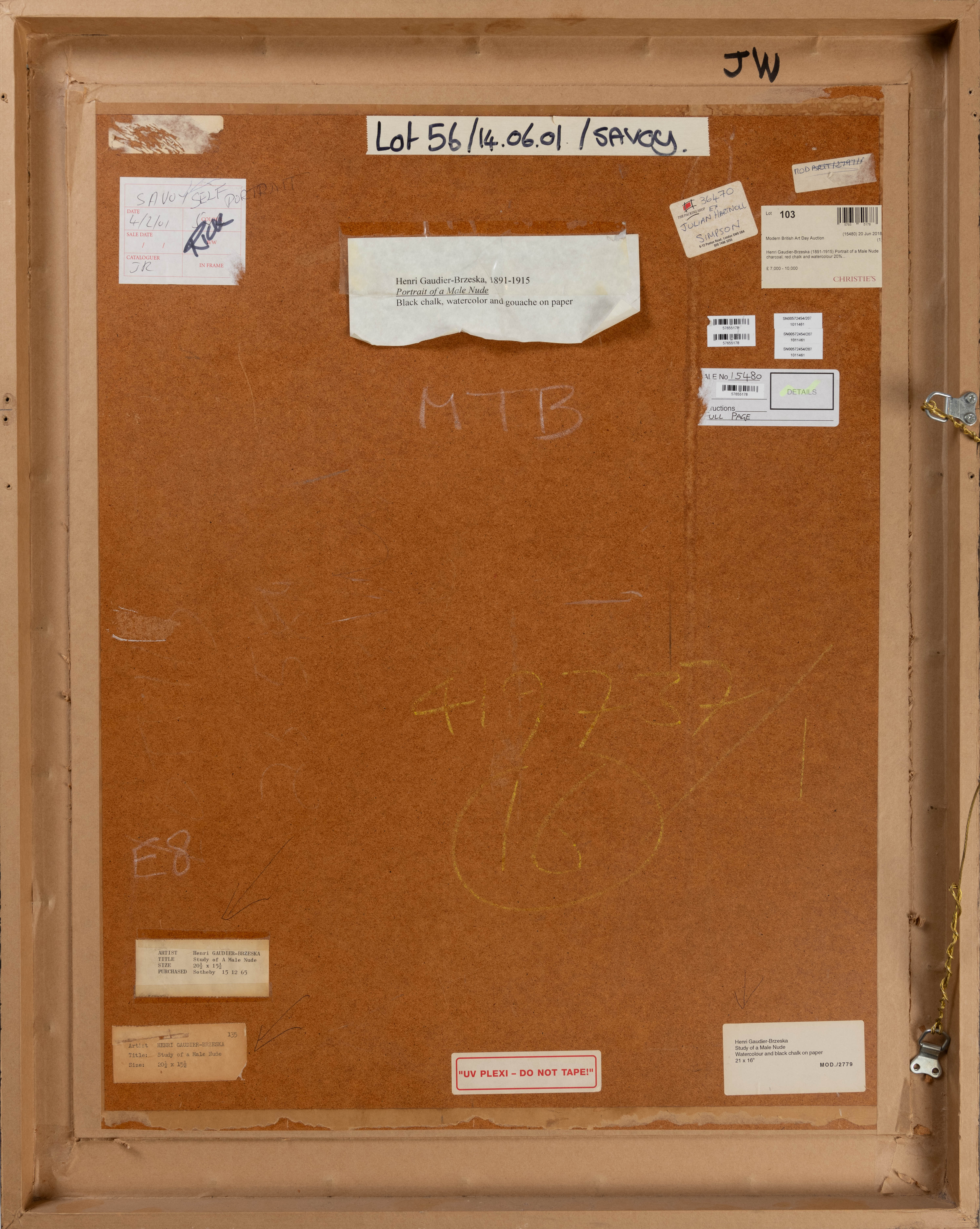 The present sheet once belonged to the English artist, theatre designer and writer Claud Lovat Fraser (1890-1921), a friend of Gaudier-Brzeska, to whom he had been introduced by the art critic Haldane MacFall. As Brodzky recalled, ‘Brzeska at this time saw quite a lot of Lovat Fraser, who had a studio in South Kensington, and showed a number of small pieces at Fraser’s studio when the latter held a one-man show of his pictures. Lovat Fraser and Brzeska at this time were much together and were often in each other’s studios… Brzeska was always busy; if not for himself, then for others. He found time to decorate Fraser’s studio, painting the staircase and other woodwork in primitive colours.’ Lovat Fraser acquired several drawings from Gaudier-Brzeska; one of these, a head of a Japanese woman in coloured chalks, is today in the British Museum.