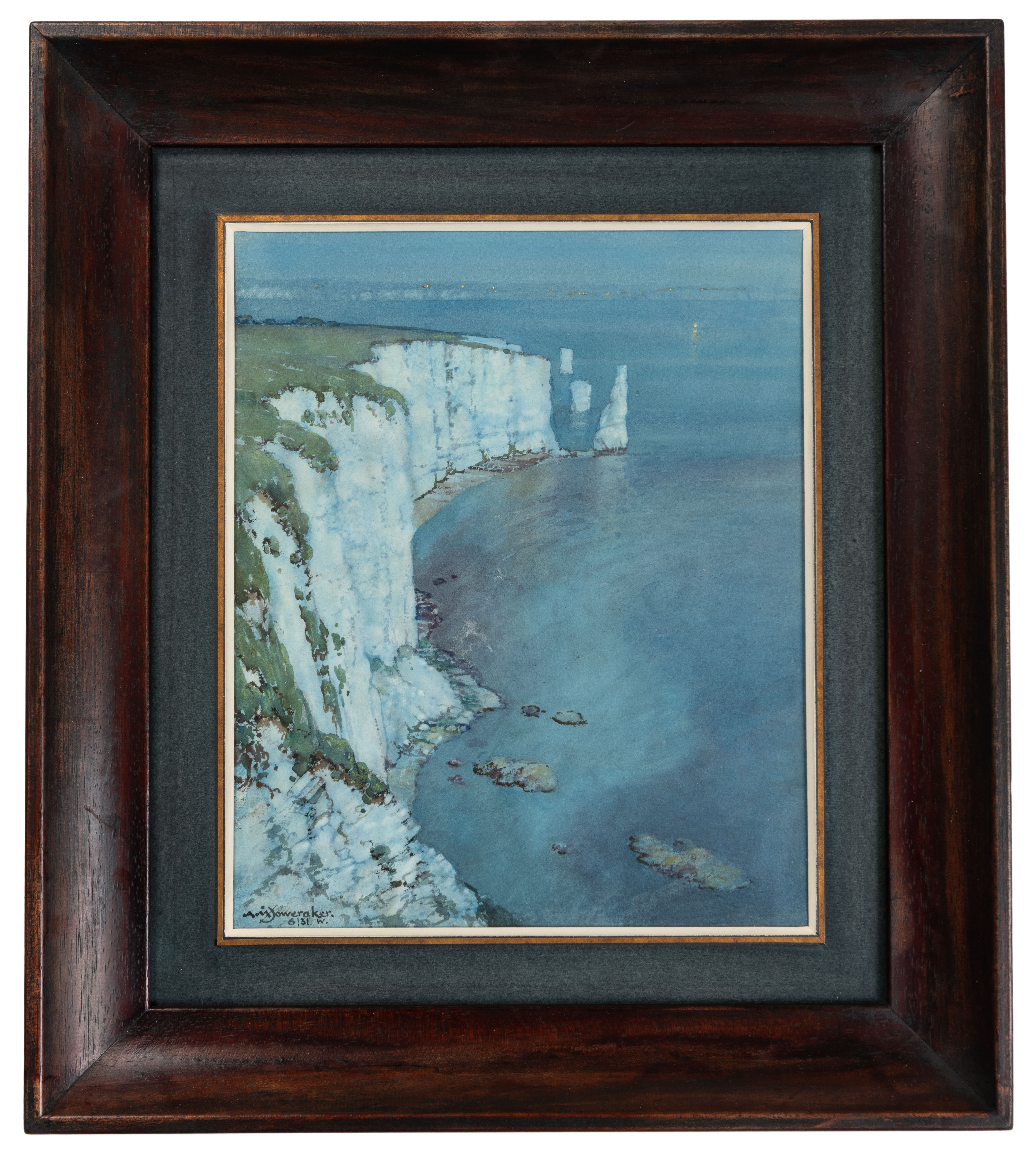 Foweraker’s landscape paintings and watercolours are characterized by a particular interest in light effects, especially moonlight, and many of his works are dominated by an intense blue tonality. As one modern scholar has noted, ‘Collectors would, without hesitation, describe Albert Moulton Foweraker...as primarily a watercolourist, and his twilight depictions of Spanish and English towns and villages are highly regarded...For watercolour subjects, Foweraker unsurprisingly painted a number of semi-rural scenes in the locality of his home in Carbis Bay, and in nearby Lelant, but he was also fond of exploring the coastline, capturing reflections in pools in the sand underneath craggy cliffs. However, he developed a special talent for twilight scenes...These mood pieces must have tapped into the same market as the moonrises of his oil painting colleagues and clearly proved popular, as Foweraker concentrated on such twilight scenes to a significant degree.’