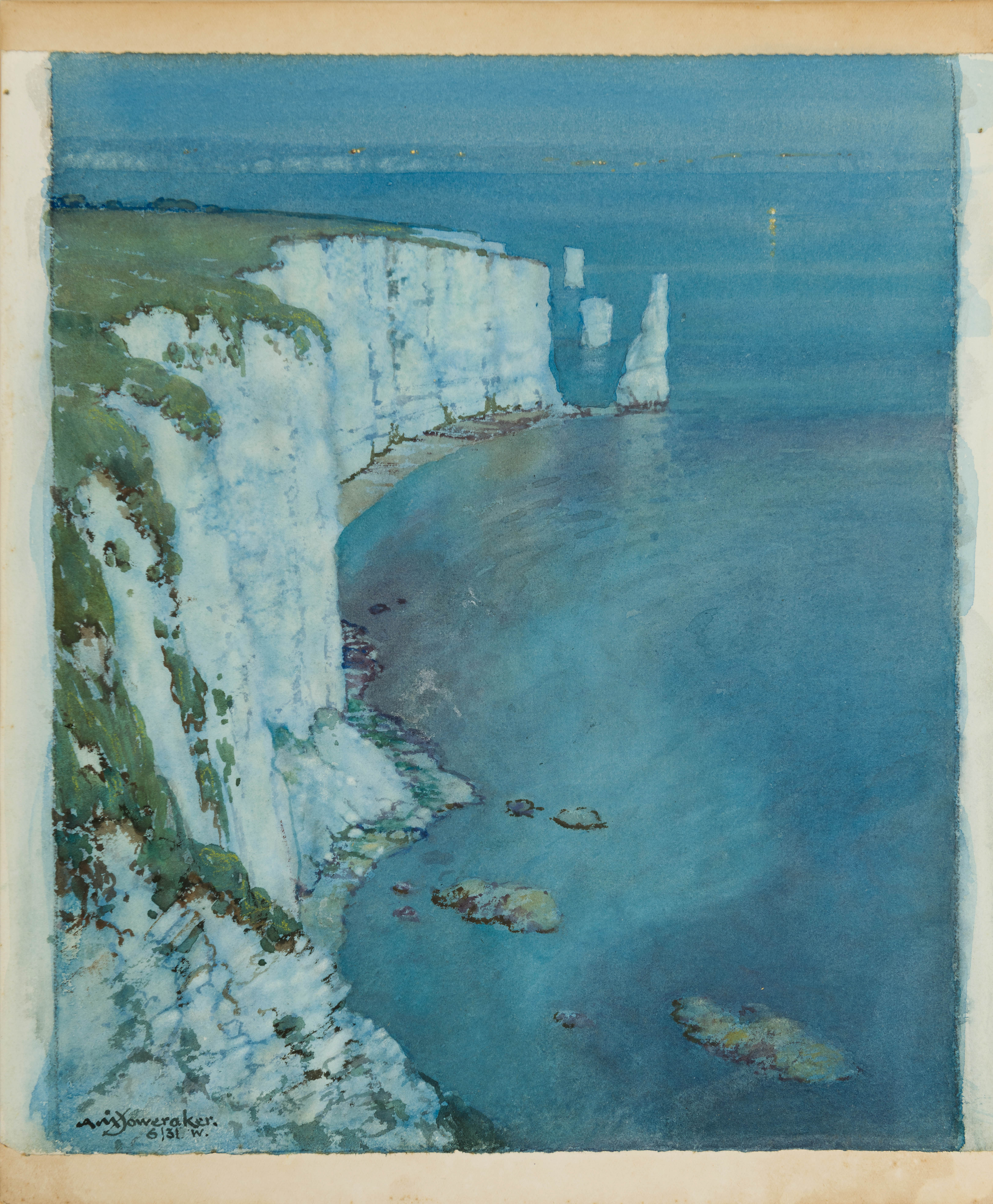 Foweraker’s landscape paintings and watercolours are characterized by a particular interest in light effects, especially moonlight, and many of his works are dominated by an intense blue tonality. As one modern scholar has noted, ‘For watercolour subjects, Foweraker unsurprisingly painted a number of semi-rural scenes in the locality of his home in Carbis Bay...but he was also fond of exploring the coastline, capturing reflections in pools in the sand underneath craggy cliffs.’