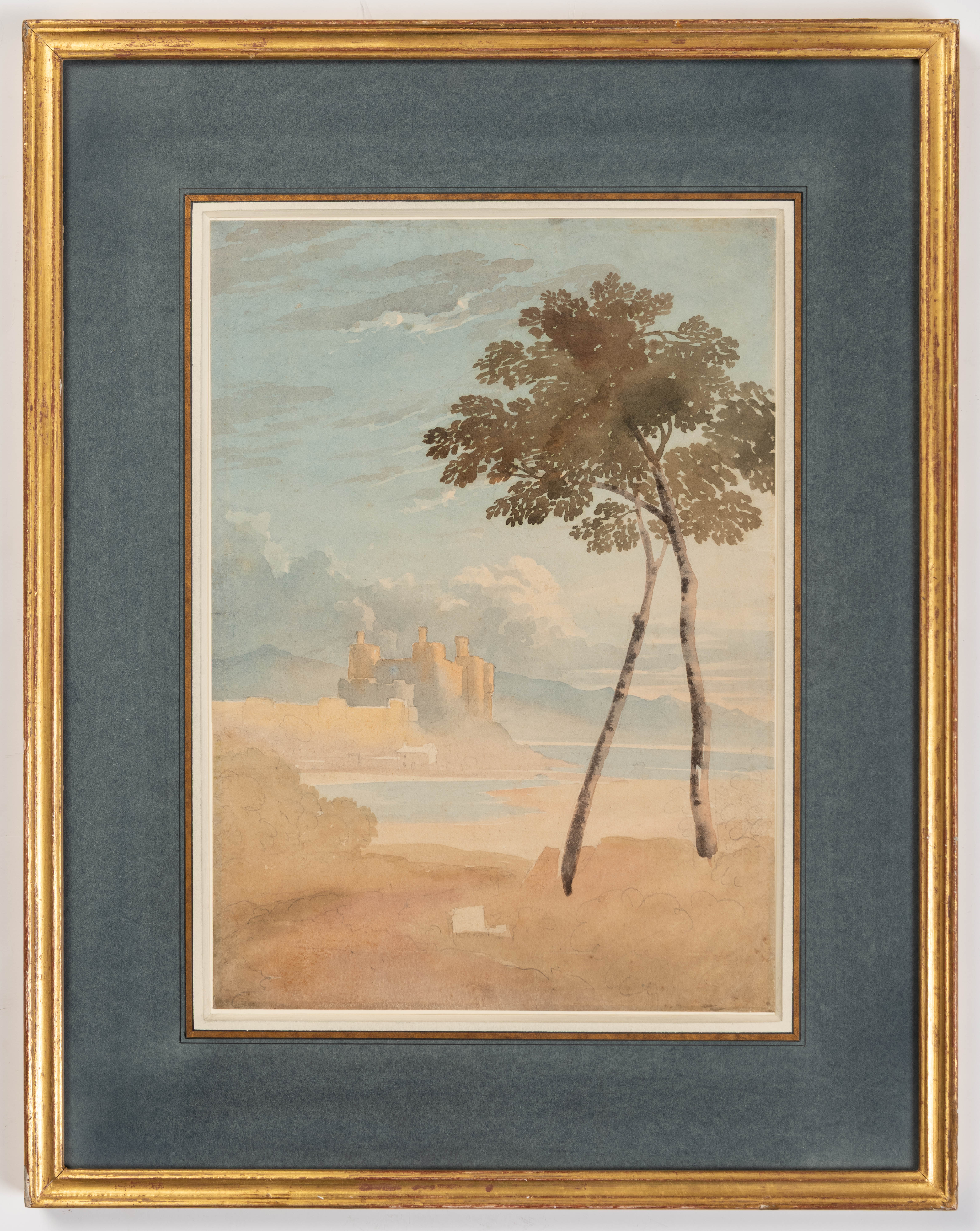 Built by King Edward I between 1283 and 1287, during his conquest of Wales, Conwy Castle had fallen into ruin by the middle of the 17th century. Its picturesque setting was much admired by artists in the 18th and 19th centuries, and Varley painted numerous views of the Castle, several of which were exhibited at the Old Water-Colour Society between 1805 and 1823. The artist was particularly fond of depicting the castle from a distance, with trees acting as repoussoir elements in the foreground of the composition, as here. One such example, a very large and finished watercolour with a similar distant view of Conwy Castle framed by trees in the foreground, is in the collection of the Pierpont Morgan Library in New York.