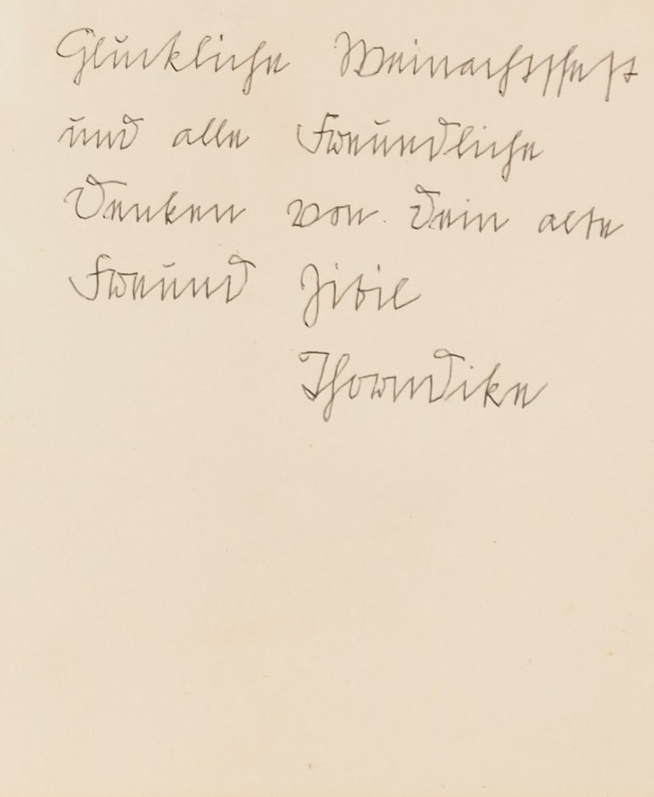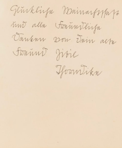 Inscribed by the artist in German 'Glückliche Weinachtsfest / und alle freundliche / Denken von dein alte / Freund Jivie(?) / Ifawndike (?)' in pencil on the inside of the folded card.