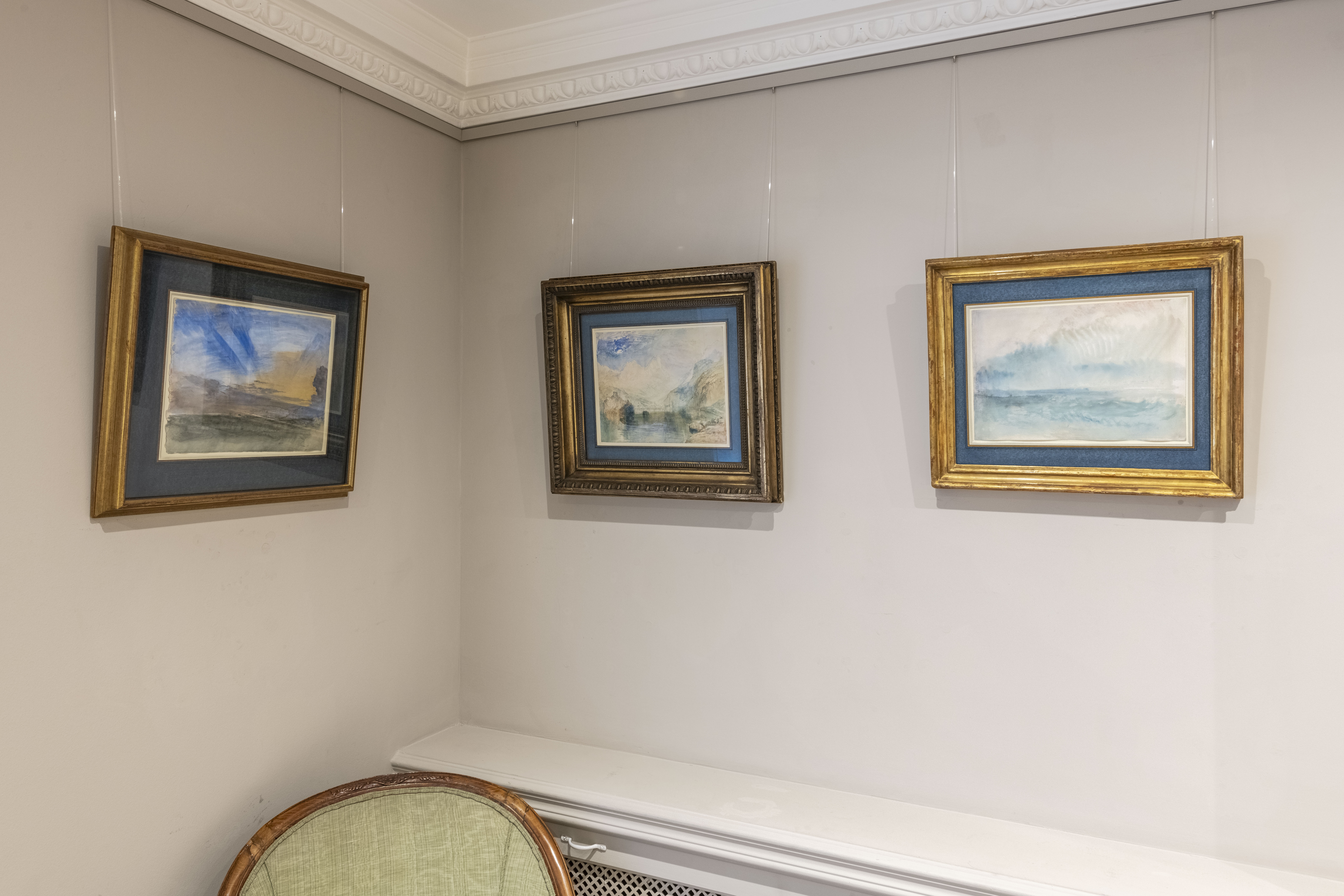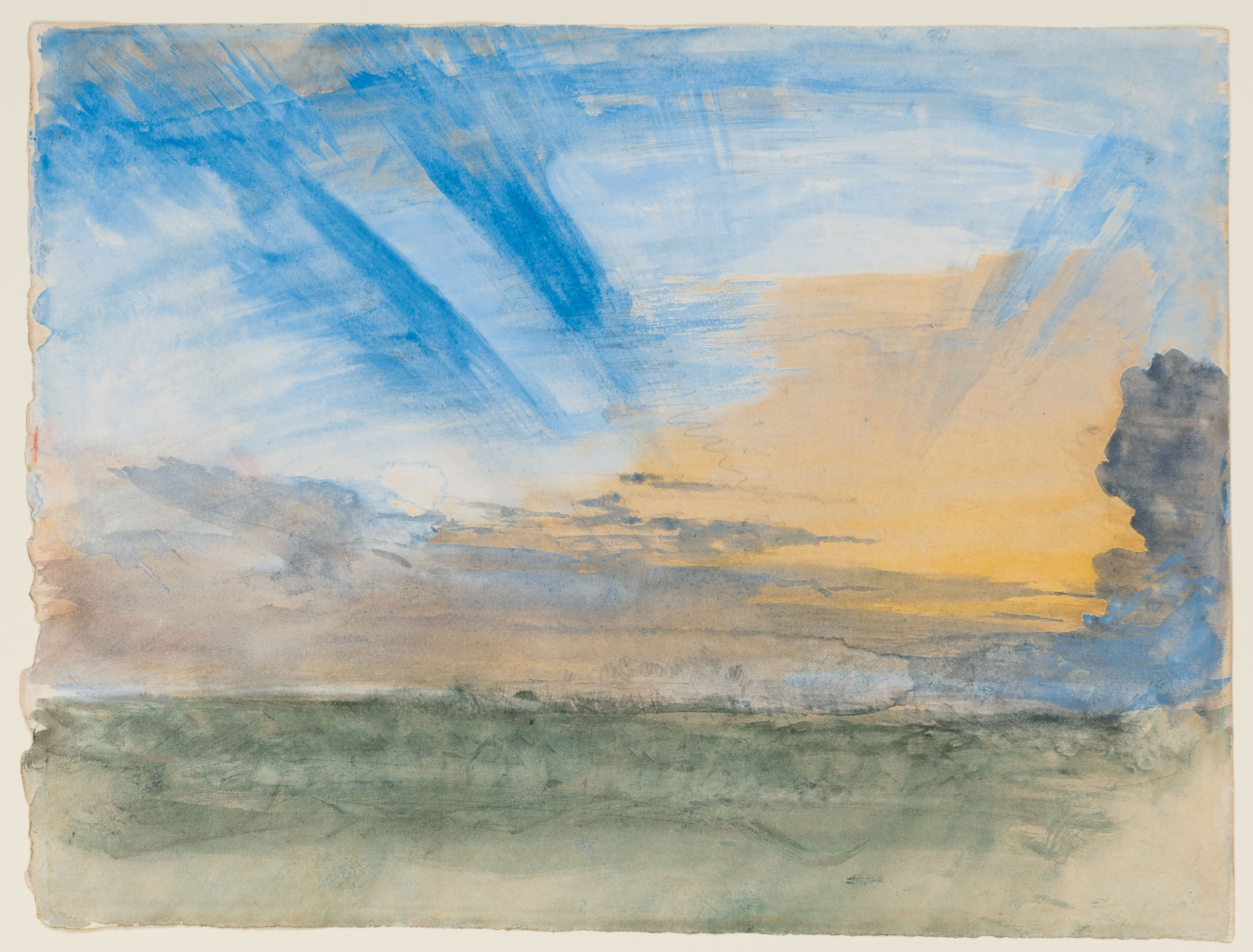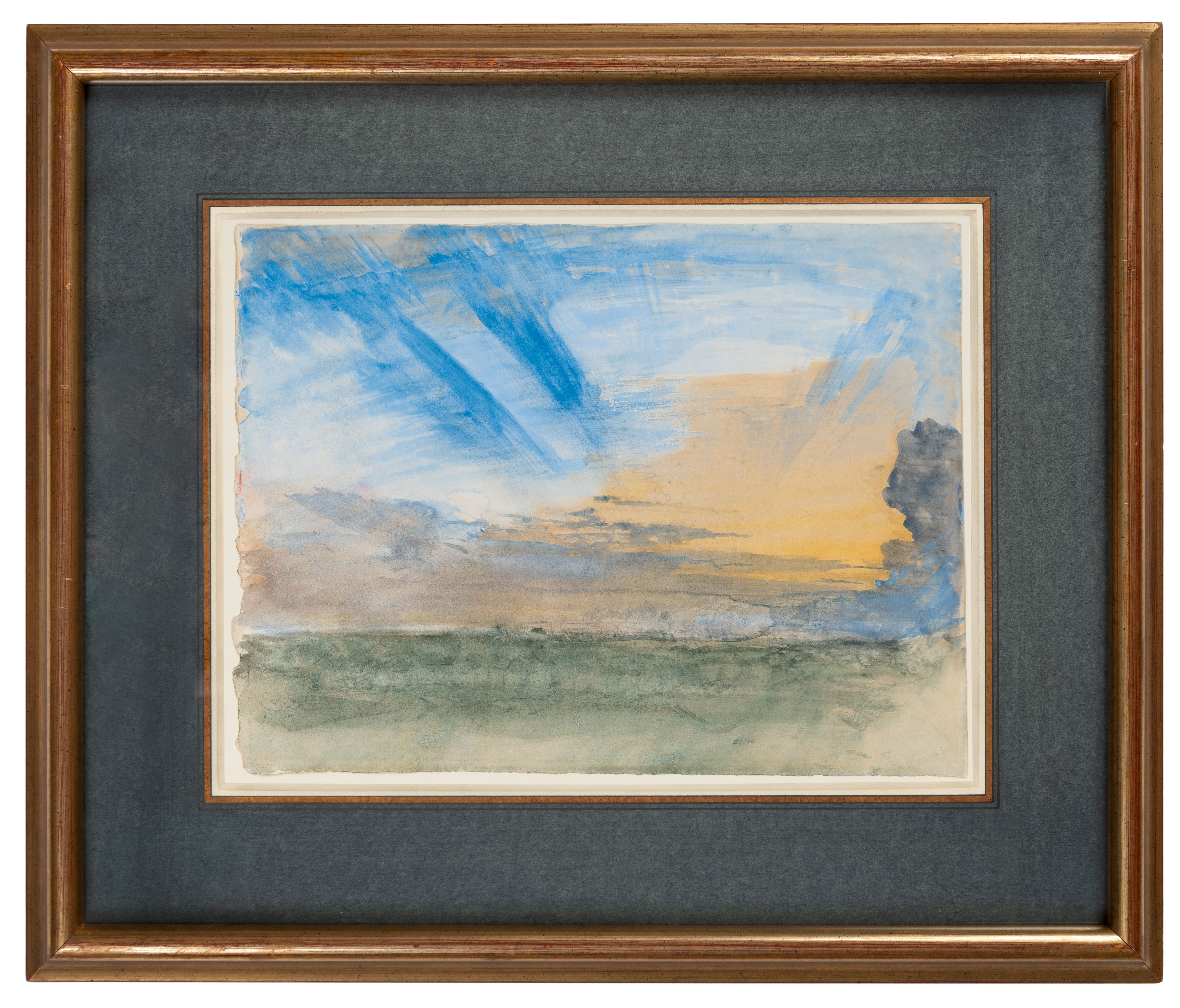 Watercolours such as the present sheet also reflect something of the profound and lifelong influence on Ruskin of the work of J. M. W. Turner, whose treatment of skies is mentioned in the younger artist’s writings and correspondence. It is with reference to such atmospheric studies as this that Christopher Newall has written, ‘Drawings of this kind demonstrate a conscious or instinctive debt to the type of colour studies of coastal or lake landscapes that J. M. W. Turner had made in the 1830s and 1840s, of which Ruskin had a number of examples in his collection…In Turner’s views, clouds frequently mask the sun with vaporous atmosphere tinged with reds and blues. Higher in the sky, bars or flecks of cloud catch the sunlight and show as pink strata in the wider cloudscape. Turner’s very personal watercolours of the rising or setting sun exemplify an instinctive response to meteorological phenomena and qualities of atmosphere and light that Ruskin found thrilling to look at and that he consciously or unconsciously imitated.’