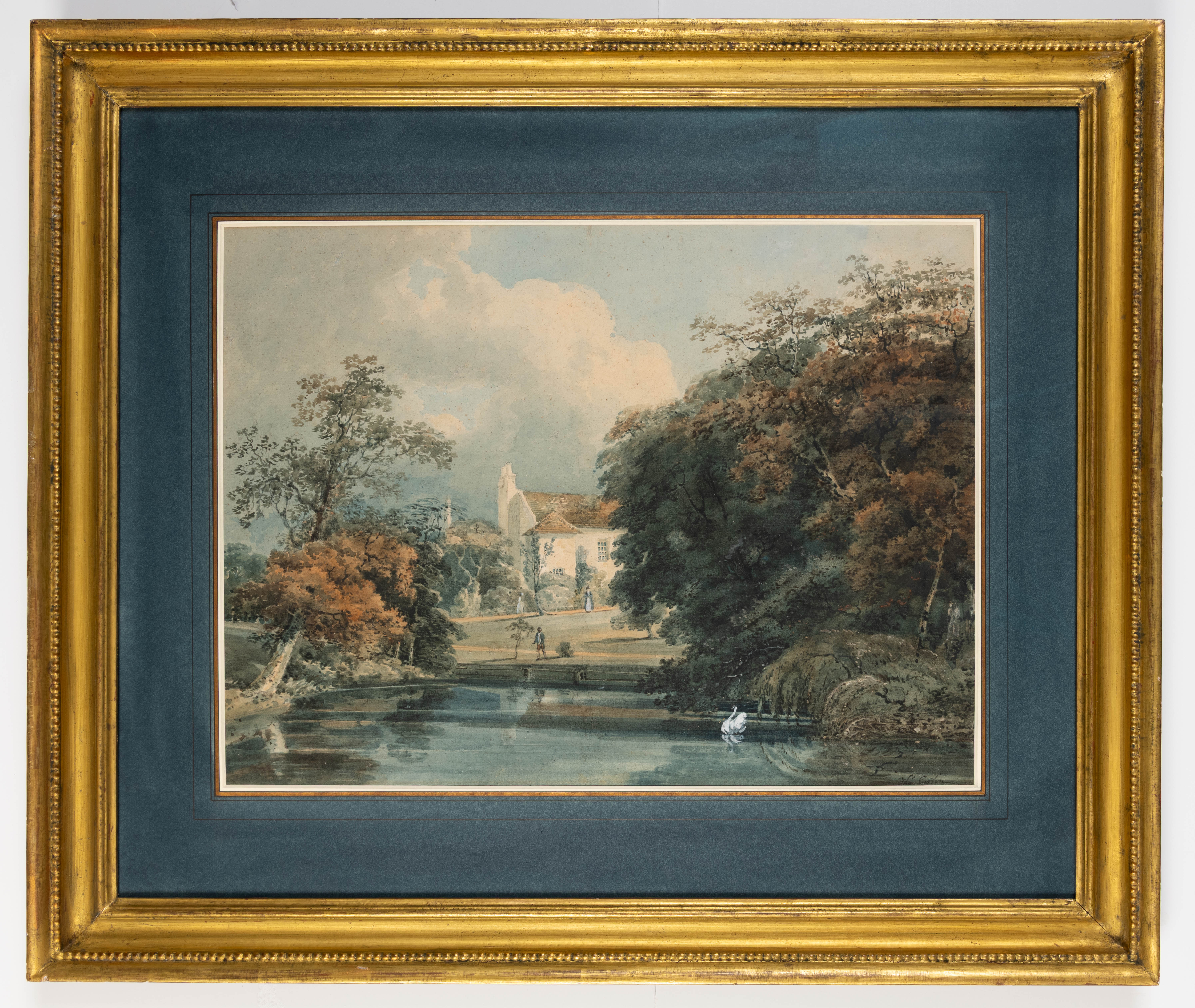 Datable to around 1800, this fine watercolour is one of a group of four large, finished views of the Chalfont estate in Buckinghamshire, commissioned from Thomas Girtin by its owner Thomas Hibbert (1744-1819). Hibbert had the artist produce two views of his seat at Chalfont House, which had been recently remodelled, as well as a pair of views of the newly-built Chalfont Lodge on the estate. The first two watercolours, depicting Chalfont House from the Northeast, with Fishermen Netting the Broadwater and Chalfont House from the Northwest, are both in a private collection in Herefordshire, while the pendant to the present sheet, depicting The South Front of Chalfont Lodge, is today in the Birmingham Museum and Art Gallery.