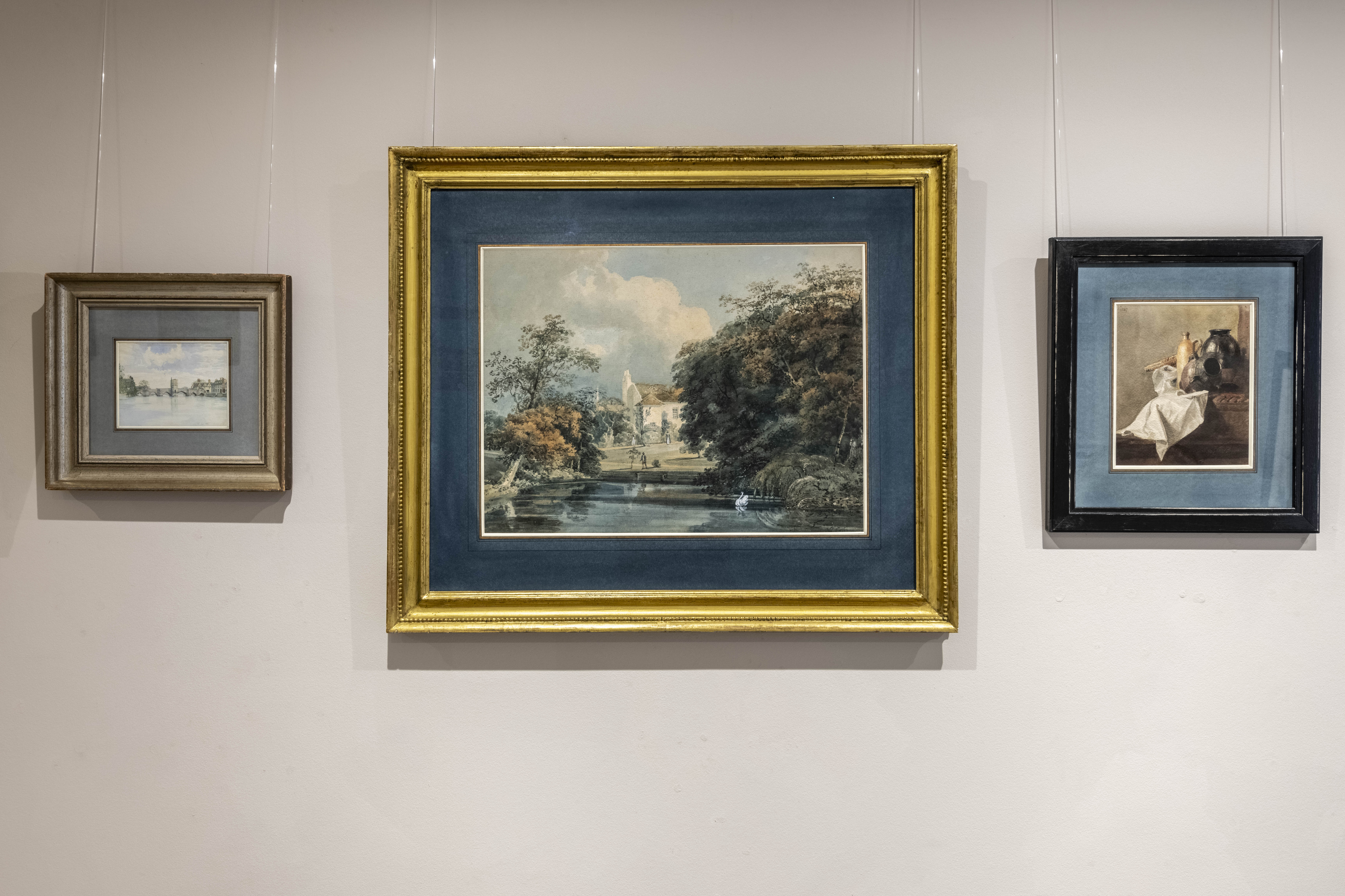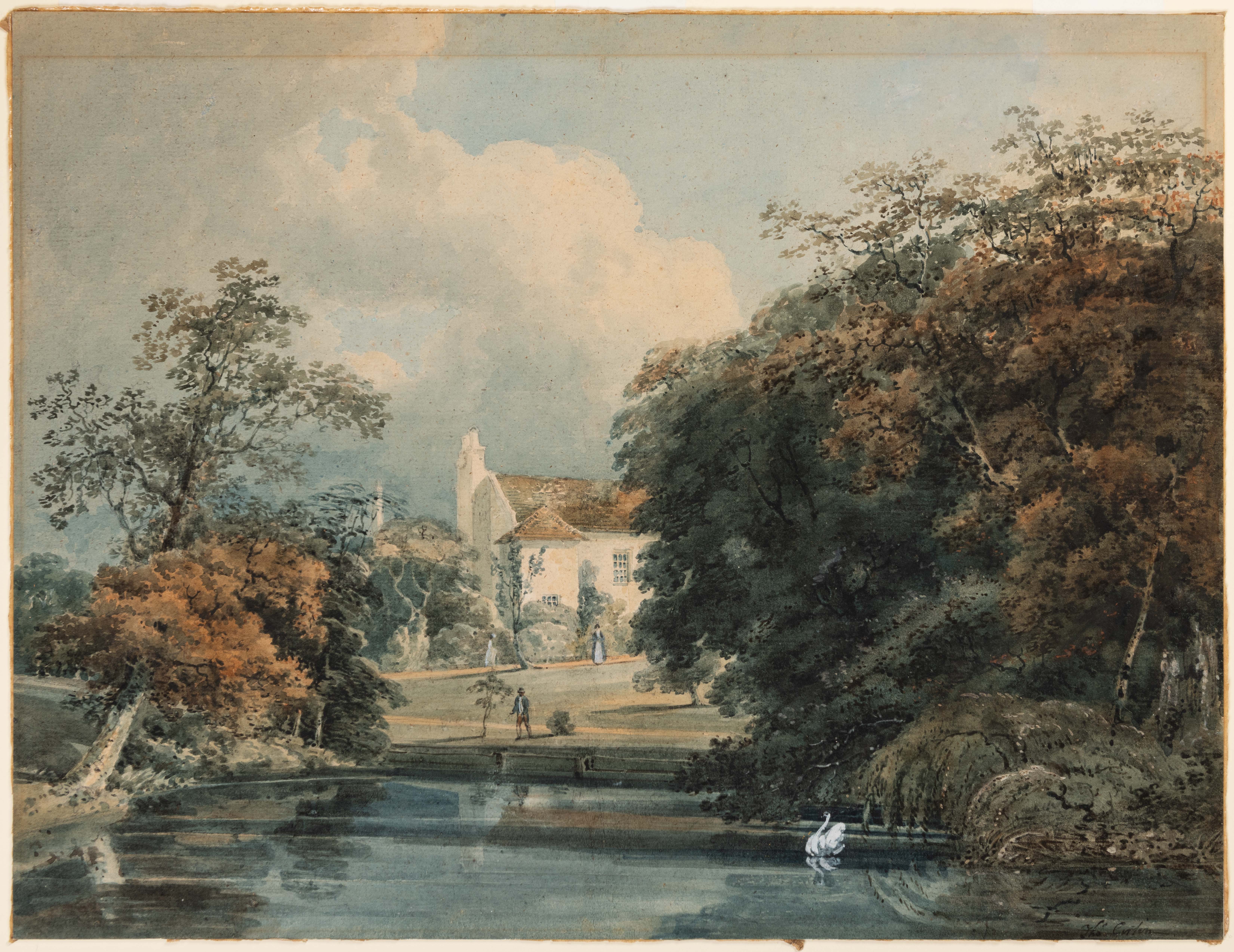 The present sheet, drawn on Girtin’s preferred heavy cartridge paper and in remarkably fine and fresh condition, depicts Chalfont Lodge, a Gothic cottage built by John Nash around 1799 for Thomas Hibbert’s younger brother Robert. Since demolished, Chalfont Lodge was situated atop a hill several hundred metres to the northeast of the main house and was built to harmonize with the existing landscape of the estate, with its own ornamental lake and kitchen garden. Robert Hibbert lived at Chalfont Lodge until 1819, when he inherited the estate upon the death of his elder brother Thomas that year. As noted above, Girtin painted a pendant view of the south front of the Lodge, which is now in the Birmingham Museum and Art Gallery. He also painted a smaller watercolour of The South Front of Chalfont Lodge, probably commissioned by Robert Hibbert, which is today is in the Paul Mellon collection at the Yale Center for British Art in New Haven.