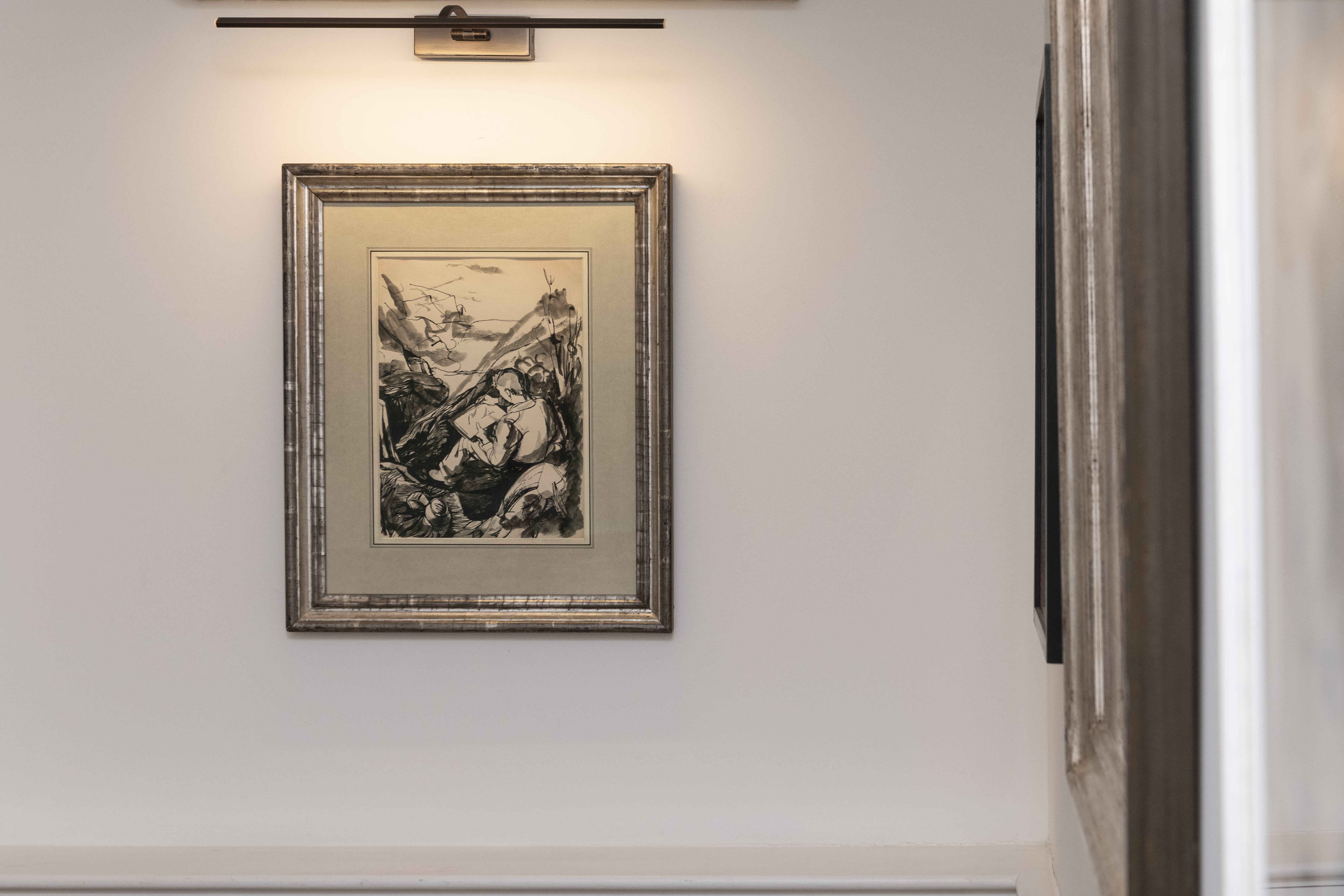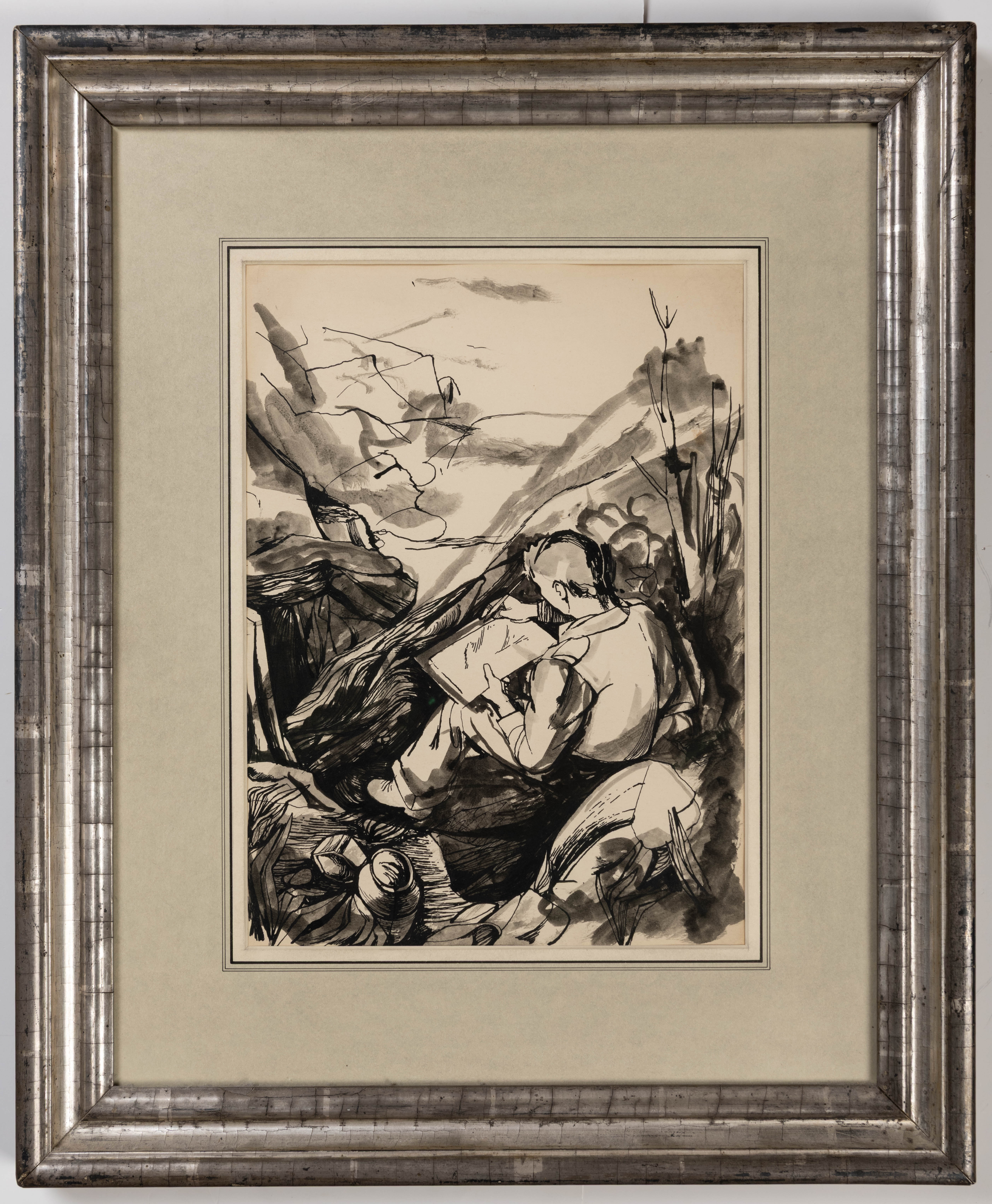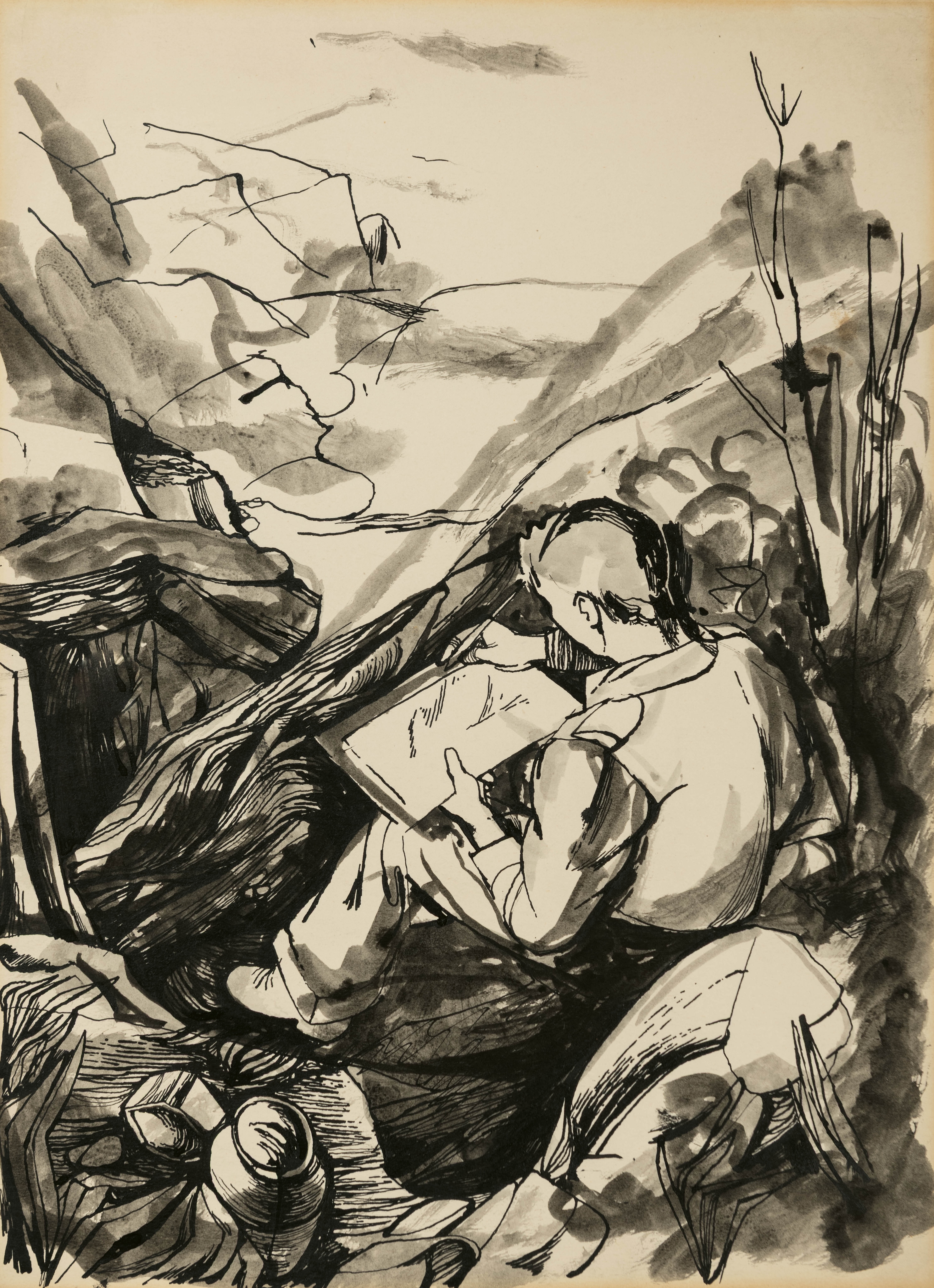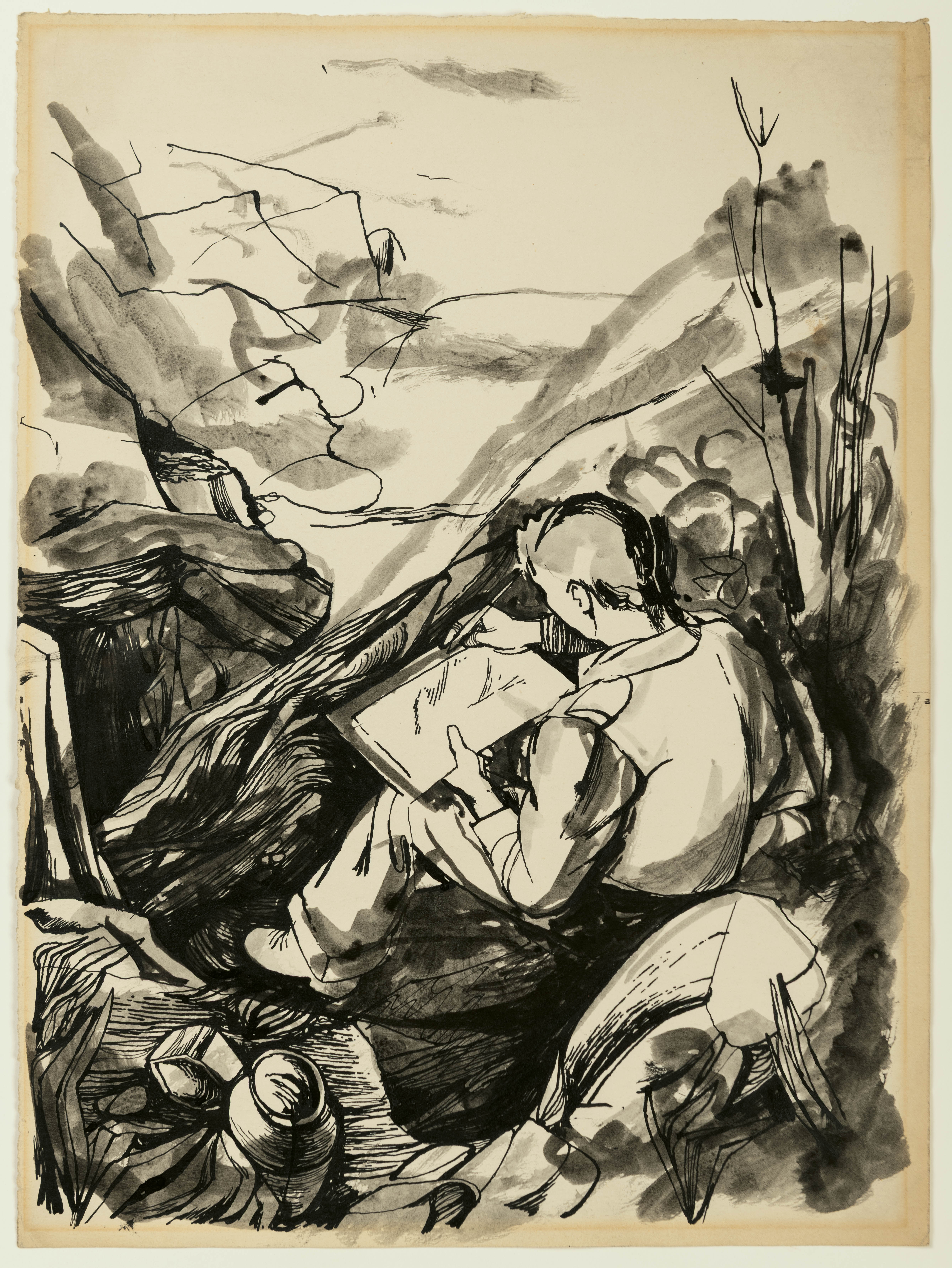 As John Minton’s biographer has written, ‘As a lyrical draughtsman, with the skill and dash of a latter-day Tiepolo, he produced a steady flow of illustrations, for books, magazines and advertisements, with a decorative talent second to none of his generation.’ The present sheet has been related to Minton’s illustrations for the travel book Time Was Away: A Notebook in Corsica, written by the poet Alan Ross and published in 1948, although this image does not appear in the book and may have been an unused drawing for the project. Certainly, the landscape in this drawing is akin to the monochrome illustrations in Time Was Away, as is the handling of the pen and ink medium. Time Was Away was commissioned by the publisher John Lehmann, who dispatched Minton and Ross to Corsica with instructions to travel around the island and ‘come back with a book’. The ninety-five illustrations that Minton produced represent arguably his finest work as an illustrator, and indeed Time Was Awayhas been described as ‘one of the most significant illustrated books of the twentieth century.’