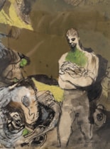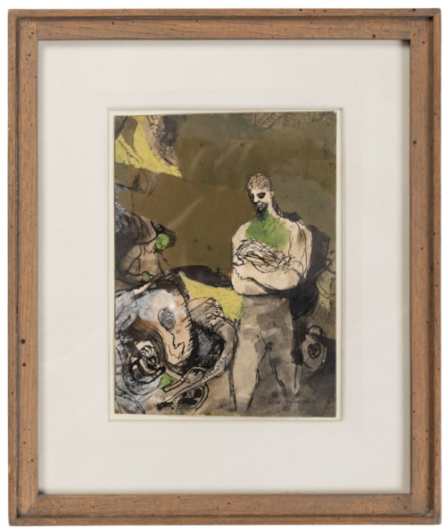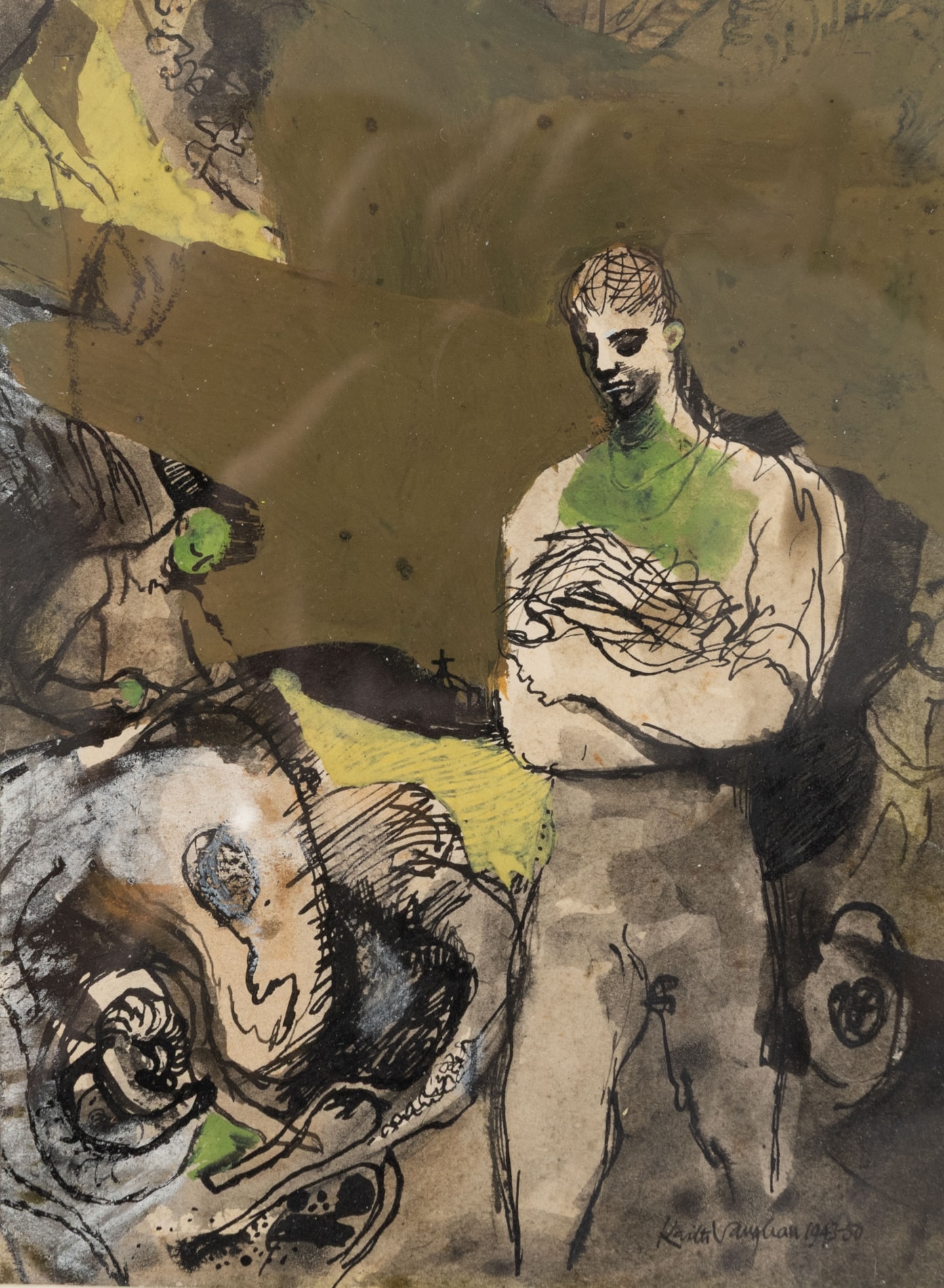 While serving in the Non-Combatant Corps during the Second World War, and since there was a limited range of media that could be carried in a regulation army knapsack, Keith Vaughan became adept at working in the graphic mediums of Indian ink, pencil, crayon and gouache; the latter usually in dark military colours of green and ochre, which are also often found in his postwar work. While serving in the NCC during the Second World War, and since there was a limited range of media that could be carried in a regulation army knapsack, Vaughan became adept at expressing himself through the graphic mediums of Indian ink, pencil, crayon and gouache; the latter usually in dark military colours of green and ochre.