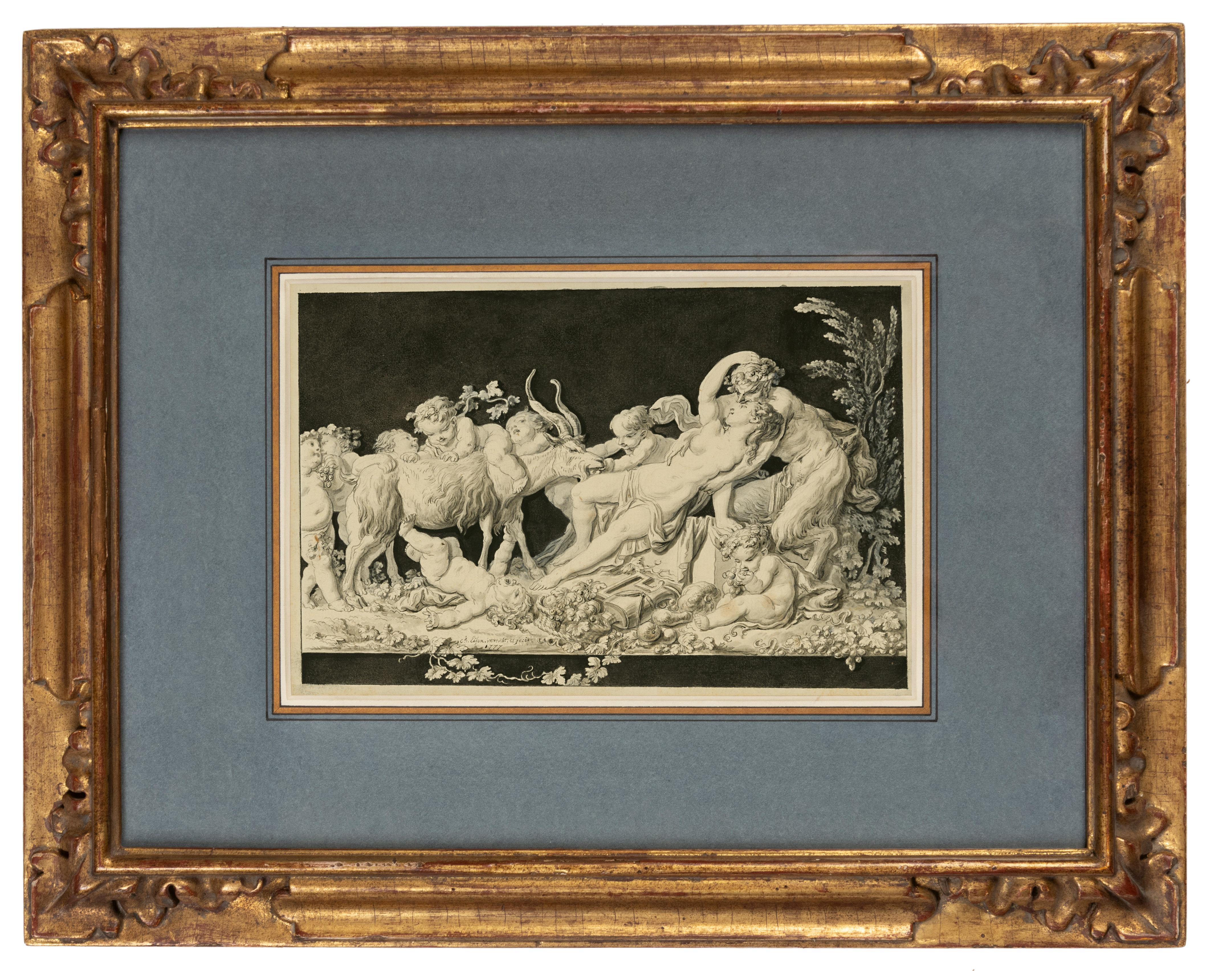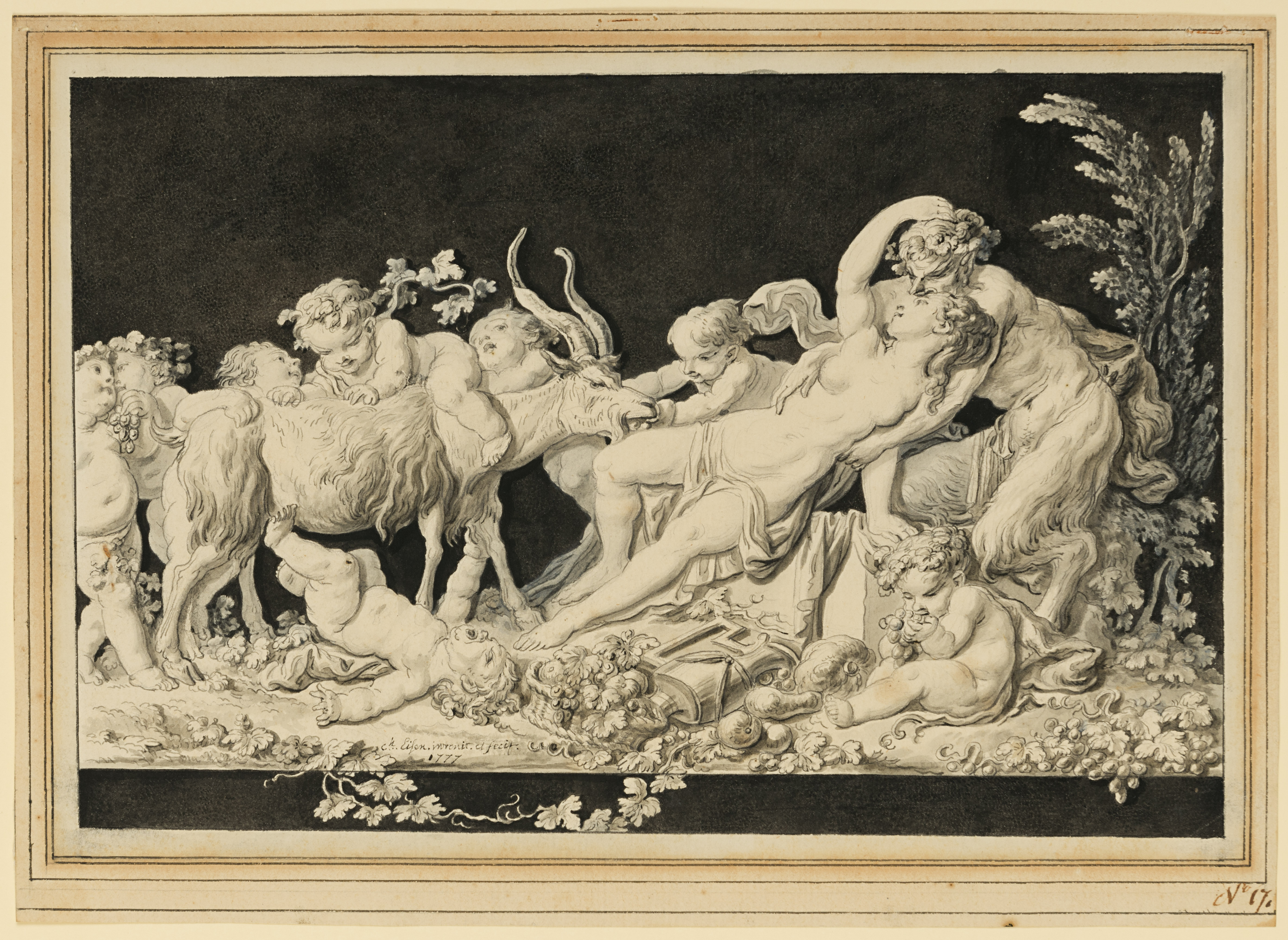 Apart from his work as an illustrator, Eisen was also known for his finished drawings of allegorical and mythological subjects. Drawn in 1777, the year that Eisen settled in Brussels, this highly finished, signed and dated sheet is a very late work by the artist, who died a few days into the following year. Among stylistically comparable drawings by Eisen is an Allegory of the Fine Arts Paying Homage to Louis XV, signed and dated 1753, in the Fitzwilliam Museum in Cambridge and an Apollo Presiding over an Academy of Letters, signed and dated 1762, in the Courtauld Gallery in London.