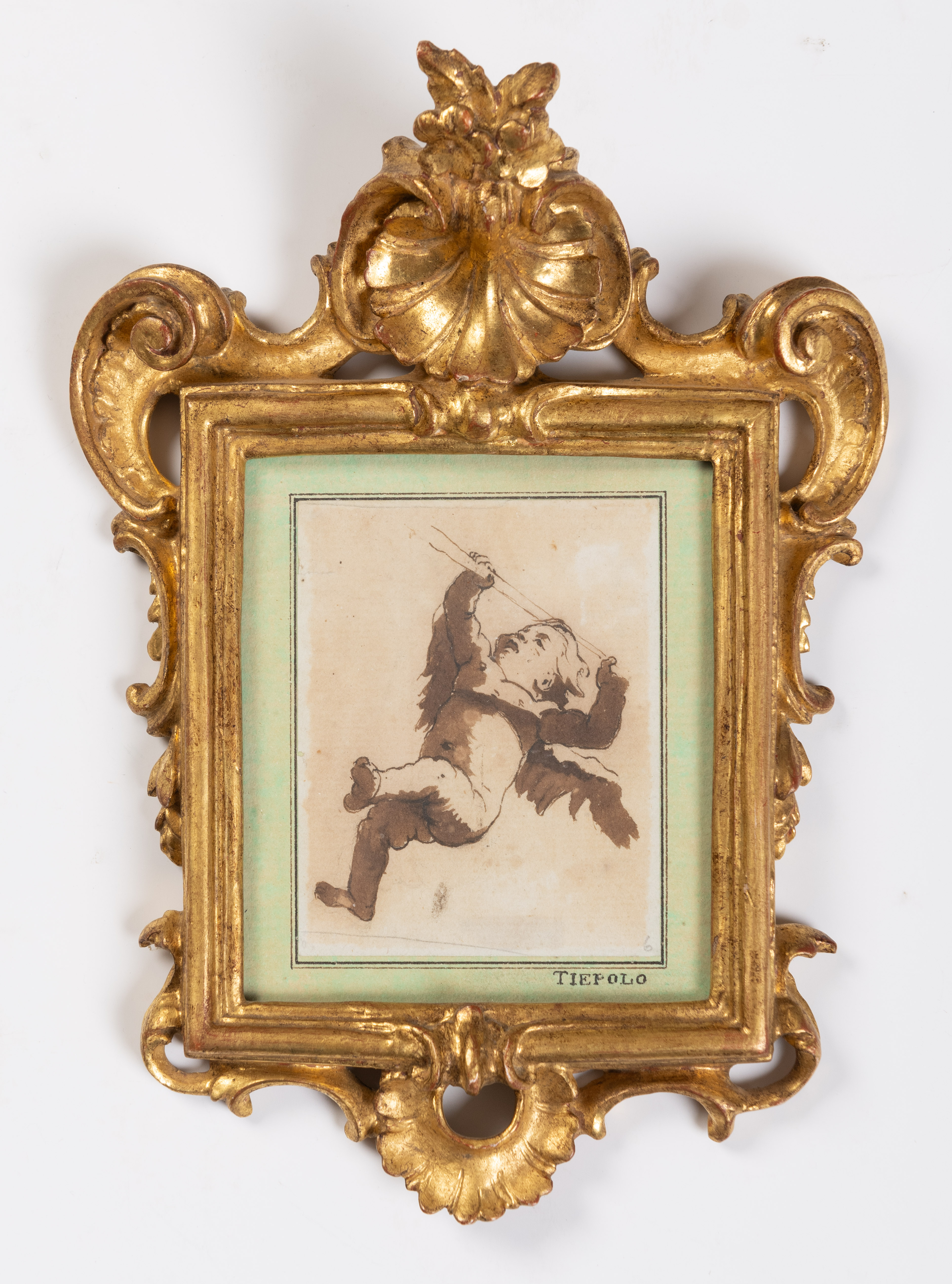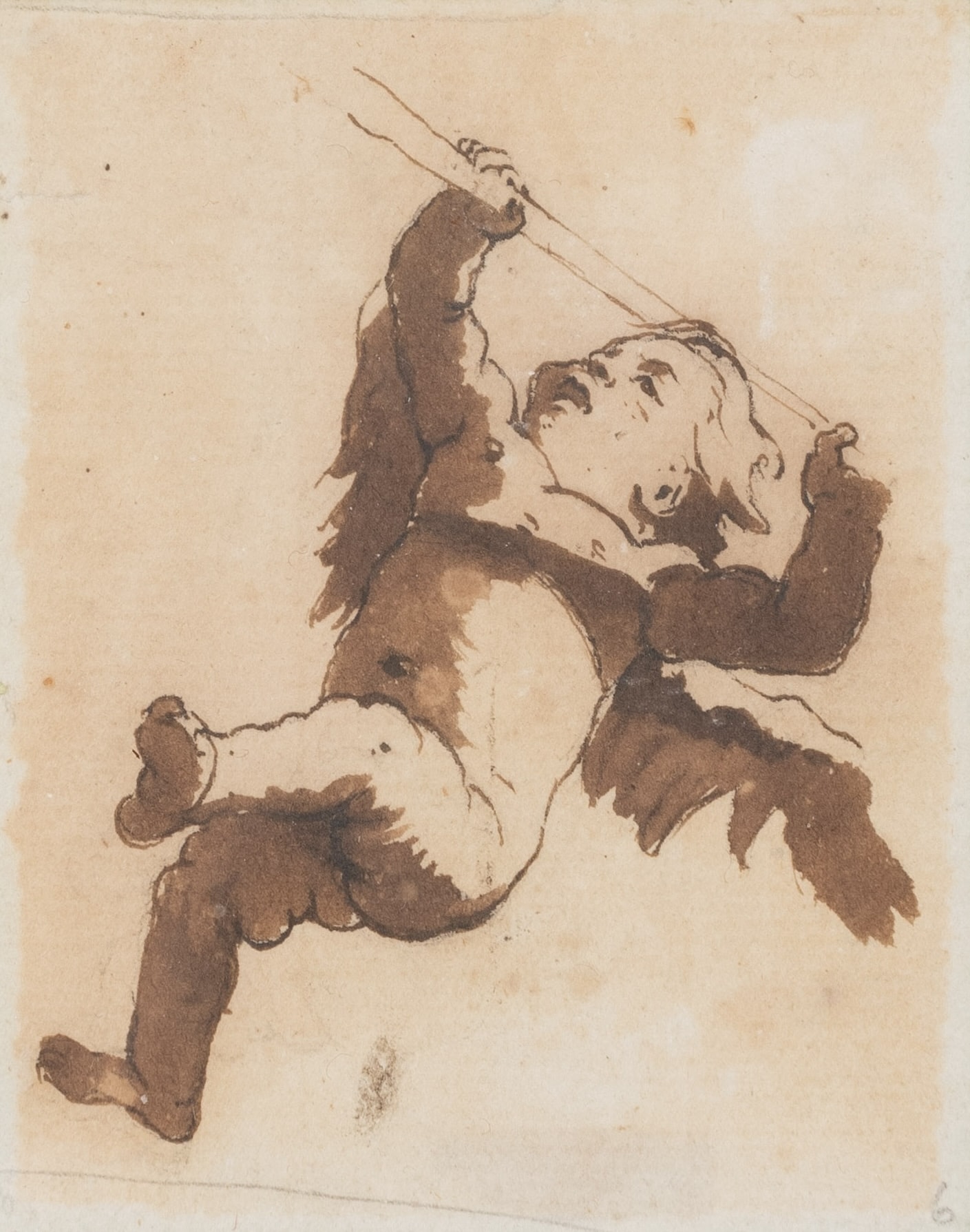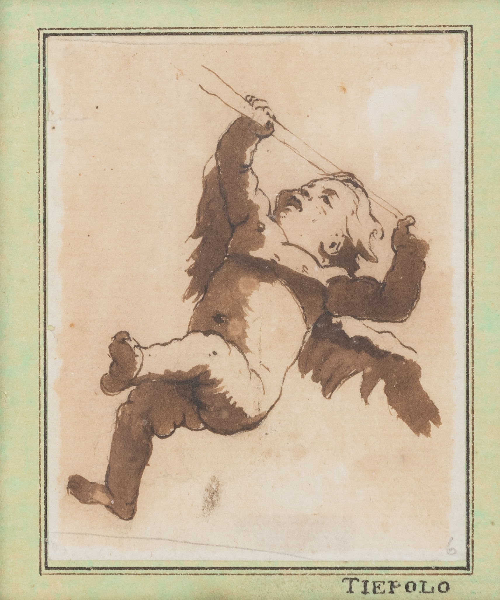 As Byam Shaw pointed out of Domenico’s drawings of this type, ‘it is sometimes hard to decide whether the flying cherubs are intended for the vision of a martyred saint or some other religious subject, or whether they are simply little creatures of the air cast for some secular or mythological allegory...It is difficult to see what Domenico’s purpose was in making so many drawings of such subjects – drawings that often bear contemporary numbers, like those of his other series...His ability to vary the composition and the individual figures, without ever (so far as I can discover) exactly repeating himself, is astonishing. Perhaps he was simply displaying his virtuosity, like a pianist improvising on his instrument. I cannot find that any of the drawings were directly used for paintings with Cupids and cherubs…Nor can I with confidence suggest any but an approximate date – that is, after Domenico’s return from Spain in 1770, when he turned more and more to drawing for its own sake.’