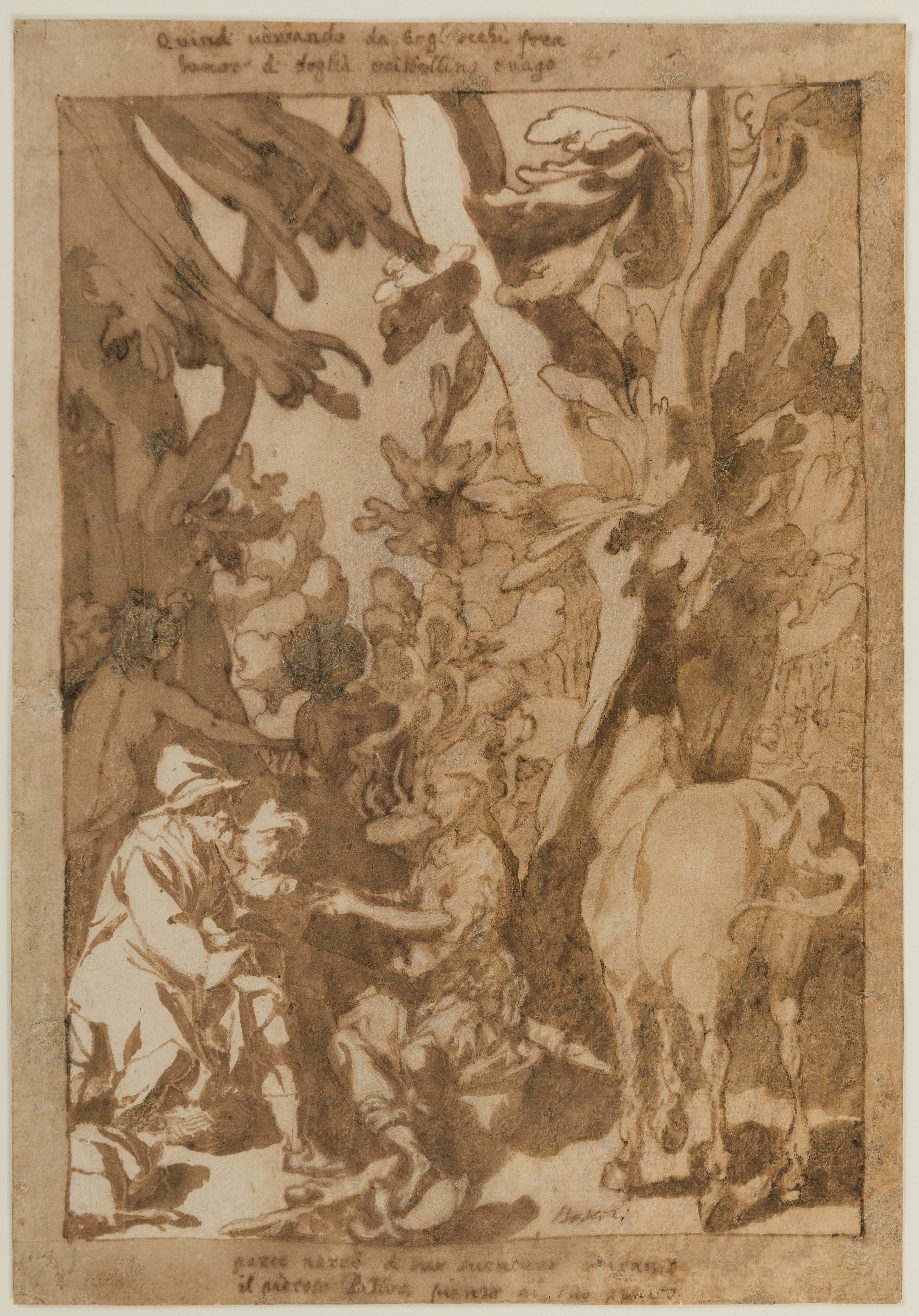 The four drawings by Boscoli devoted to the story of the Muslim princess Erminia are particularly interesting from an iconographical perspective, since they represent one of the first visual depictions of the tale of Erminia and the shepherds, an episode which experienced much popularity throughout the 17th century. Previous visual translations of this episode are known in works by artists such as Santi di Tito, Ludovico Carracci and Bernardo Castello. However, Boscoli’s version betrays the artist’s interest in the realistic depiction of rural life: the artist, in fact, chooses to focus mainly on the dramatic and romantic aspects of the tale of Erminia.