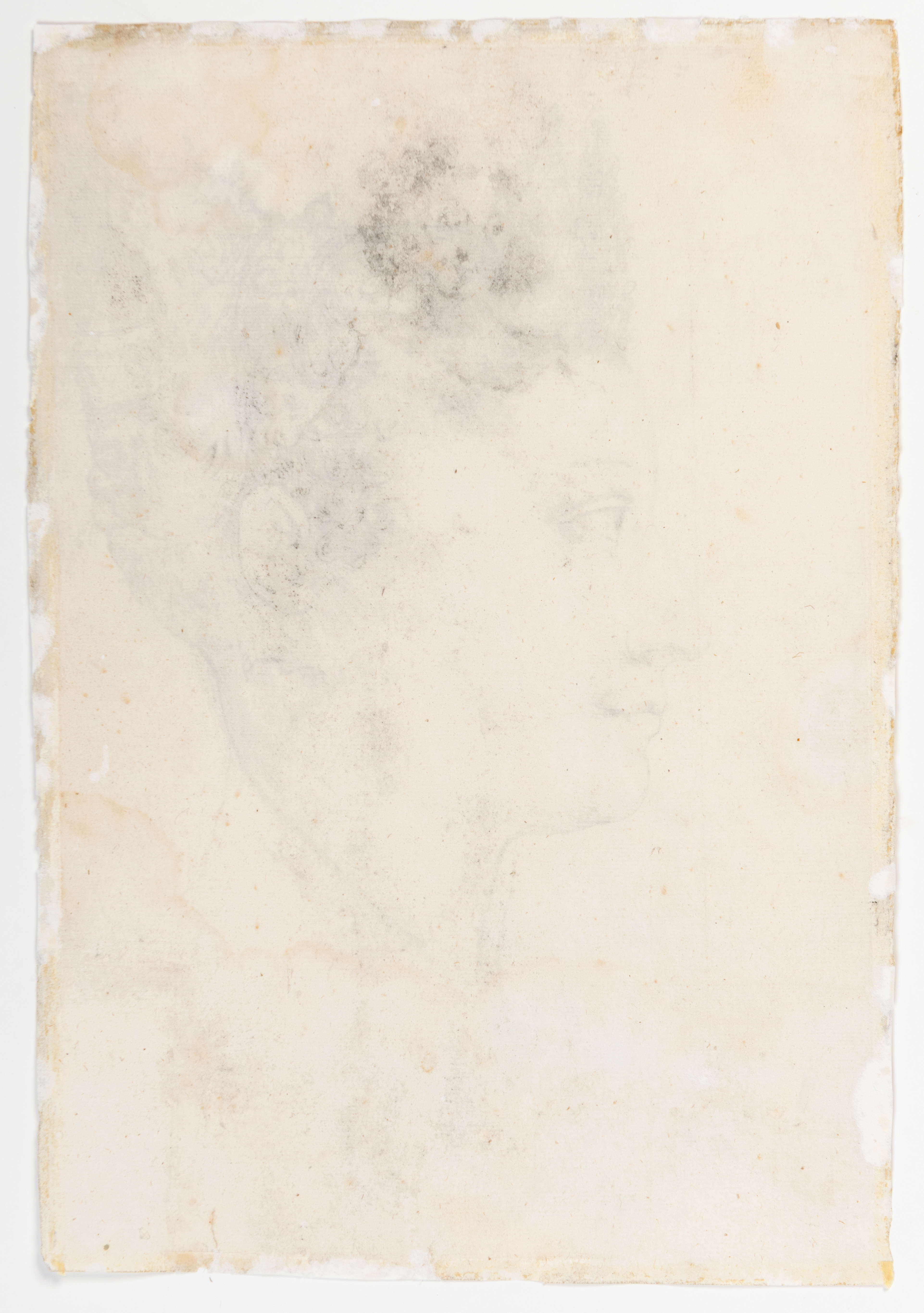 A small sketch of the head and shoulders of a woman drawn in black chalk on the verso.