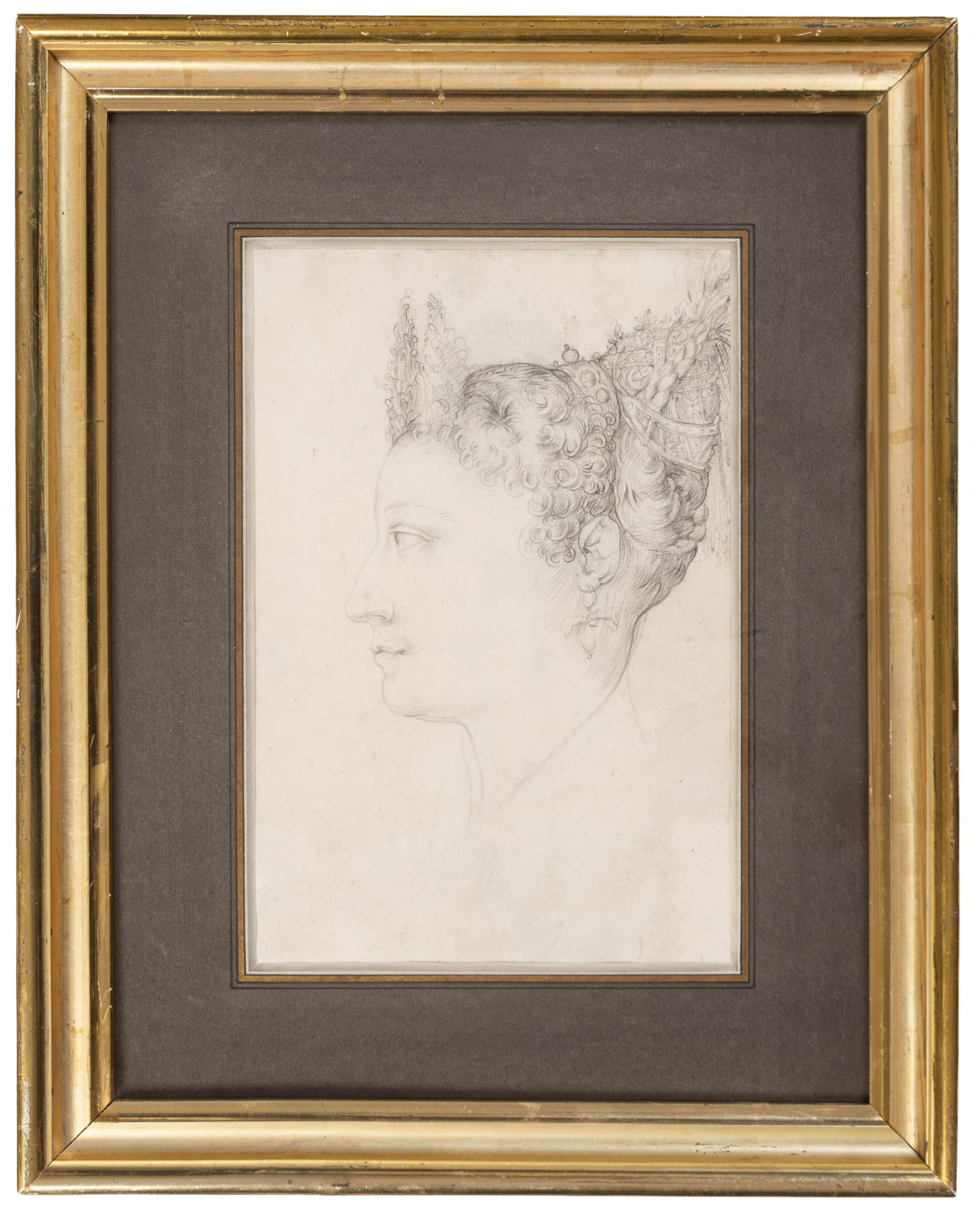 Paintings and drawings of ideal heads, or teste divine as Vasari called them, were particularly popular in Florentine art and found its greatest exponent in Michelangelo. As Paul Joannides has noted, ‘In different forms the ideal head was, for some two decades, an important and highly influential means of expression for Michelangelo. Although he did not invent the genre, he exploited it more fully and with greater imagination than any of his forerunners, and it was predominantly his example that affected later artists.’ Such drawings were usually drawn in either black or red chalk or pen and ink as well as, occasionally, metalpoint, and were typically studies of women adorned with fantastic and elaborate all’antica hairstyles, often seen in strict profile. This tradition continued well into the 16th century in Florence, as exemplified by, for instance, the pen and ink heads of women by Jacopo Ligozzi and similar studies in chalk by Francesco Salviati.