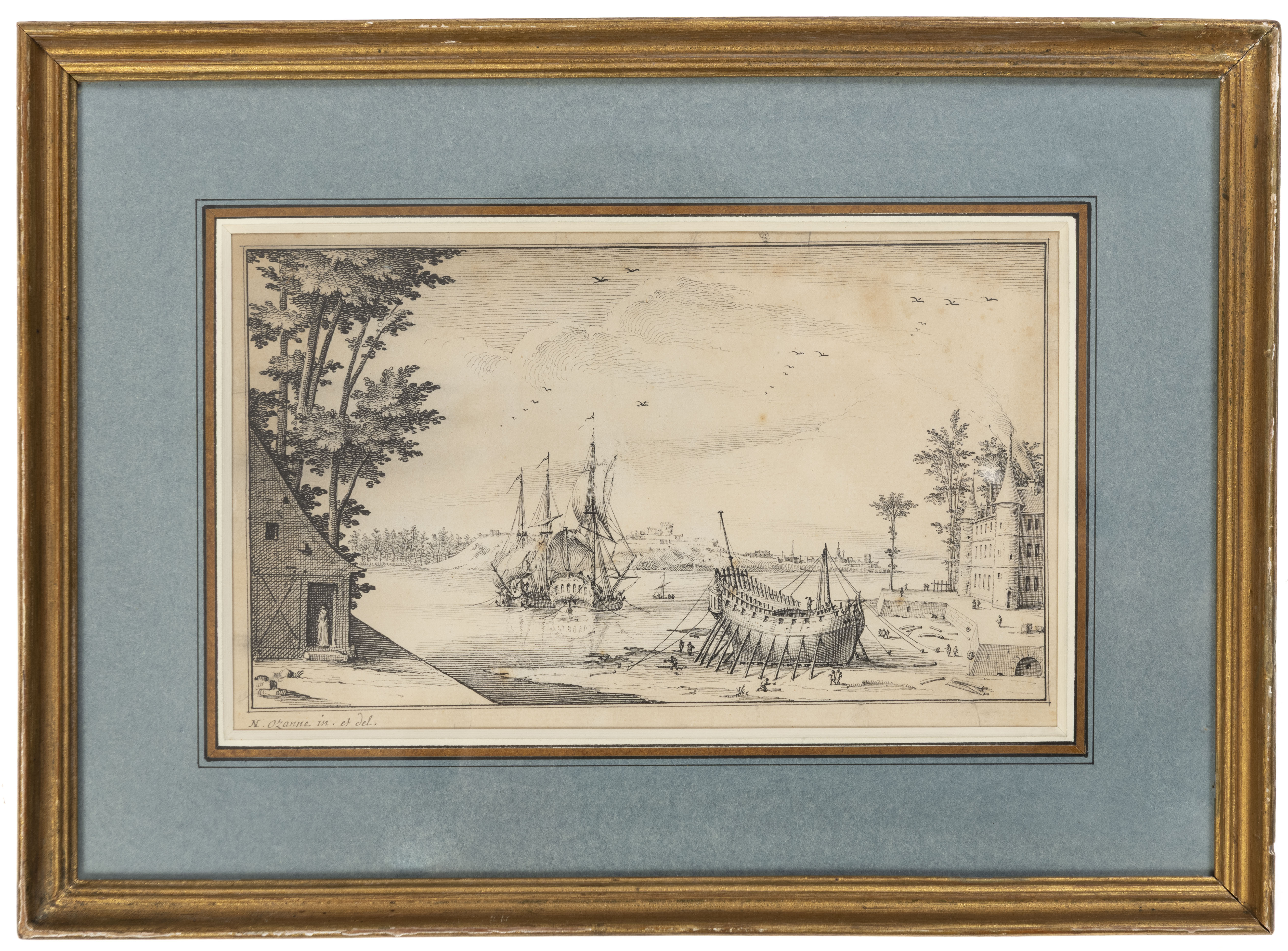 From a young age, Nicolas Ozanne displayed a remarkable talent for observation and accurate technical reconstruction of naval vessels. He was apprenticed to a naval engineer in his hometown, the port city of Brest, and as a result enjoyed a thorough understanding of ships and naval architecture that was made manifest in his work as a painter and engraver. In 1744 his father died and the sixteen-year-old Nicolas took it upon himself to guide his brothers and sisters toward the study of fine arts, particularly in the field of printmaking. The Ozanne family would become a prominent artistic household, made up of draughtsmen and engravers dedicated to the Navy. The young Ozanne was commissioned by King Louis XV to record his visit to Le Havre in 1749, and in the succeeding decade he assisted Claude-Joseph Vernet in his great series of paintings of the ports of France, commissioned by the King in 1753. In 1751 Ozanne settled in Paris when he was appointed dessinateur de la marine, royal draughtsman for the Naval Department and tasked with working on views produced during Louis XV’s great voyage to Le Havre a few years earlier. Between Paris and Versailles, Ozanne also devoted himself to the nautical instruction of the Dauphin of France and his brothers.