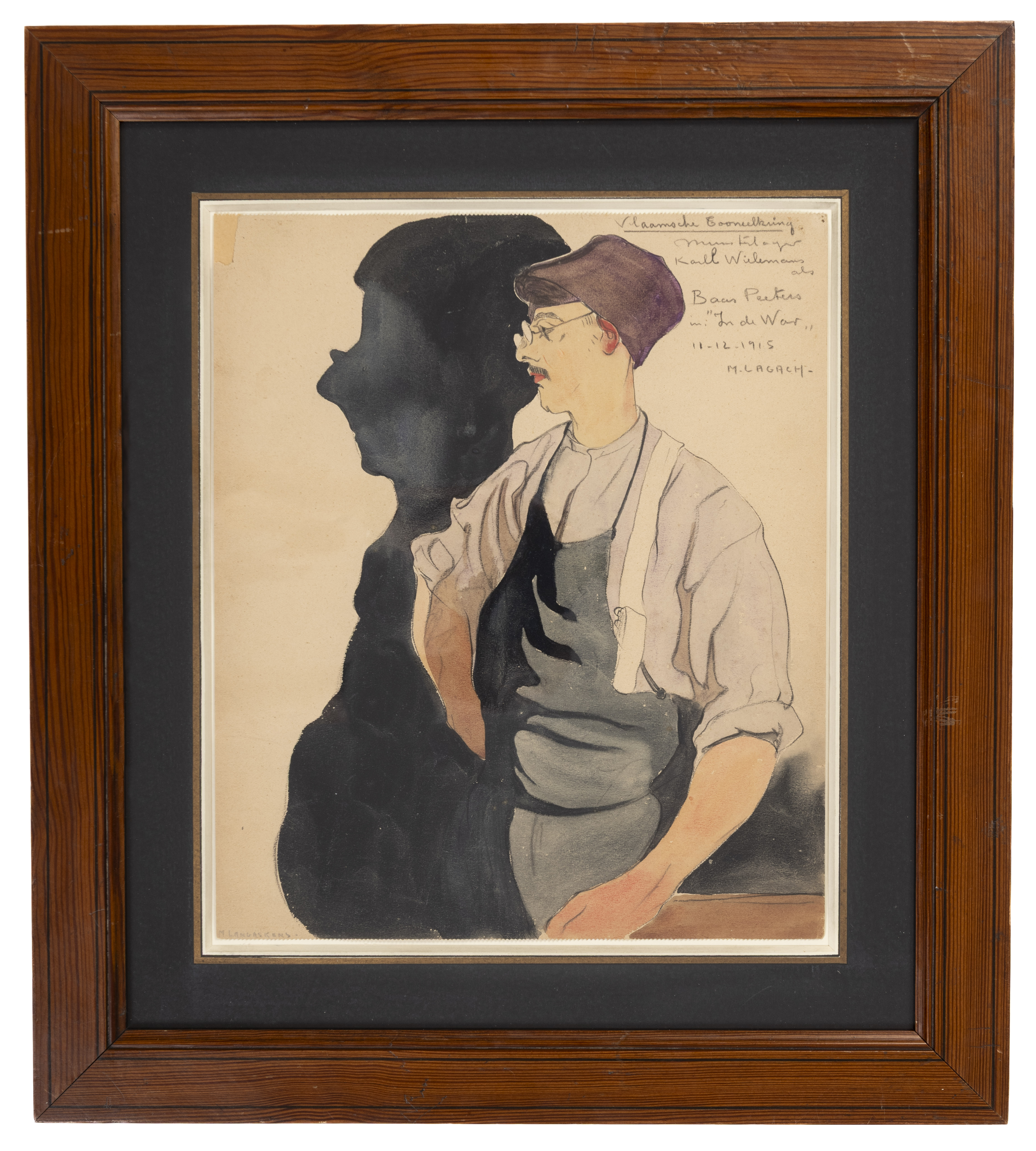 During his period of internment as a prisoner of war, Maurice Langaskens was able to continue working as an artist, and made numerous studies of his fellow prisoners and of camp life. Among the activities sanctioned by the Germans were musical and theatrical performances by the prisoners. The present sheet depicts a soldier-prisoner playing a role in one such theatrical production; a humorous play entitled, in Flemish, In de war (Confused) and performed at the Münsterlager camp on December 11th, 1915. Langaskens painted watercolour portraits of several other actors and performers in camp productions, which remained together as a group until their eventual dispersal at auction in Belgium in 2019. Another watercolour by Langaskens of a performer from the same production is in the collection of the In Flanders Fields Museum in Ypres.